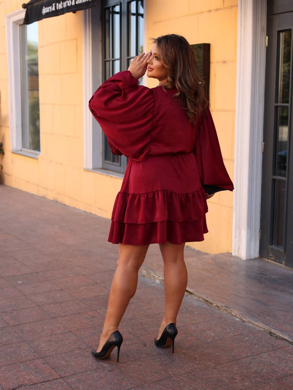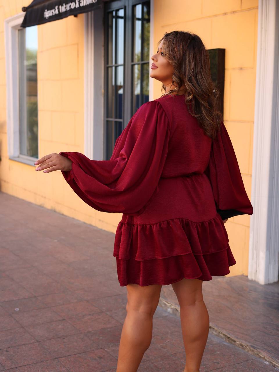 Платье короткое, выполнено из легкой, немного блестящей ткани. Свободный фасон, с акцентом на талии благодаря поясу-ленте. Длинные рукава, широкие, свободно спадающие, придавая образу романтичности и легкости. Сверху застежка на пуговицы спереди, придающая классической нотки. Юбка с двумя ярусами воланов, создающих объем и динамику.