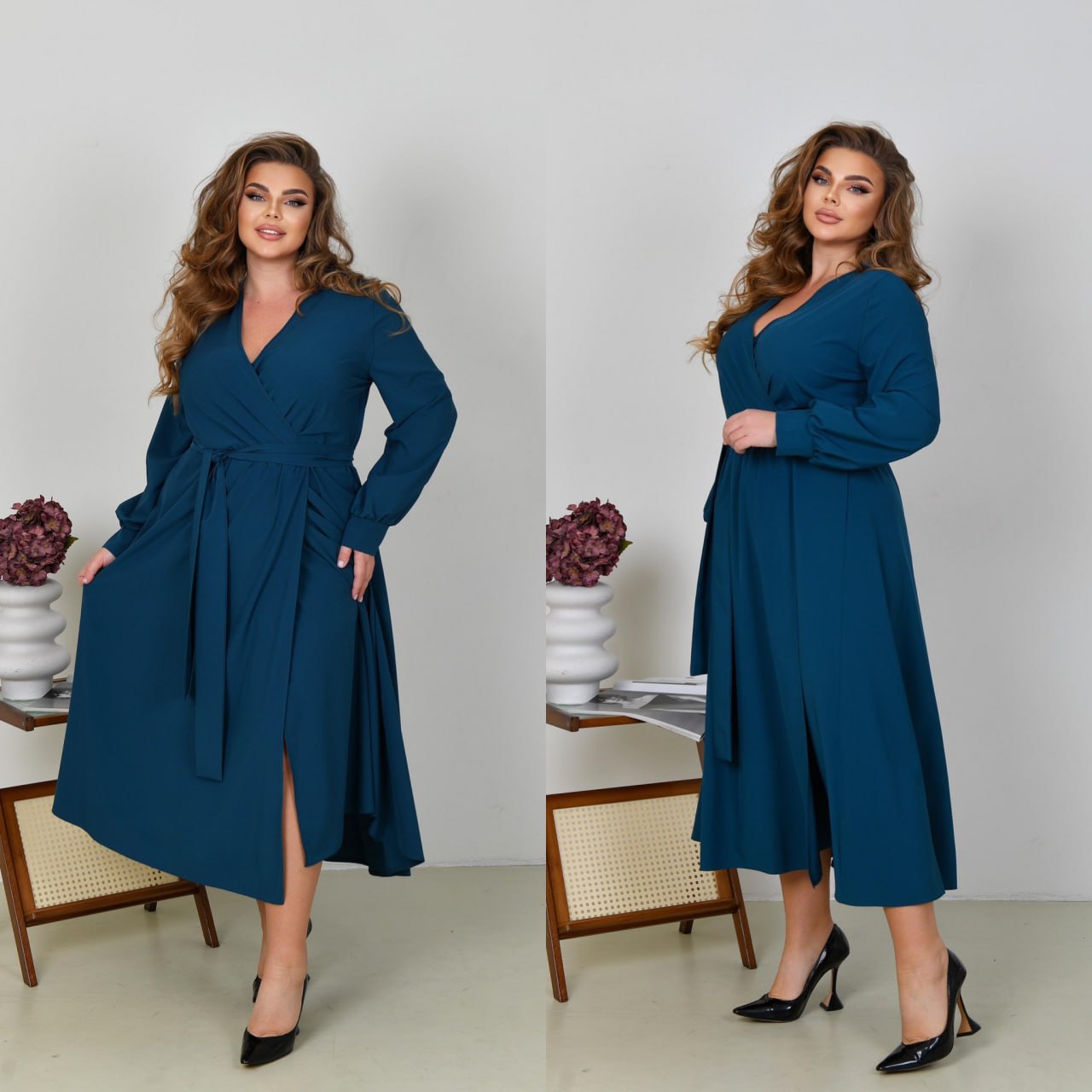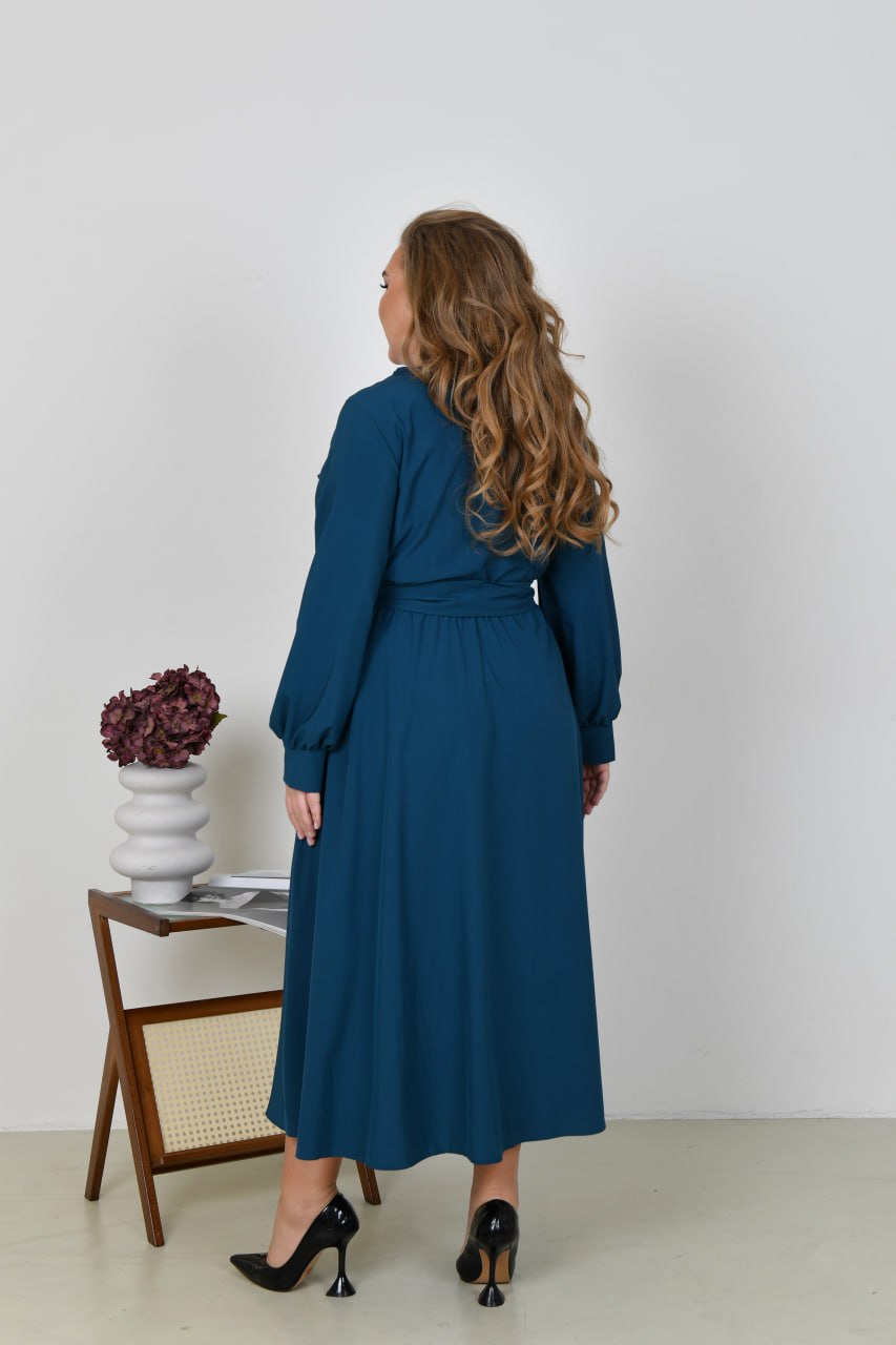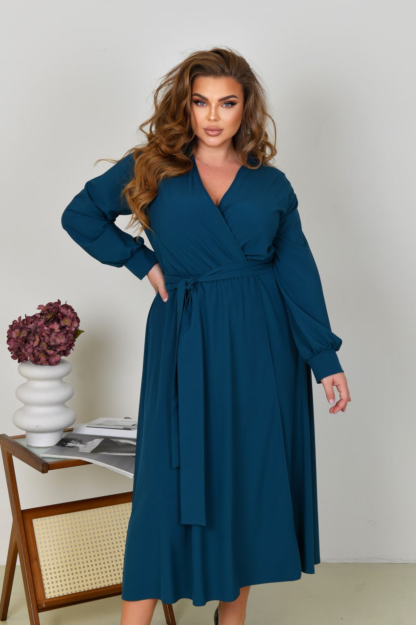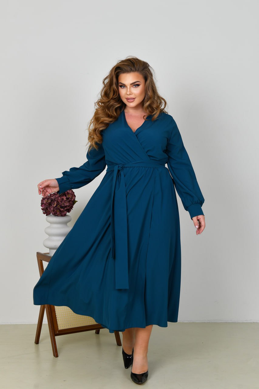 Невероятно женственное длинное платье в вечернем стиле из софта (растяжения нет). Лиф платья и юбка на запах, по талии собрана на резинку. Рукава длинные, на манжете. Пояс из основной ткани в комплекте. Карманов, застежек нет.