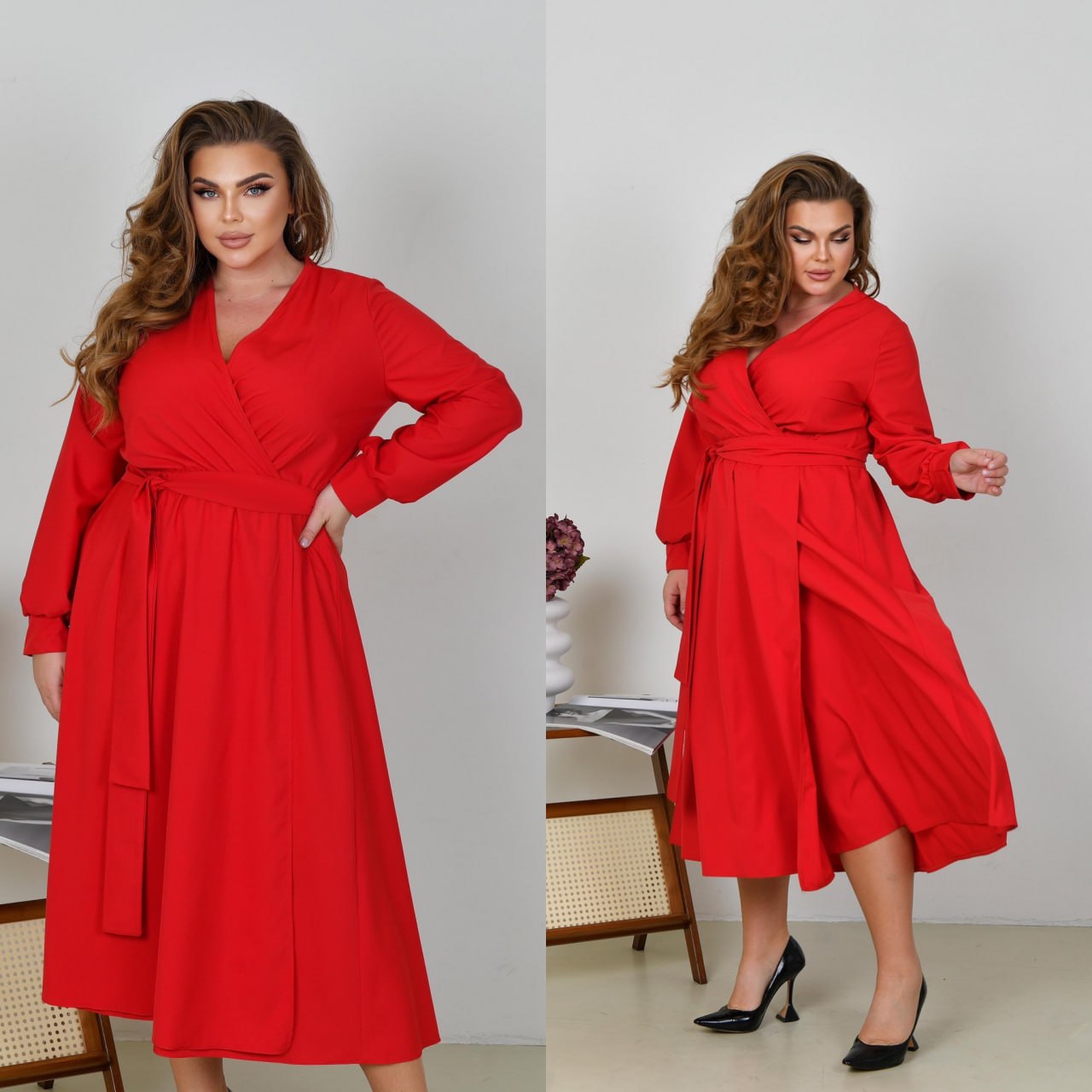 Невероятно женственное длинное платье в вечернем стиле из софта (растяжения нет). Лиф платья и юбка на запах, по талии собрана на резинку. Рукава длинные, на манжете. Пояс из основной ткани в комплекте. Карманов, застежек нет.