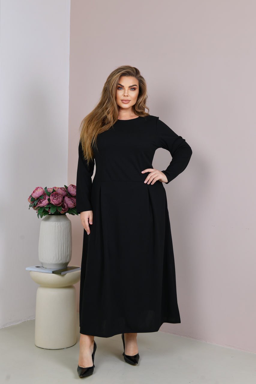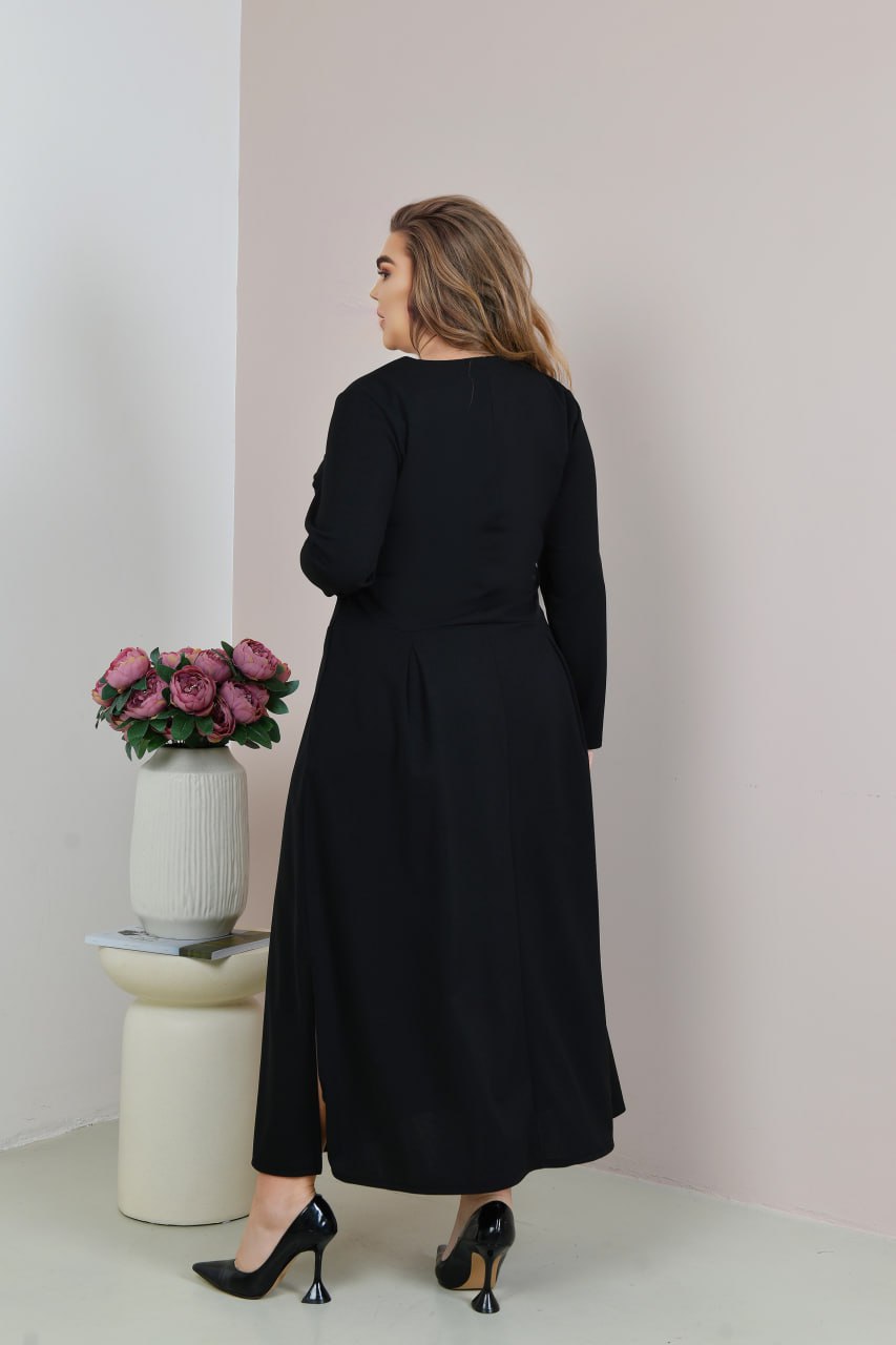 Силуэт платья длинный, полуприталенный. Вырез горловины круглый, рукава полной длины. Линия талии отрезная, немного заниженная, юбка с защипами, в боковых швах отделаны карманы. Застежки нет. Внизу по бокам разрезы, придающие образу женственности. Платье хорошо скрывает любые недостатки и делает силуэт более стройным. Идеально подойдет как для повседневных дел, так и по праздникам, если добавить аксессуаров.