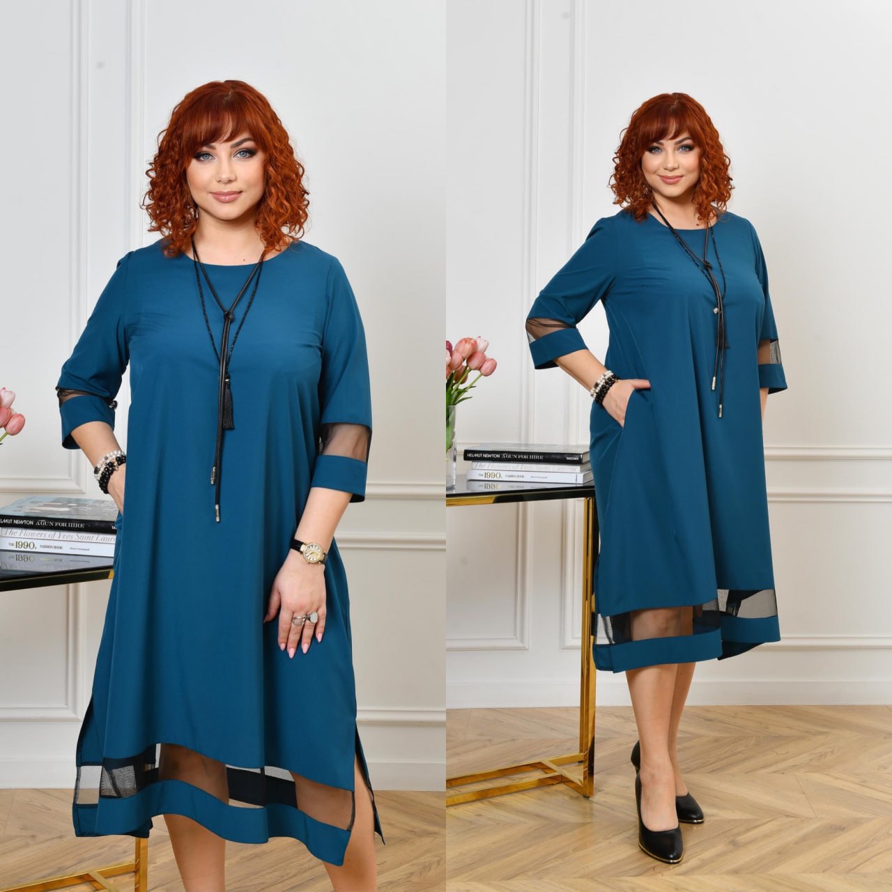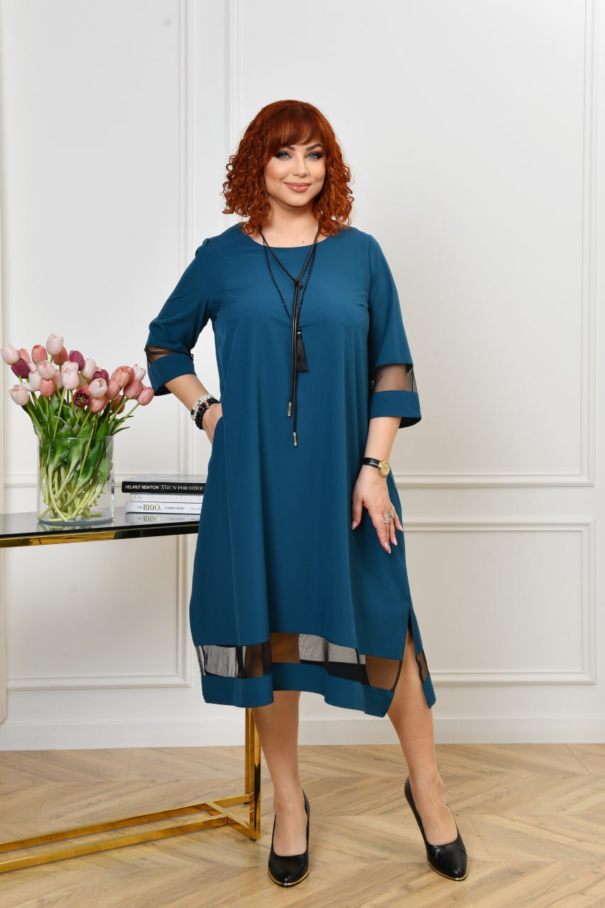Платье имеет А-образный силуэт и прекрасно скрывает любые недостатки фигуры. Вырез горловины круглый, рукав длиной 3/4. Низ платья и рукава имеют декоративные вставки из мягкой сеточки. По бокам внизу есть разрезы. В боковых швах обработаны карманы. Платье идеально подойдет как для праздников, так и каждый день.