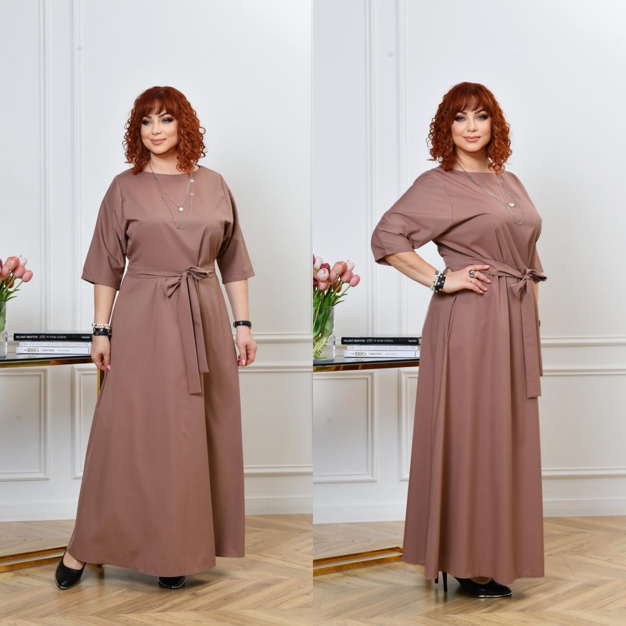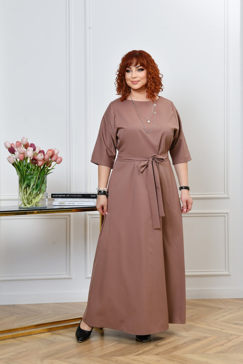 Платье имеет отрезную линию талии, верх силуэта «летучая мышь», рукав длиной по локоть. Вырез горловины круглый. Юбка в форме трапеции. В боковых швах обработаны карманы. Пояс из основной ткани в комплекте.