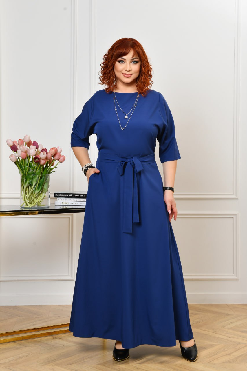 Платье имеет отрезную линию талии, верх силуэта «летучая мышь», рукав длиной по локоть. Вырез горловины круглый. Юбка в форме трапеции. В боковых швах обработаны карманы. Пояс из основной ткани в комплекте.