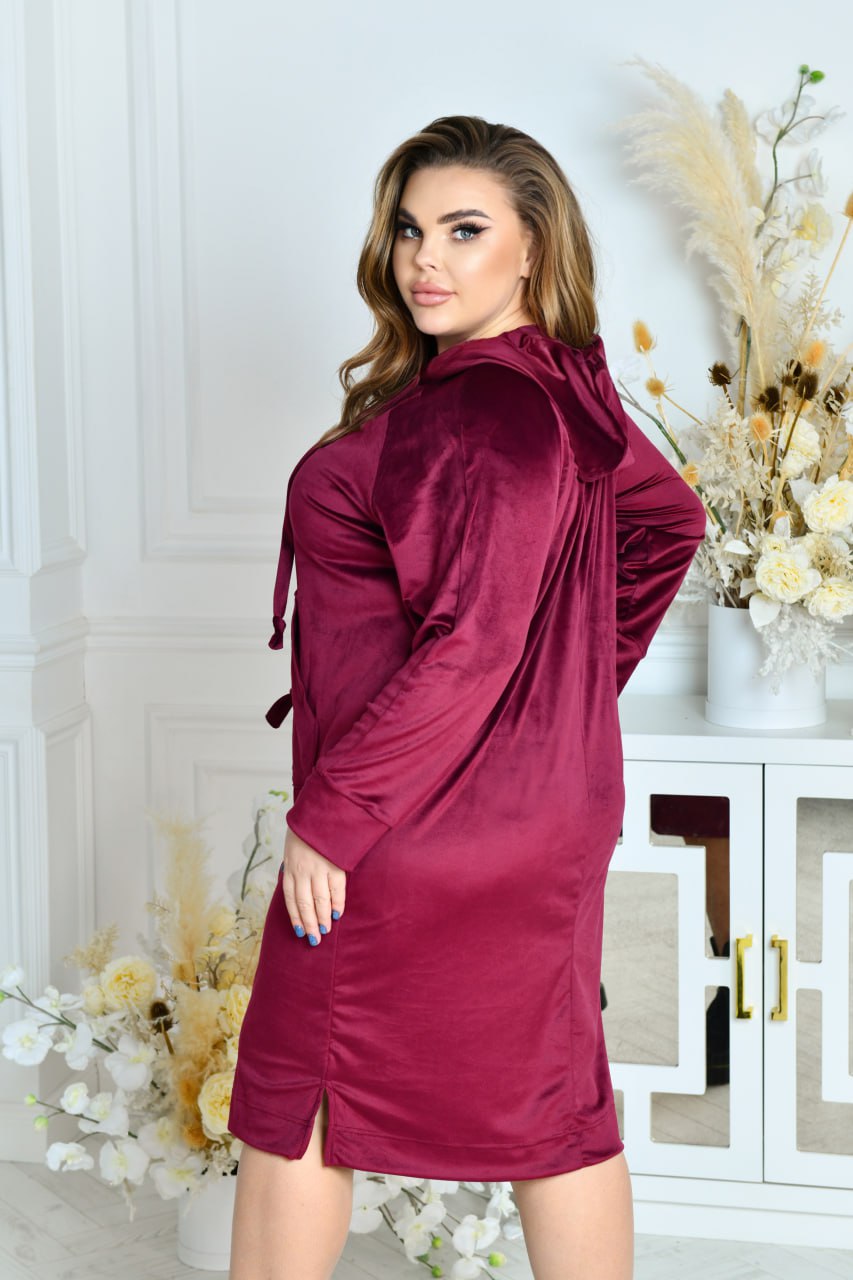 Невероятно комфортное платье в спортивном стиле из велюра (очень приятный на ощупь, хорошая растяжимость). В кулиске капюшона продет объемный шнурок из основного материала. Впереди короткая молния для удобного надевания. На передней полочке обработан карман «кенгуру». Внизу по бокам небольшие разрезы.