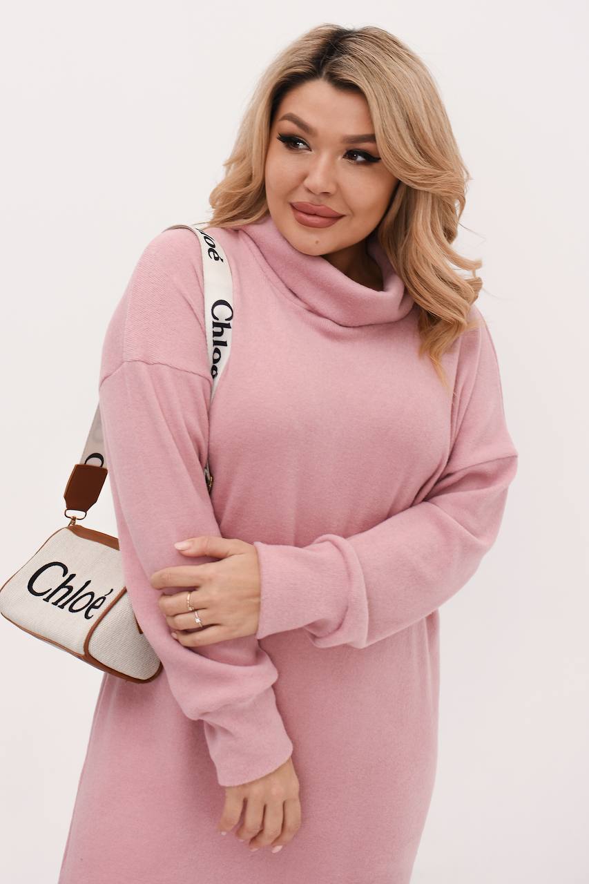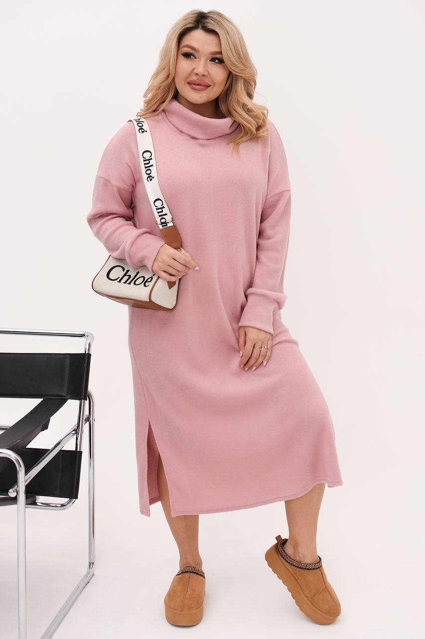 Стильное платье прямого кроя. Ткань трикотаж ангора, которая выглядит мягкой, уютной и теплой. Прямой свободный силуэт с длиной ниже колена. Высокий воротник придает элегантность и защищает от холода. По бокам есть глубокие разрезы, делающие образ женственным и динамичным.