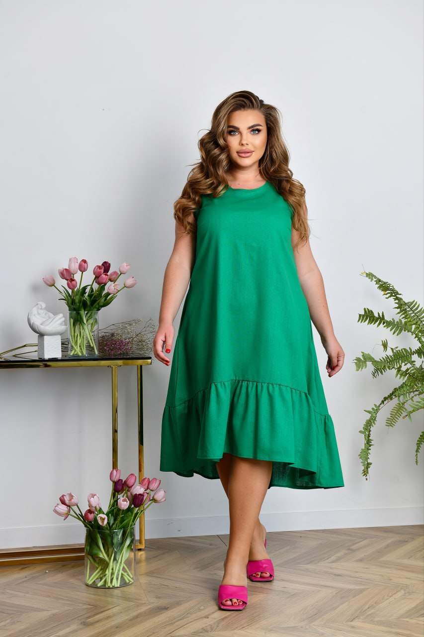 Стильный летний сарафан из натурального льна (средняя растяжимость). Сарафан имеет А-образный силуэт, низ декорирован воланом. Вырез горловины круглый. В боковых швах обработаны карманы. Застежек нет. Сарафан прекрасно маскирует все особенности фигуры, и визуально делает более стройным силуэт. Идеальный вариант на летние жаркие дни.