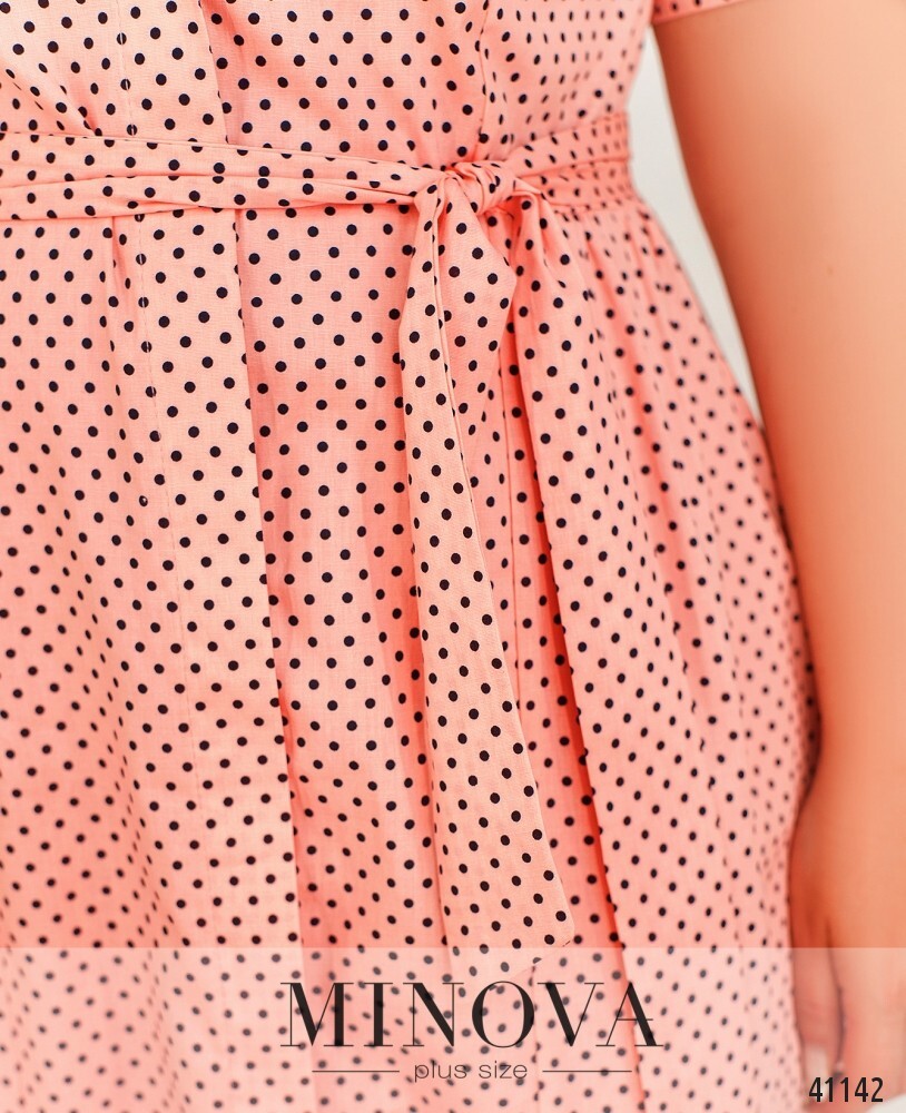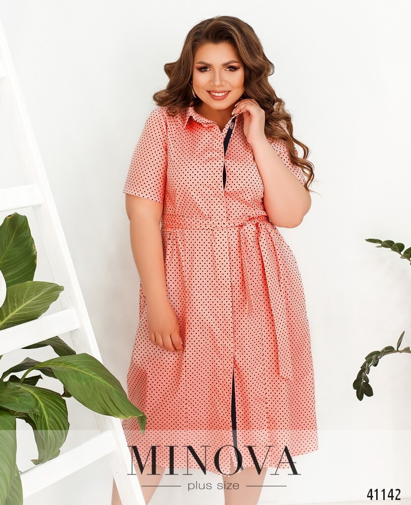 Изящное платье батал в мелкий горох, в комплекте - пояс. застёгивается на пуговицы спереди от отложного воротничка до низа. пуговицы прикрываются верхней планкой. по бокам - врезные карманы. подол присобран мягкими оборками от боков и по спинке. рукава без манжет.