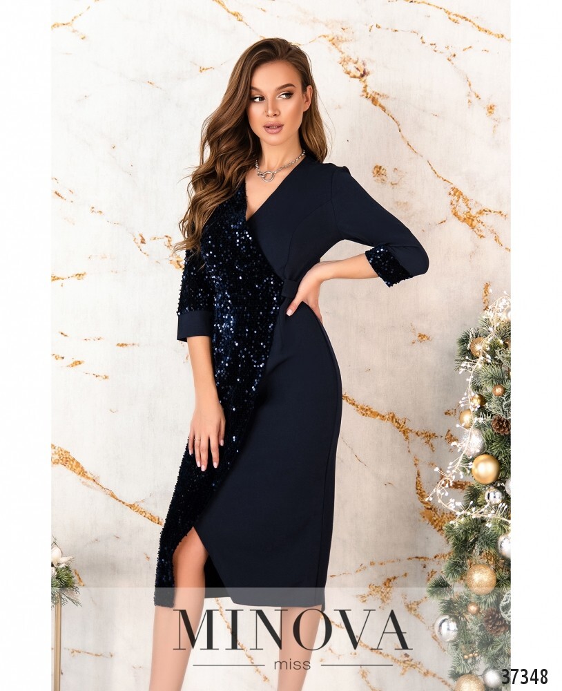 Приталенное нарядное платье. правая сторона украшена пайетками, рукав декорирован с двух сторон. левая сторона однотонная. на правом рукаве манжет однотонный, на левом – с пайетками. на талии вшит пояс, который завязывается сзади. верх и подол подшиты на запах. карманов нет. спинка без декора, с продольными вытачками и вшитой молнией.