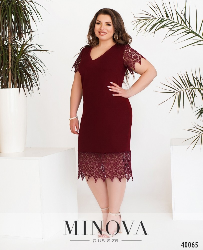 Нарядное коктейльное платье батал с ажурным кружевом на подоле и на рукавах. вырез горловины v-образный, неглубокий, карманов и застёжек нет. силуэт приталенный, на груди вытачки.