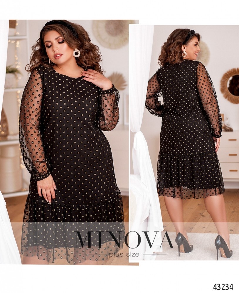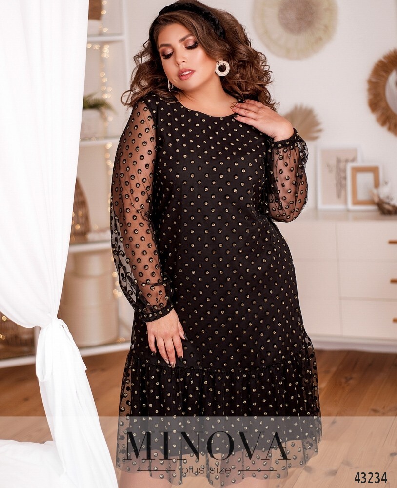 Яркое и романтичное платье батал а-силуэта, без застёжек и карманов. вырез горловины полукруглый. верхний слой - полупрозрачный, с блёстками, на подоле - оборки. нижний слой мягкий, приятный к телу. рукава без подкладки, на запястьях вшиты резинки. на груди вытачки.