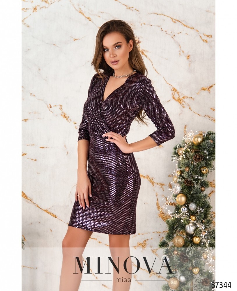 Нарядное коктейльное платье приталенного силуэта. украшено пайетками по всей поверхности. рукава без манжет. верх подшит на запах, подол цельный, подшит к верху. карманов нет. застёжка – потайная молния на спине.
