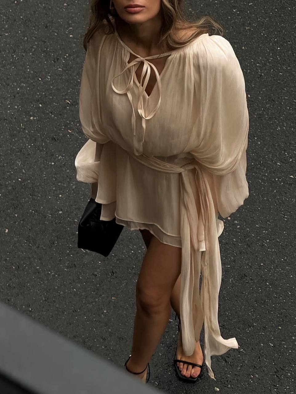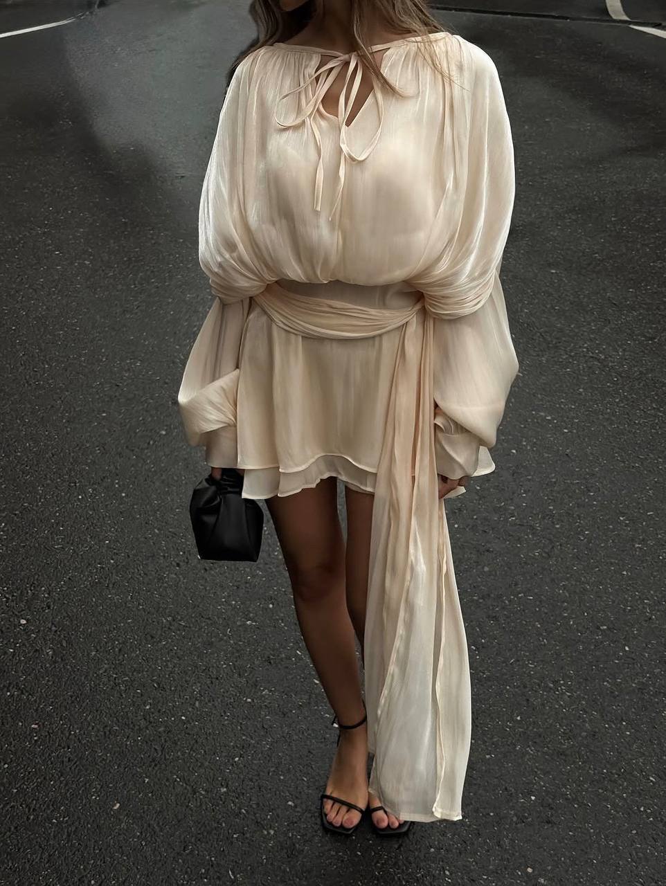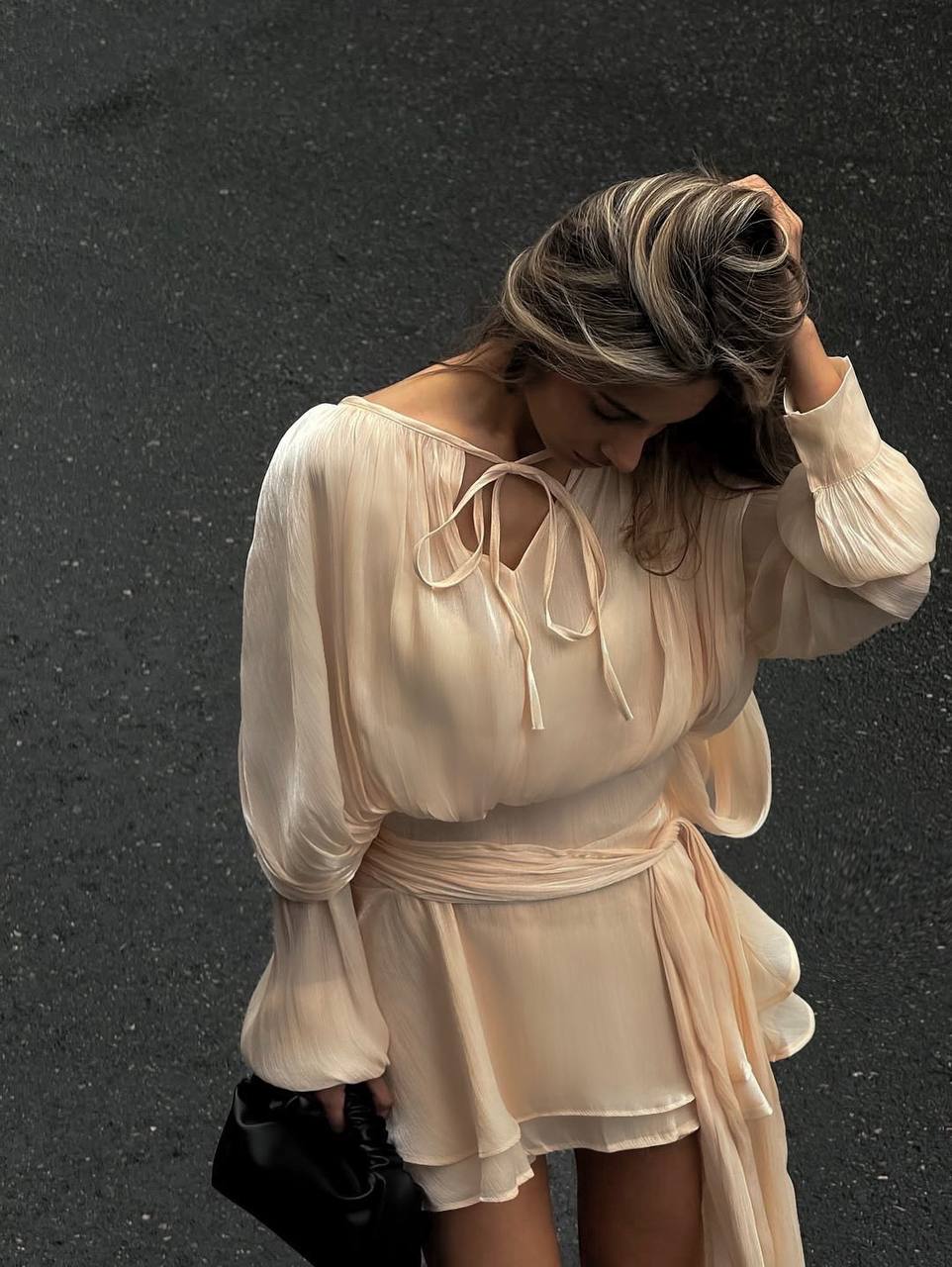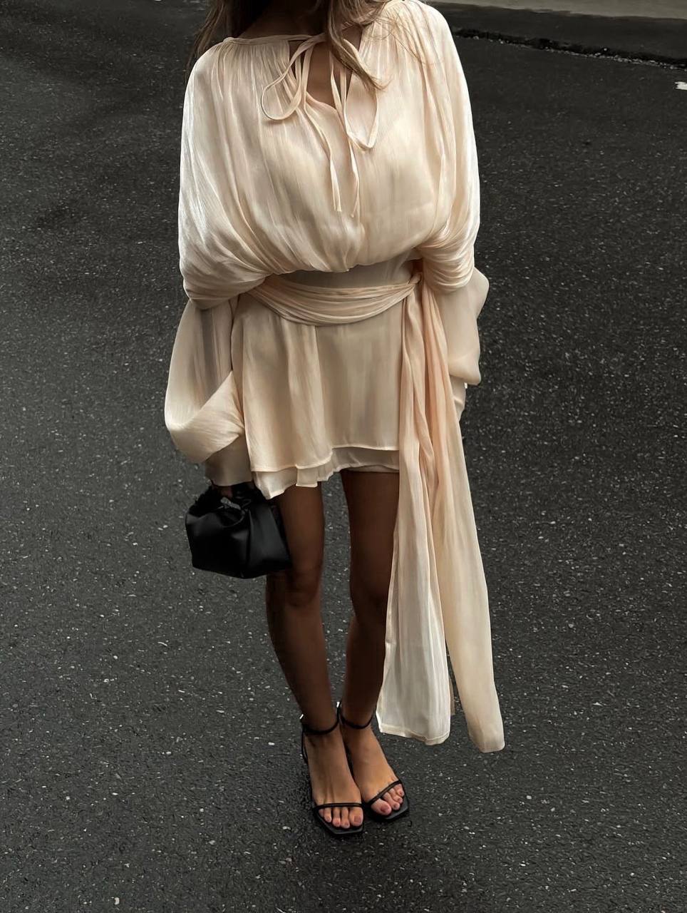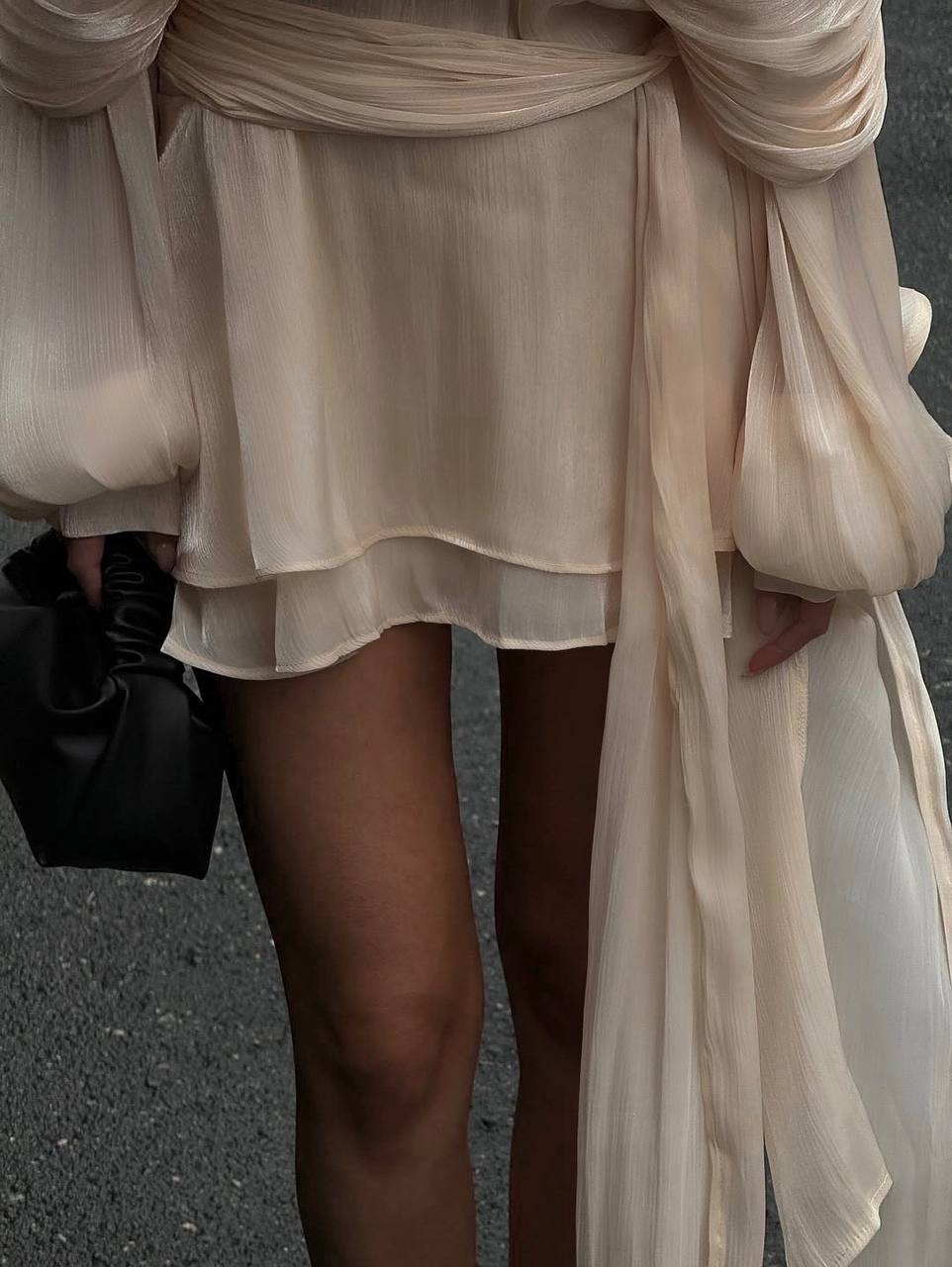 Невероятно легкое платье из шелка Армани, нежно обволакивающее тело. Верх с объемной драпировкой придает роскошь, а резинка на талии с фиксирующим поясом создает идеальную посадку. Под платьем – удобные шортики, которые делают образ еще более комфортным. Дополнительно в комплекте отдельный пояс