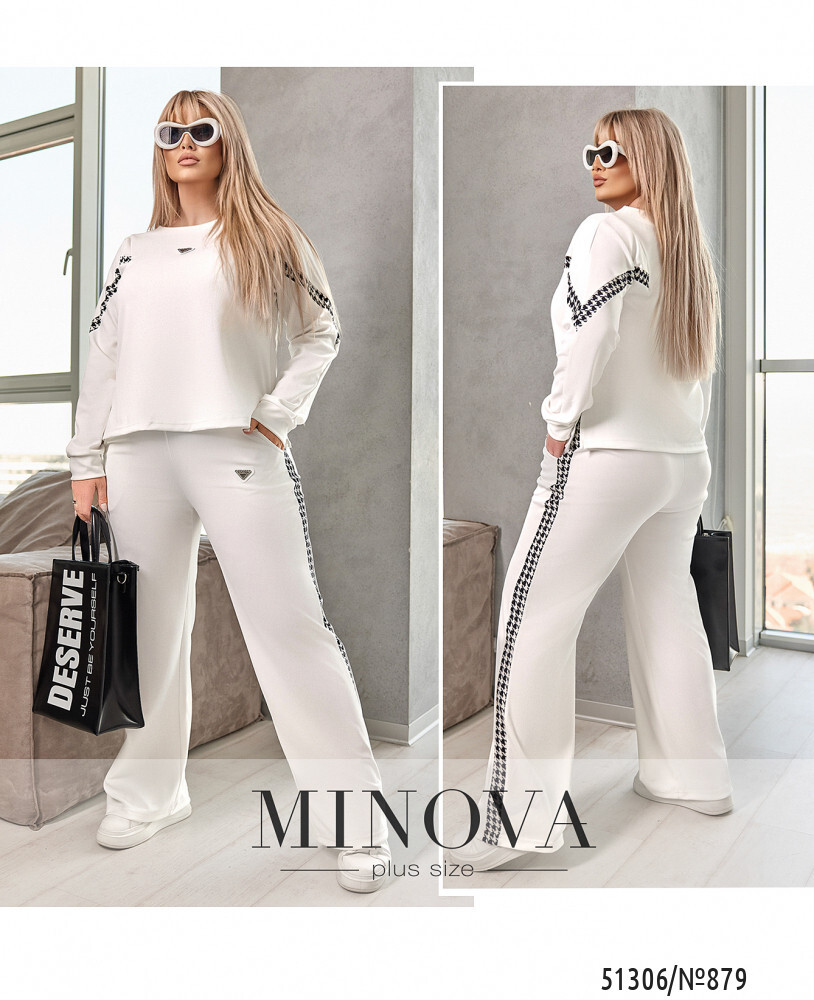 Ваш стильный спортивный костюм имеет оверсайз кофту с вставкой в виде принта гусиной лапки и нашивкой на груди. рукава длинные с манжетами, что добавляет удобства и завершенности образу. брюки свободного кроя с резинкой на талии и карманами гарантируют комфорт. лампасы по бокам, которые повторяют вставку на кофте, создают гармоничный образ.