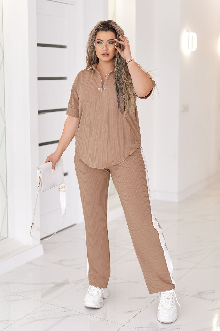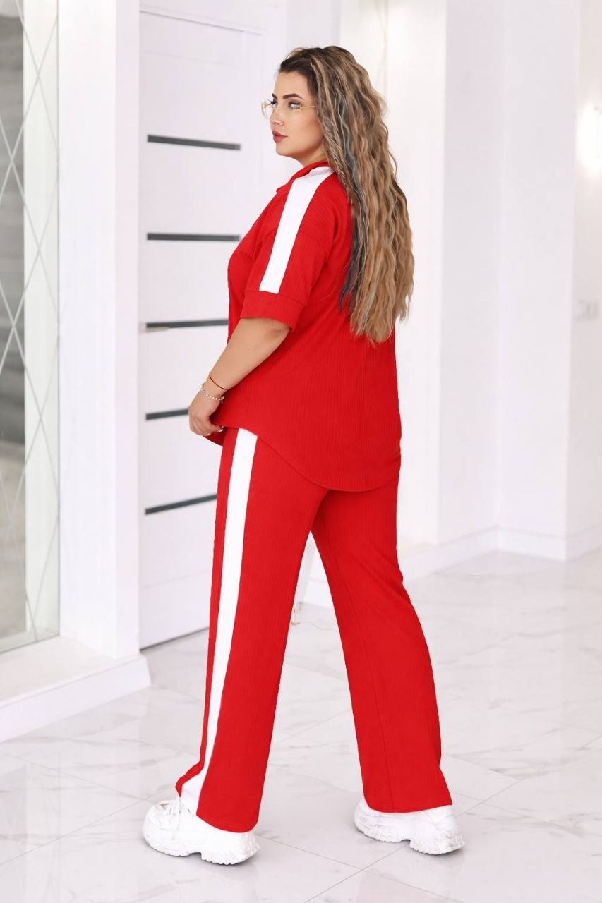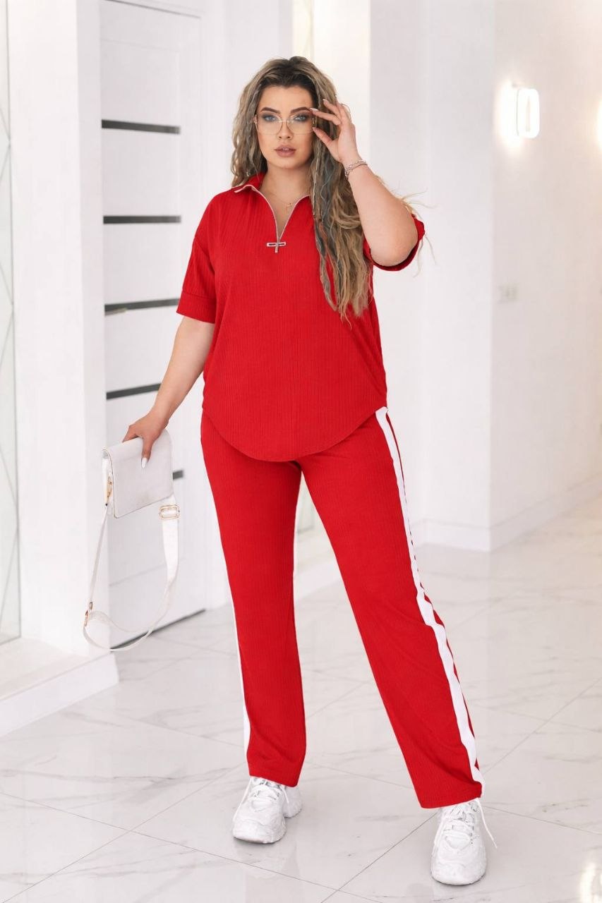 Стильный спортивный костюм, футболка-поло с короткими рукавами, воротничком и короткой молнией спереди, брюки прямого кроя с белыми лампасами, которые придают контрастный вид.