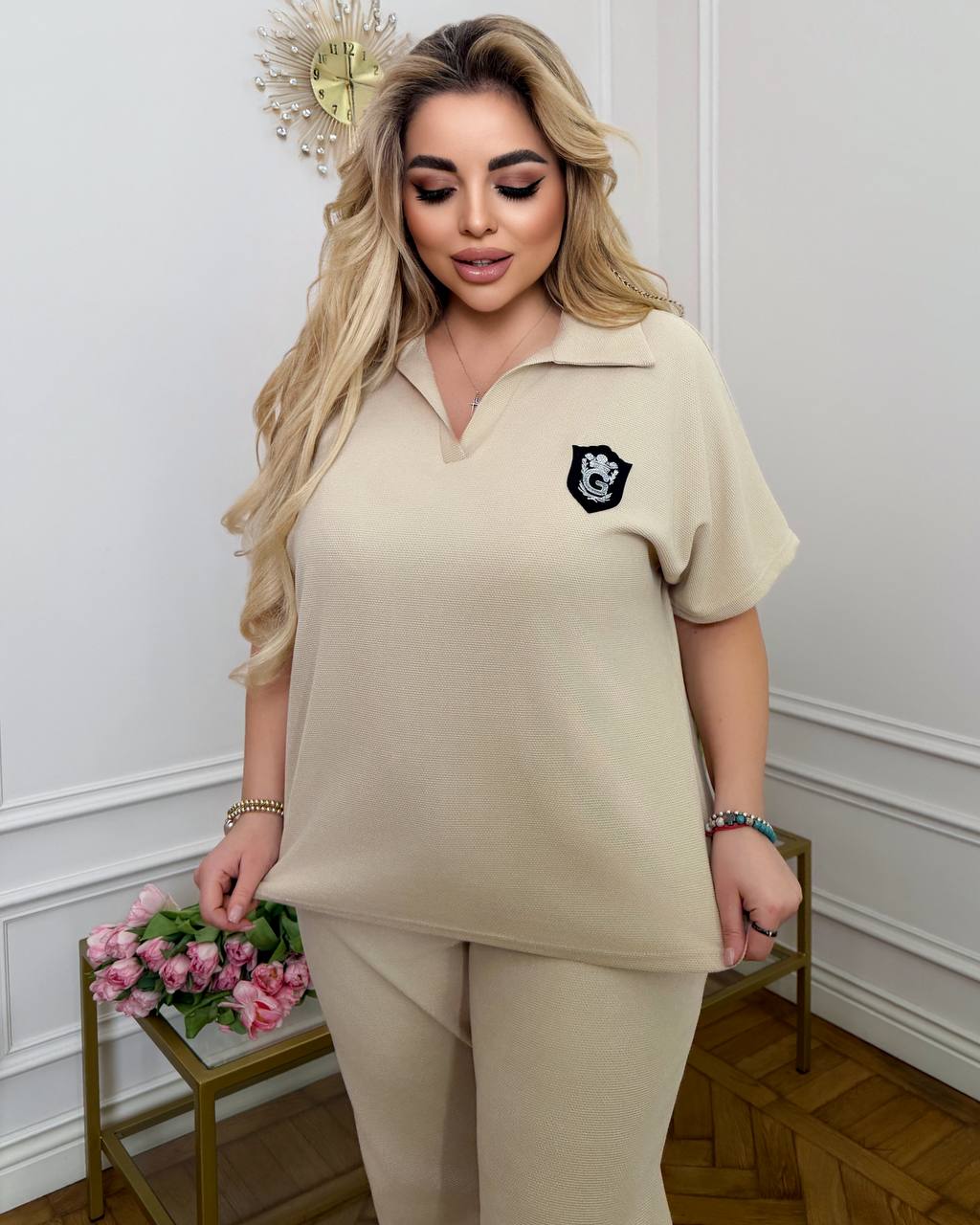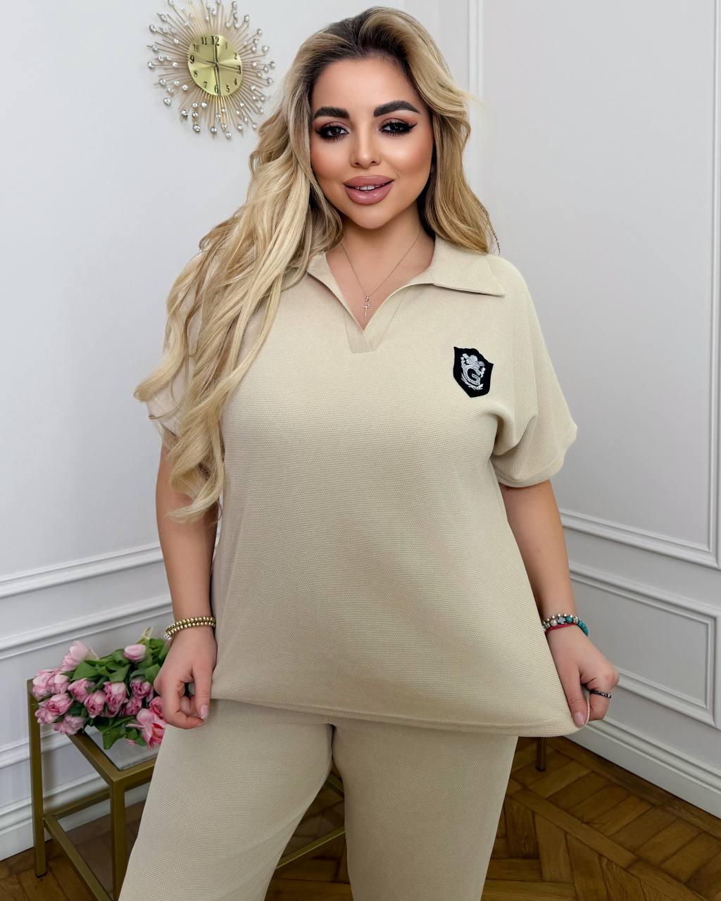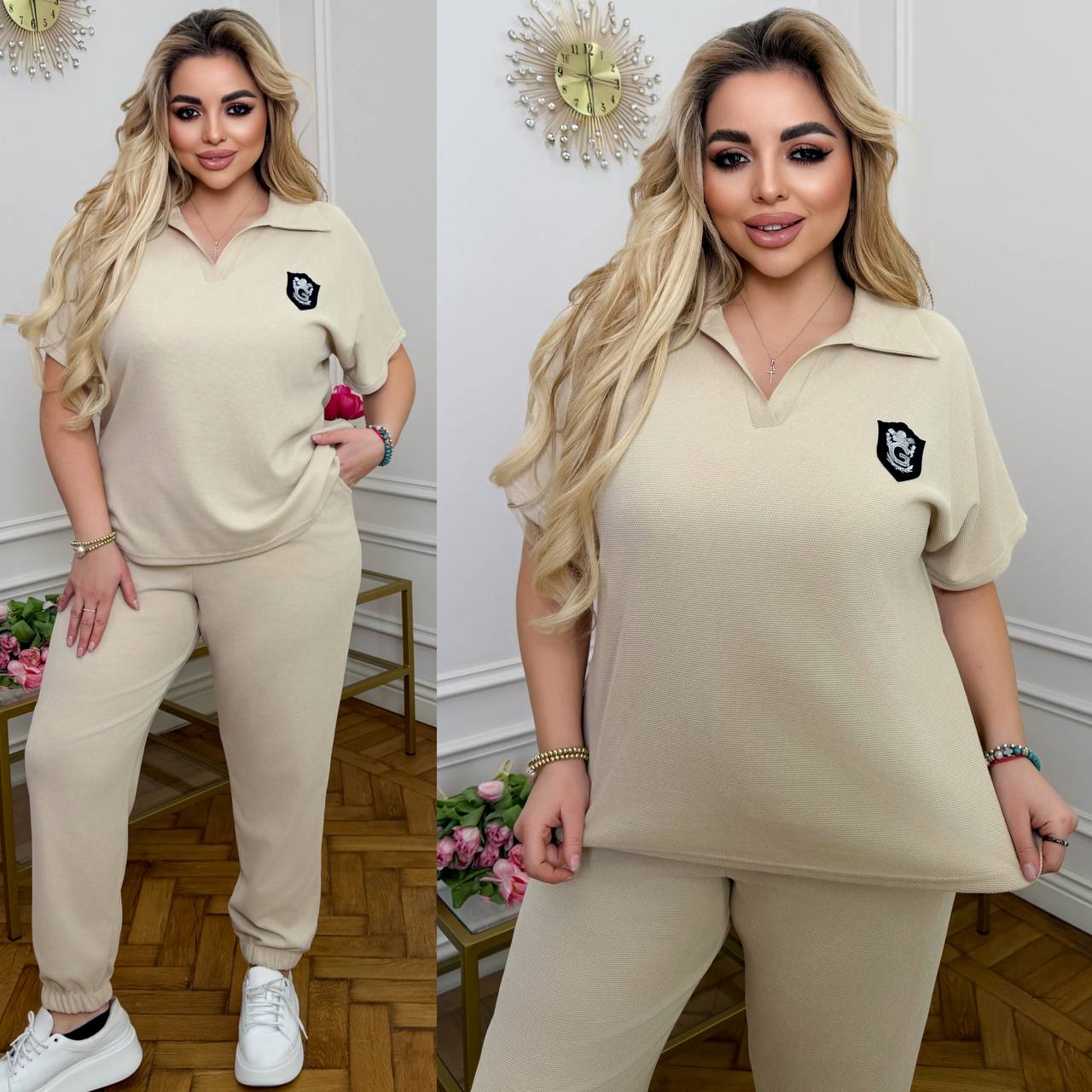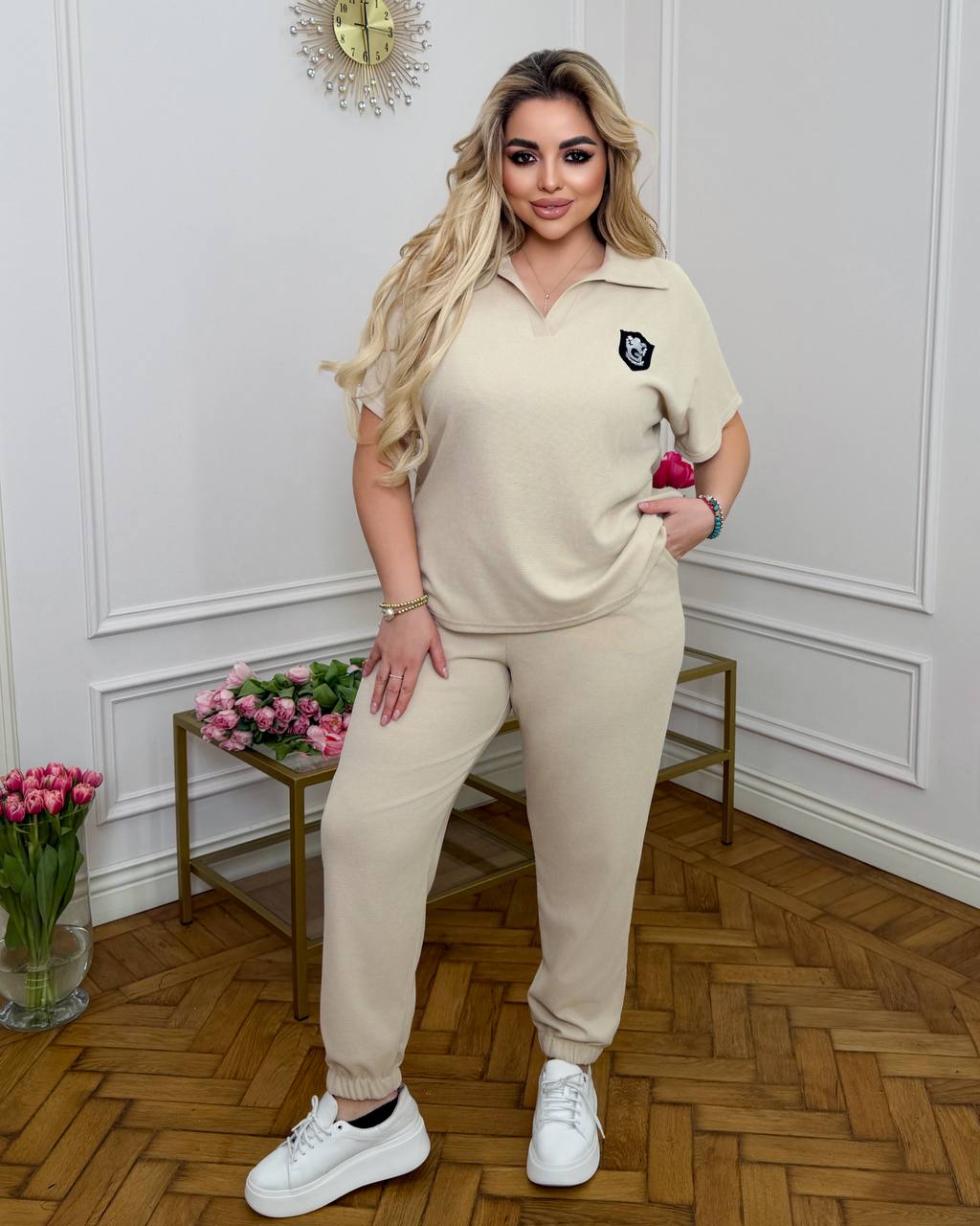 Стильный спортивный костюм с лампасом и аксессуаром.