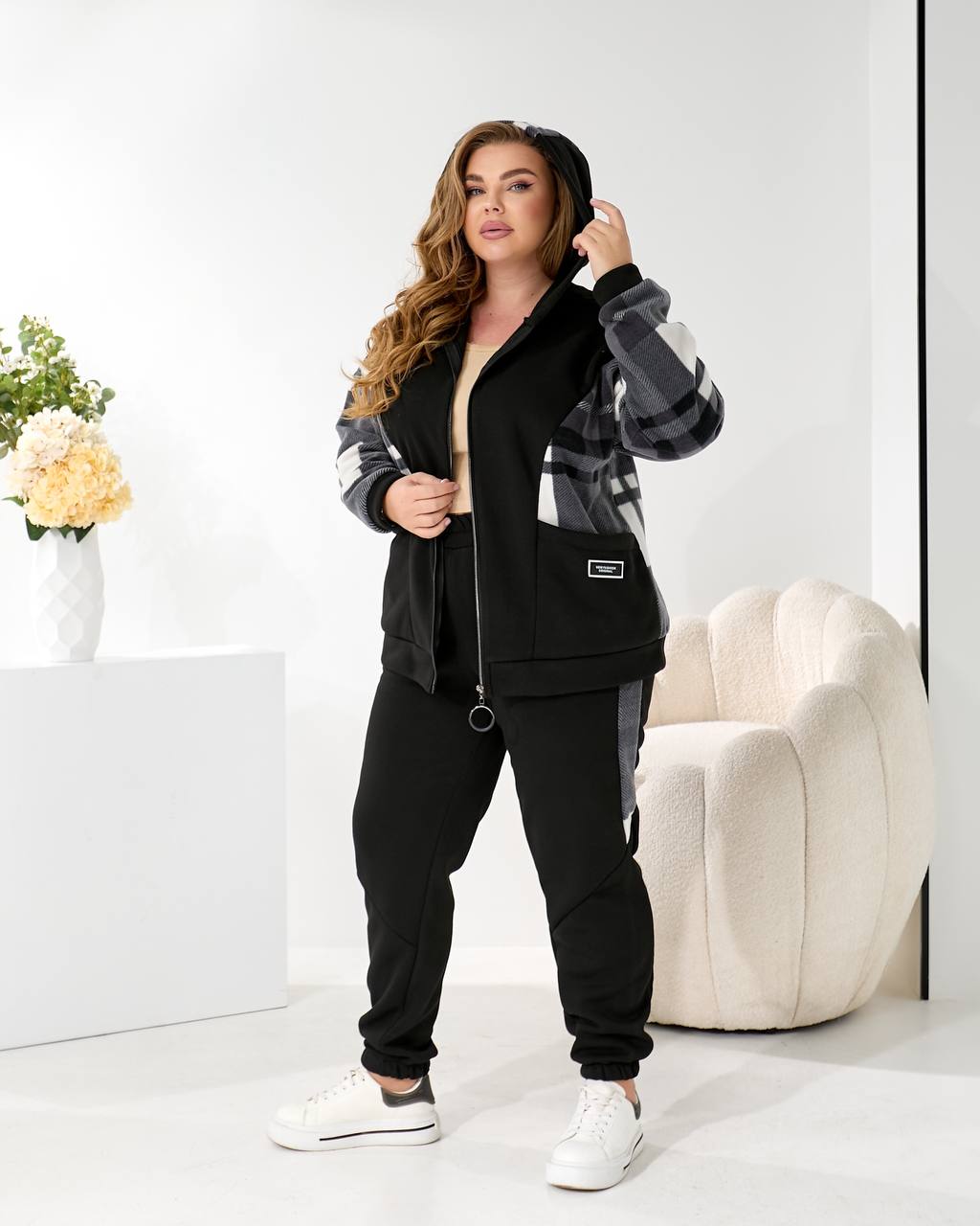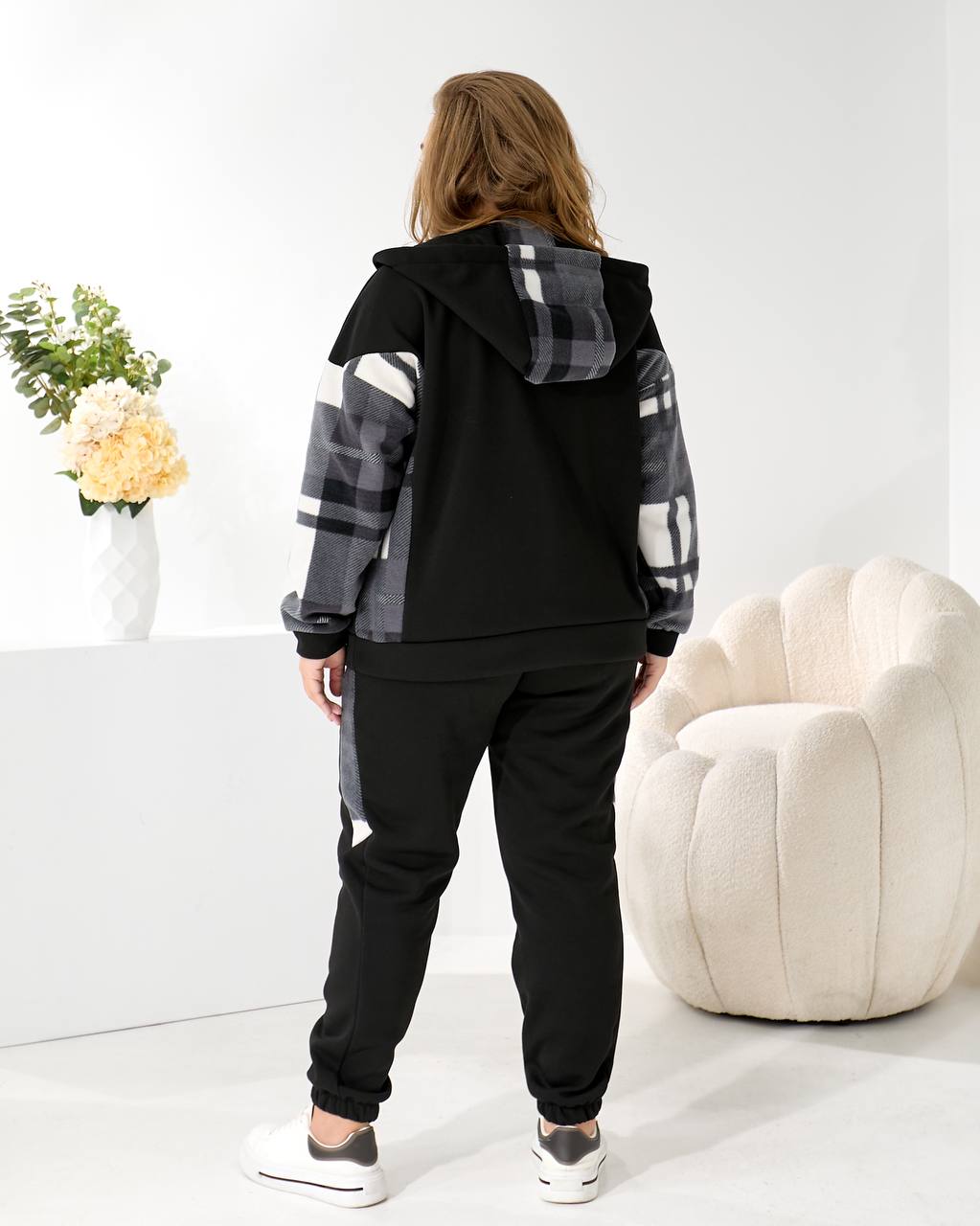 Кофта свободного кроя со вставками клетки, удобный глубокий капюшон, карманы.