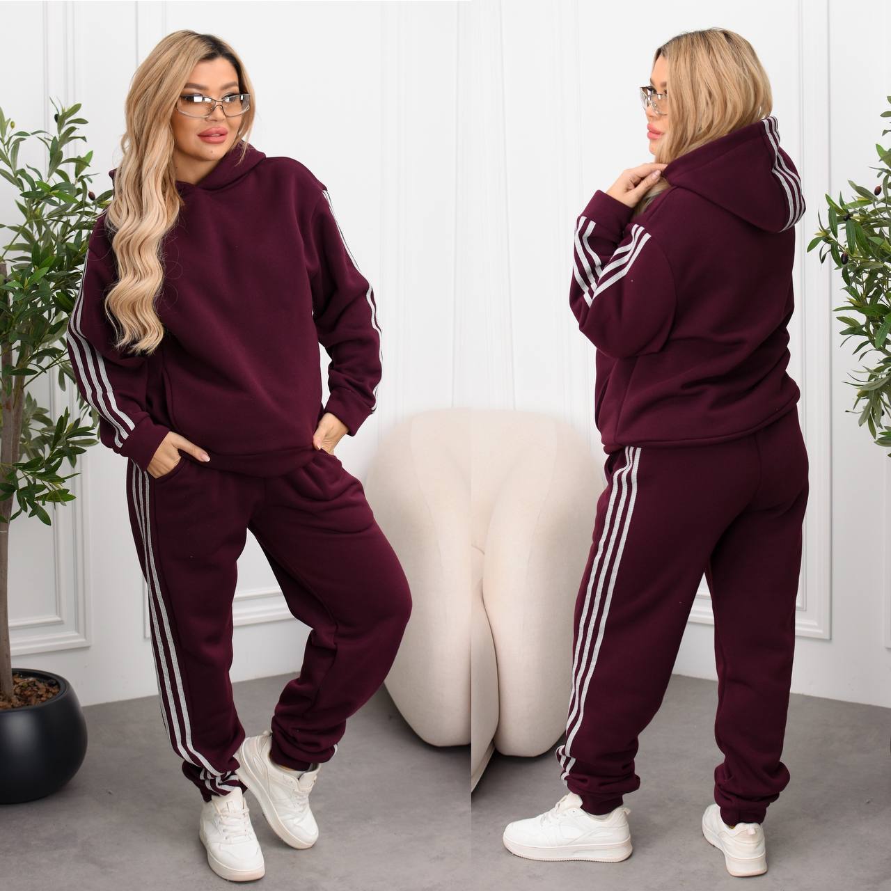 Мягкая теплая ткань, свободный крой, удобные брошенные в кофте и брюках, а также акцентные лампасы по бокам