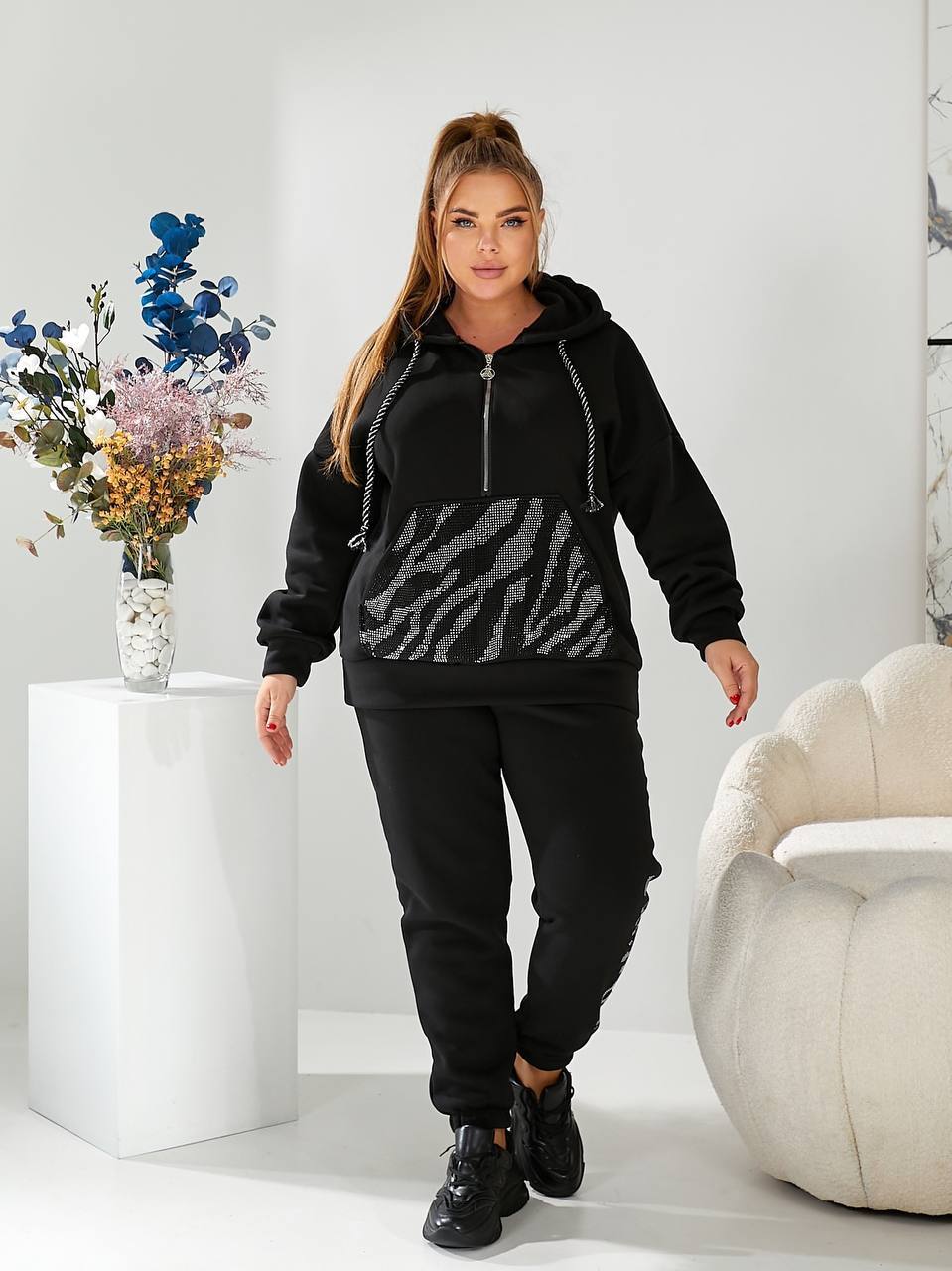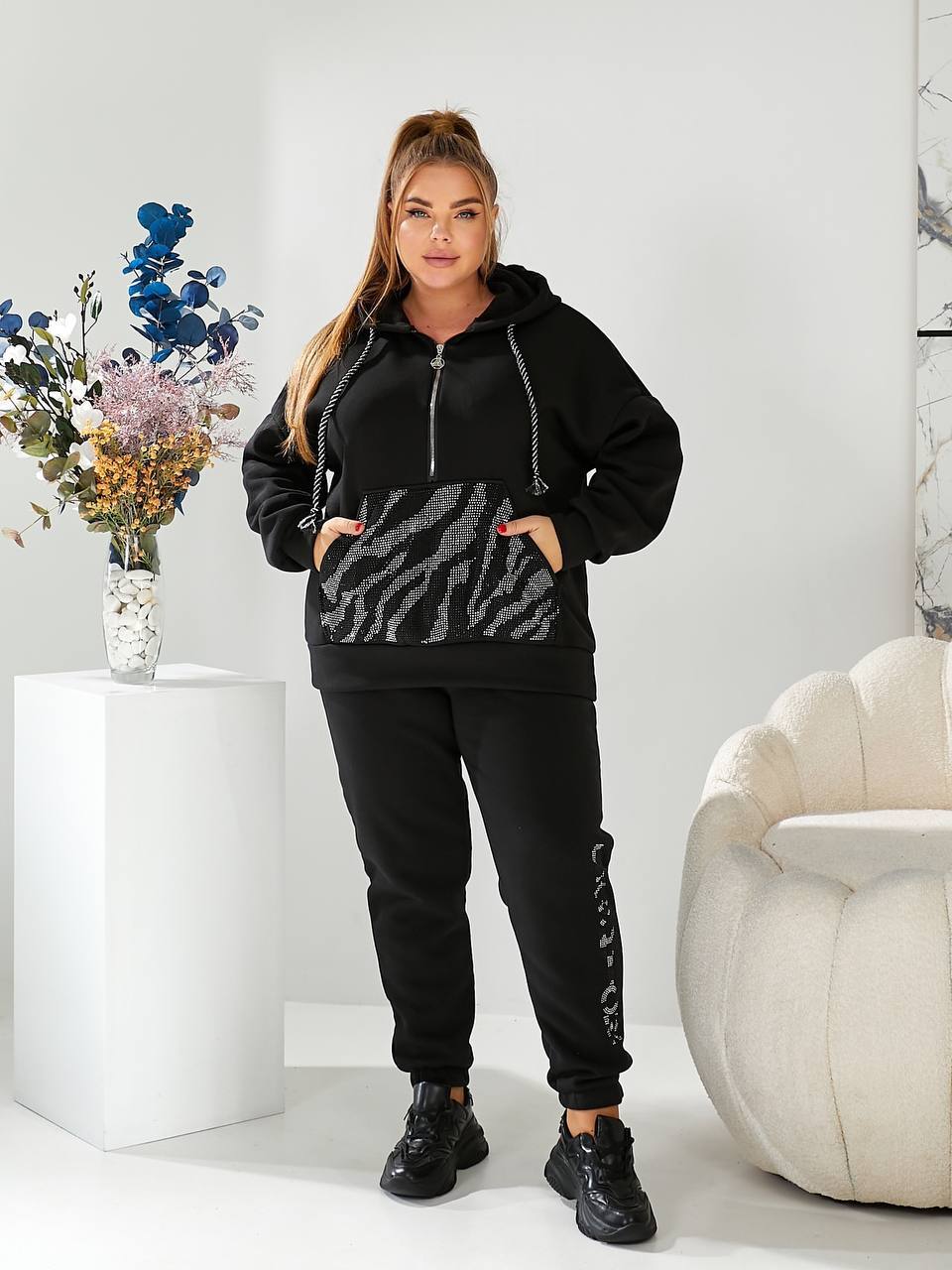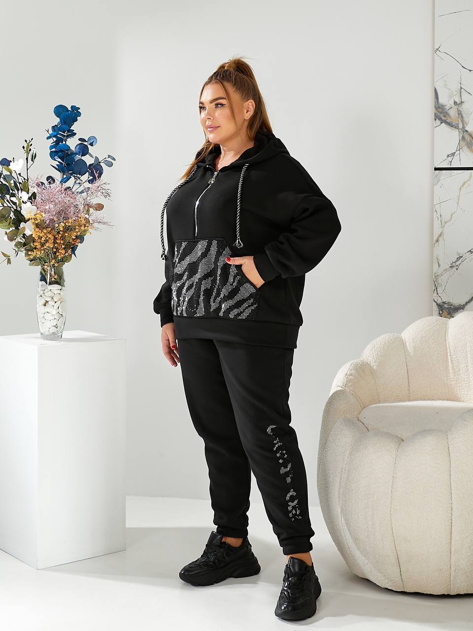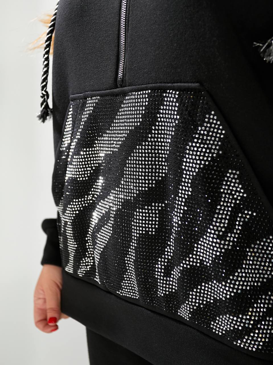 Кофта свободного кроя, удобный глубокий капюшон, декорированный камнями. Стиль спортивный, утепленный на флисе