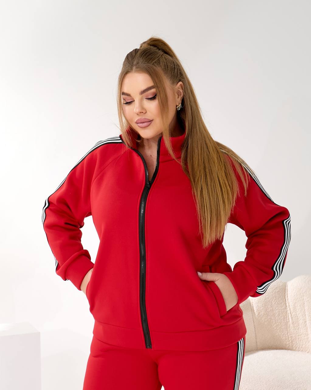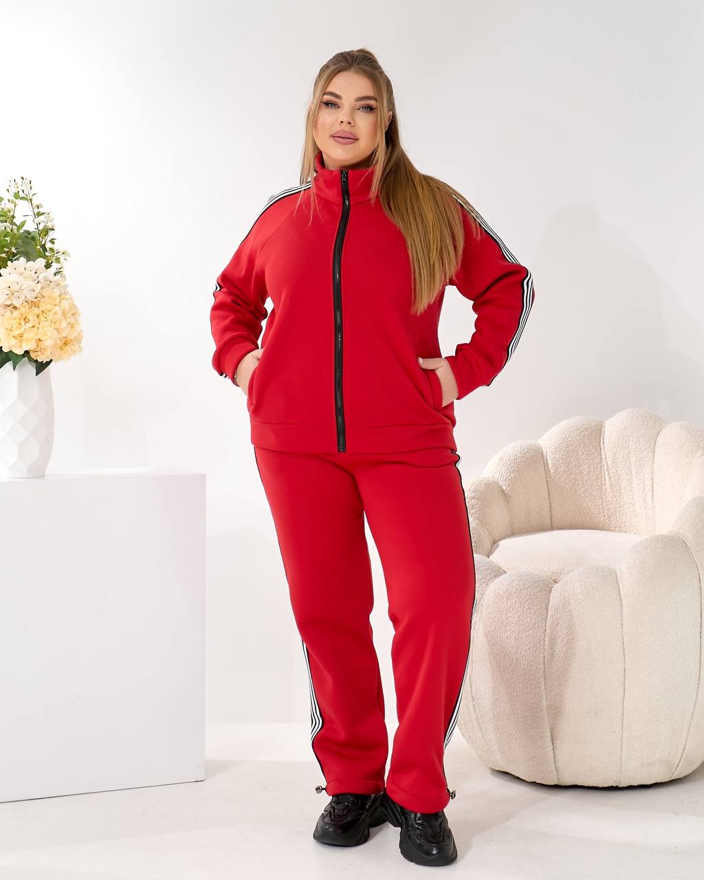 Комфортный крой, кофта на молнии, с карманами. Брюки с высокой посадкой, прямые, с карманами, украшены снизу удобной регулируемой резинкой. Рукава и наружный шов на ноге имеют декоративное украшение – лампас.