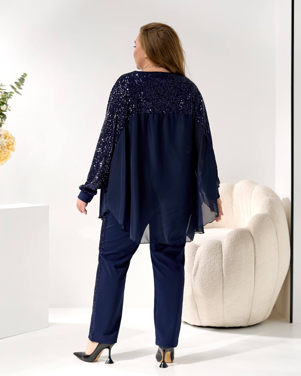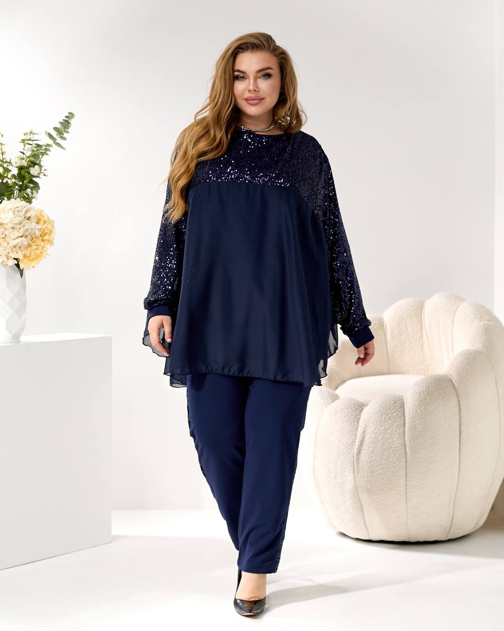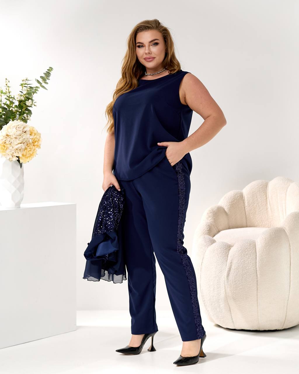 2. Брюки (брюки): прямого/немного суженного силуэта, из креп-дайвинга, с лампасами из пайетки, визуально вытягивающими силуэт! 👖⬆️
