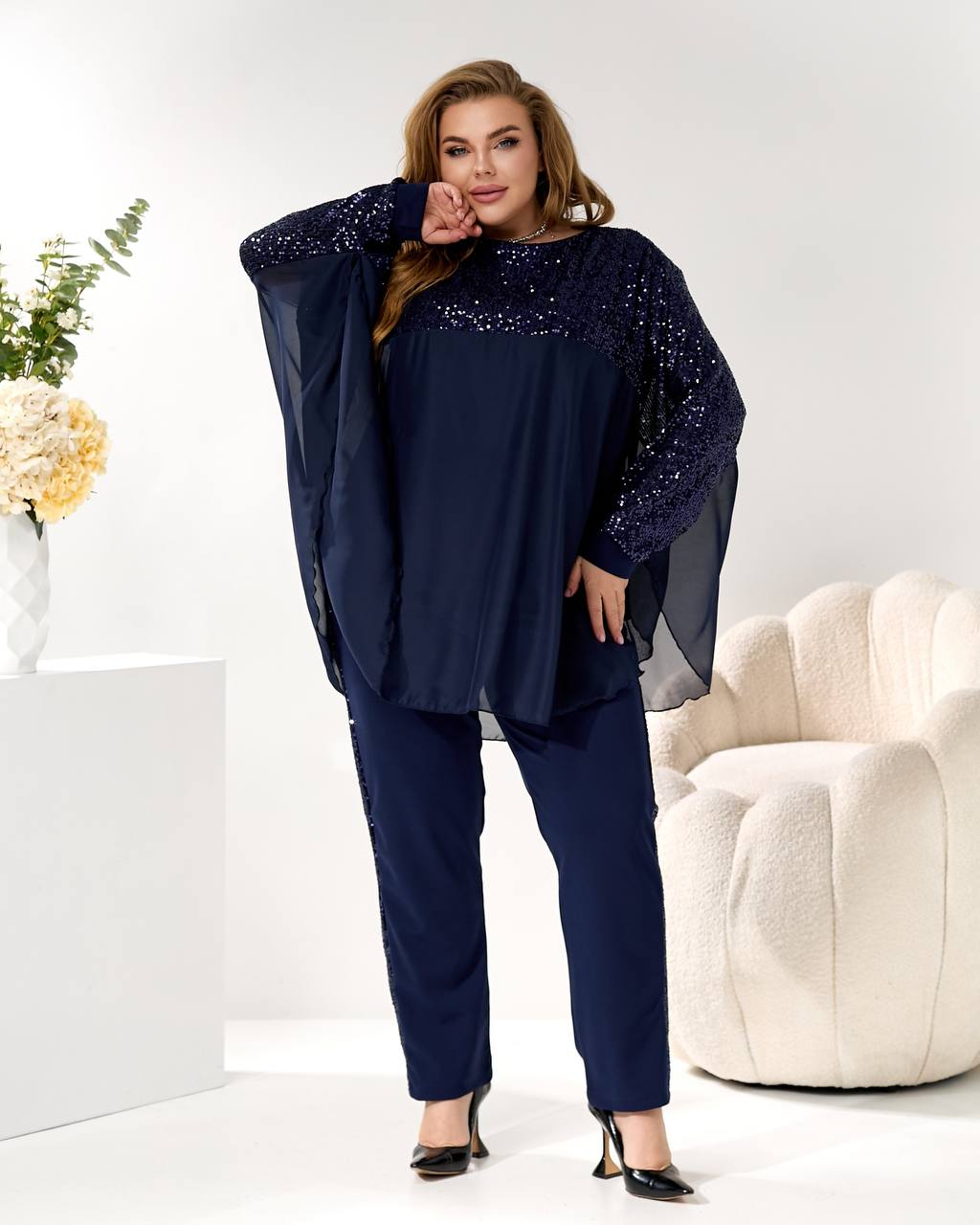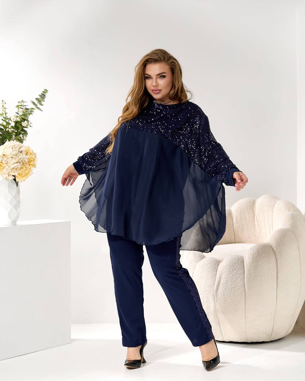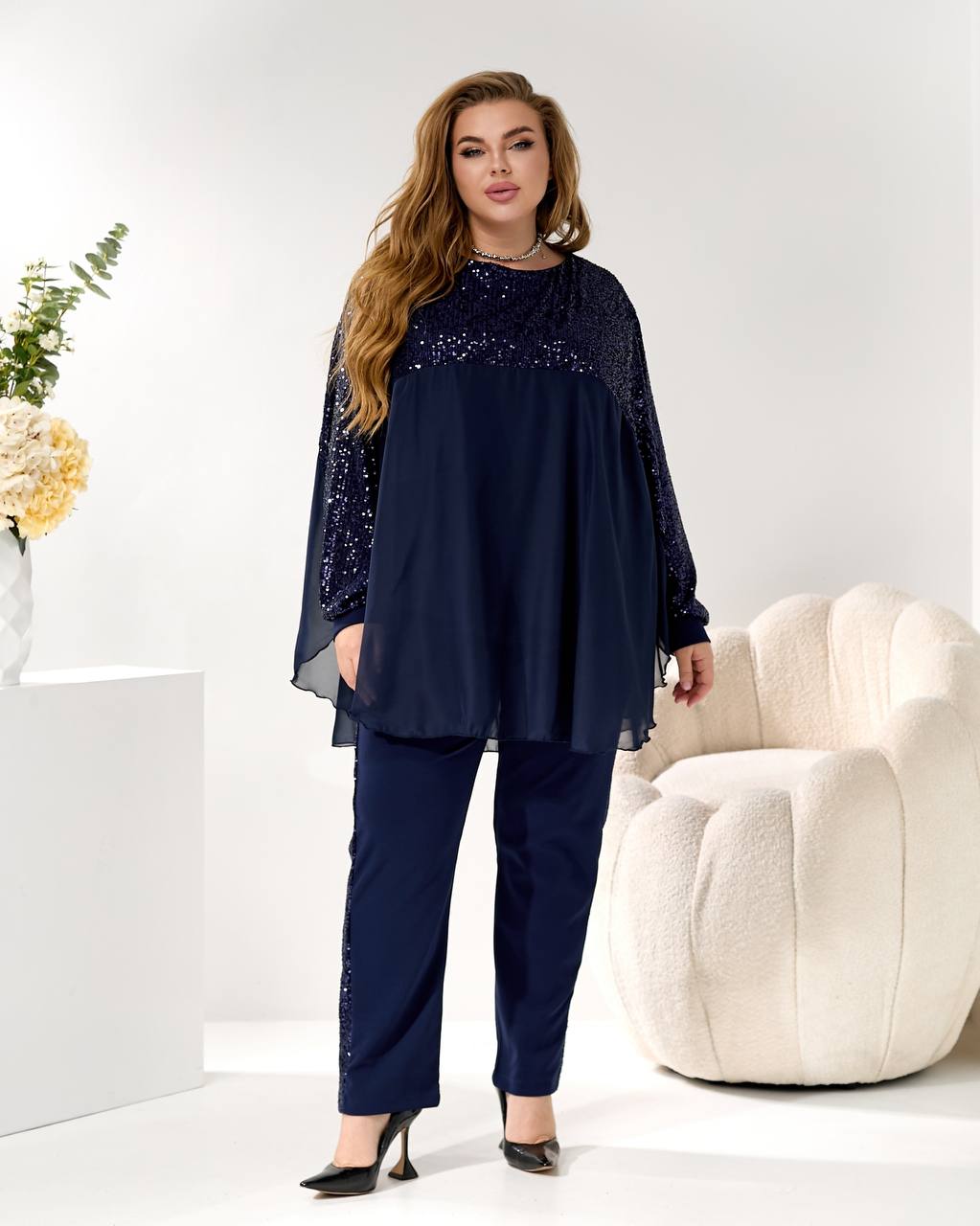 2. Брюки (брюки): прямого/немного суженного силуэта, из креп-дайвинга, с лампасами из пайетки, визуально вытягивающими силуэт! 👖⬆️