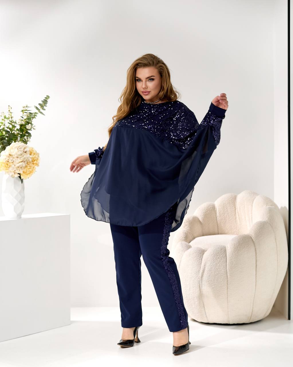 3. Накидка/Туника: Свободный, летучий крой из шифона с отделкой пайетками на плечах и рукавах. Можно носить поверх майки или стильный жакет. 🦋🧥