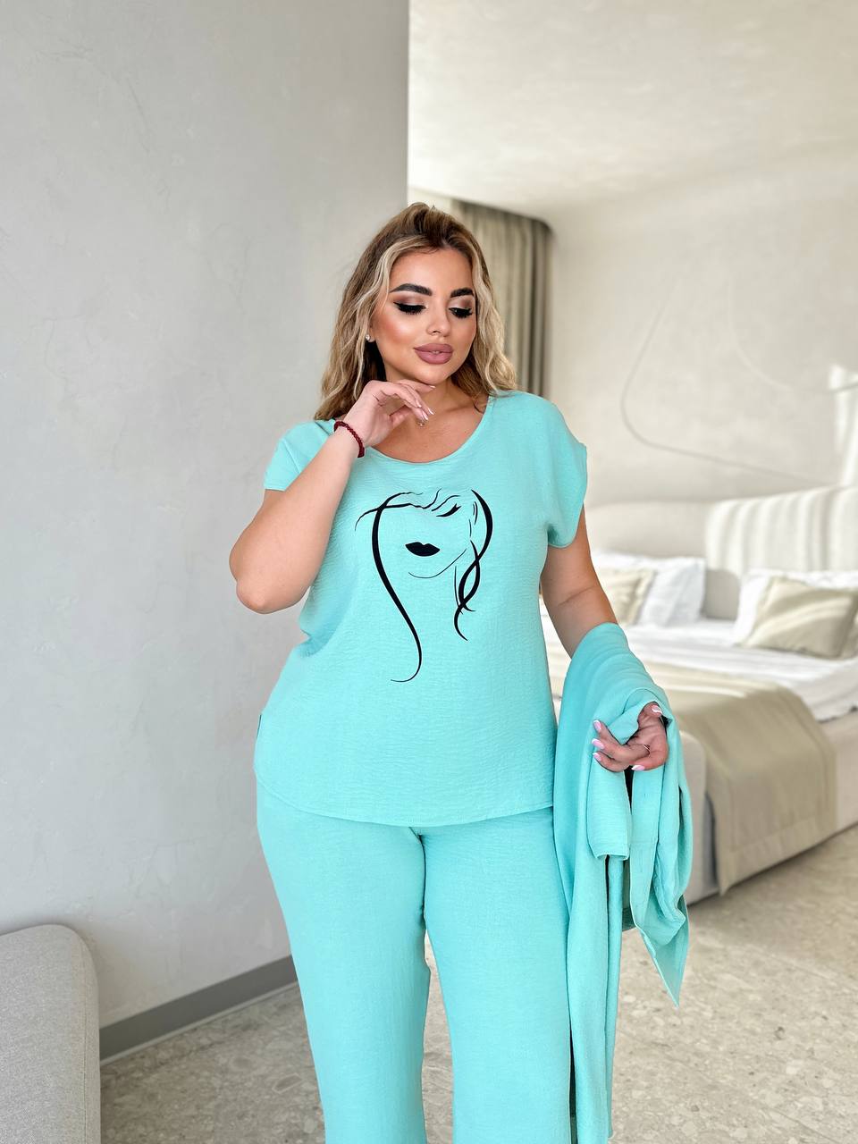 Костюм-тройка с оригинальным накатом, все три детали гардероба можно носить отдельно: блуза с качественным накатом, как на фото, с обеих сторон разрезы; брюки на широкой резинке, по бокам карманы; удлиненная рубашка, застегивающаяся на пуговицы, рукав на патике с пуговицей (длину возможно регулировать), на груди карманы с пуговицей.
