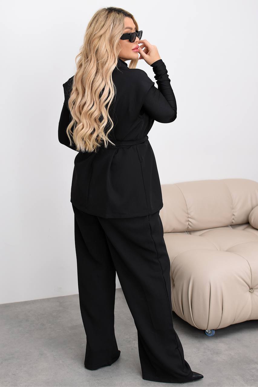 Элегантный костюм-двойка из костюмной ткани – выбор для женщин, которые ценят комфорт и стиль. Прямые брюки визуально вытягивают силуэт, а удлиненный жилет с английским воротником придает образу утонченности. Модель на запахе с поясом акцентирует талию, создавая женственный силуэт. Идеален как для деловых встреч, так и для стильных прогулок по городу.