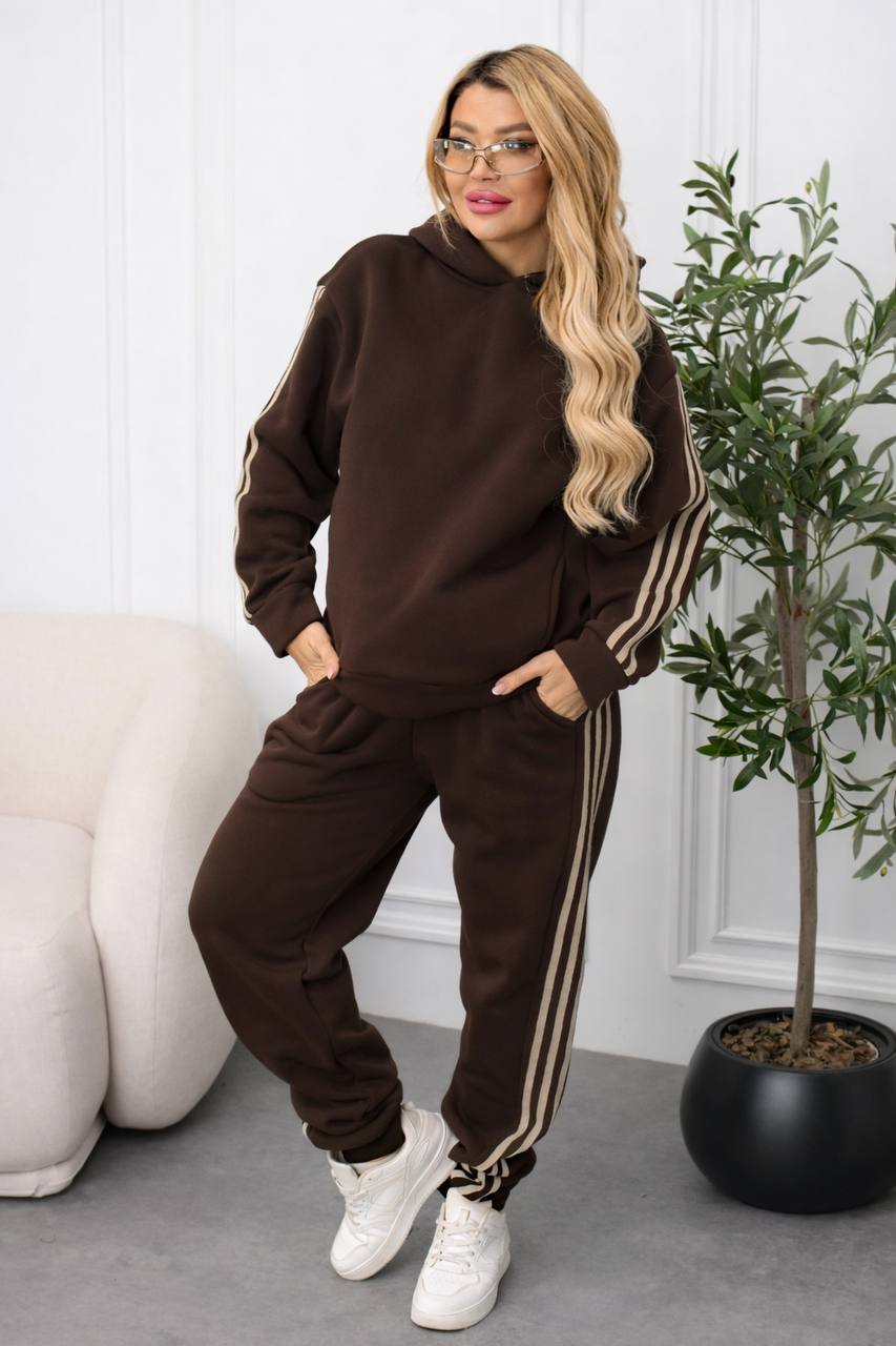 Мягкая теплая ткань, свободный крой, удобные брошенные в кофте и брюках, а также акцентные лампасы по бокам