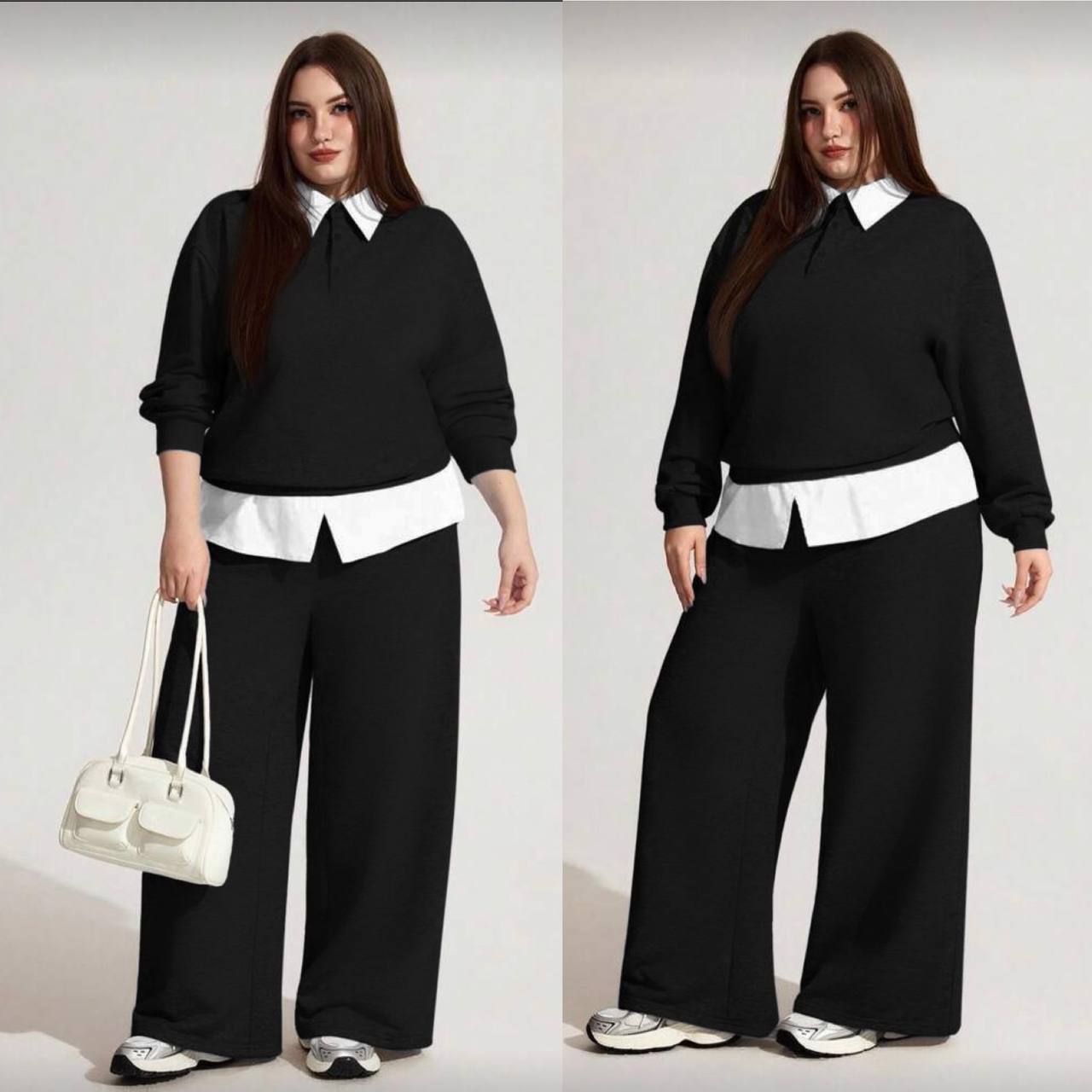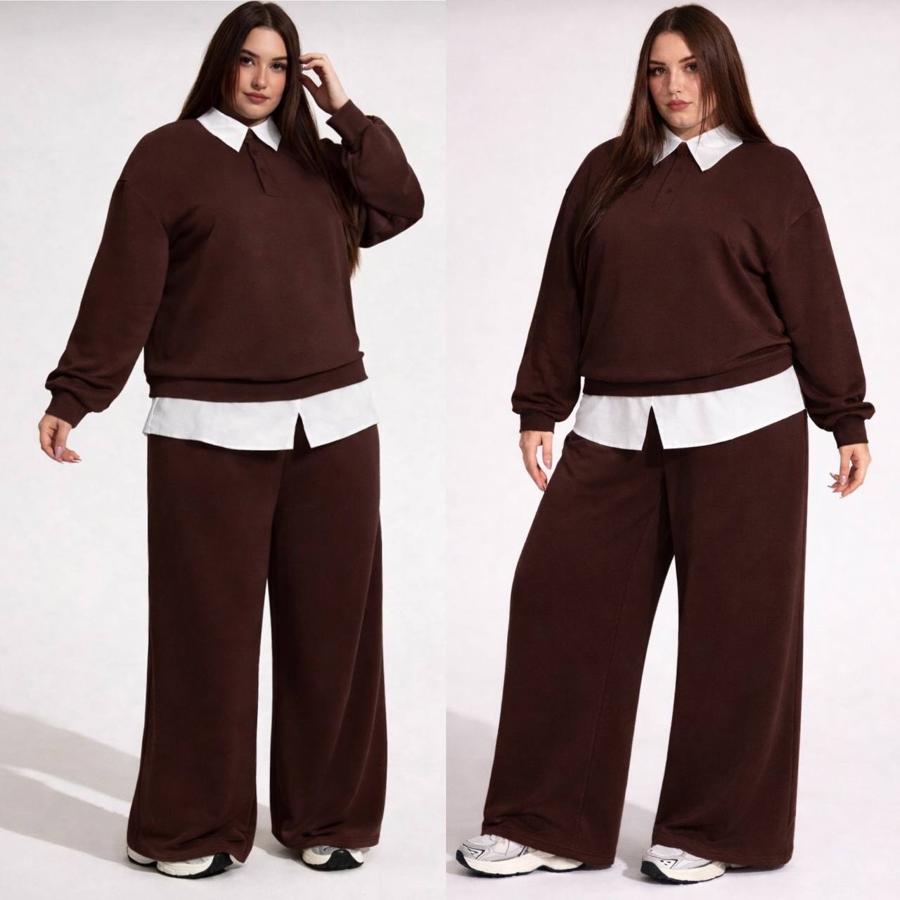 Кофта оригинального кроя выполнена из трикотажа с добавлением белого супер софта на воротнике и снизу с имитацией рубашки. брюки средней посадки на резинке с карманами.