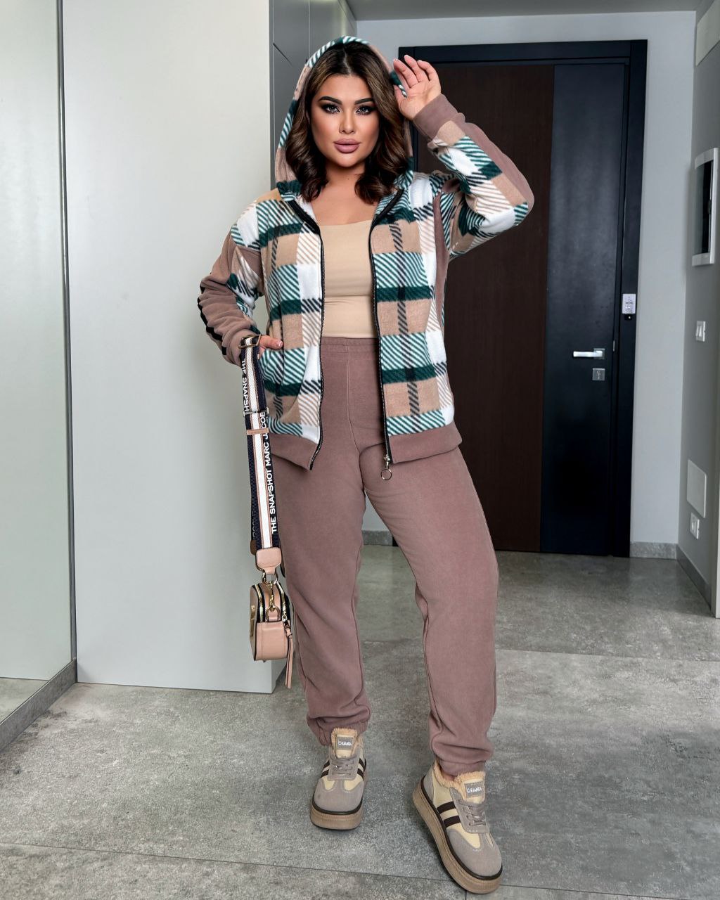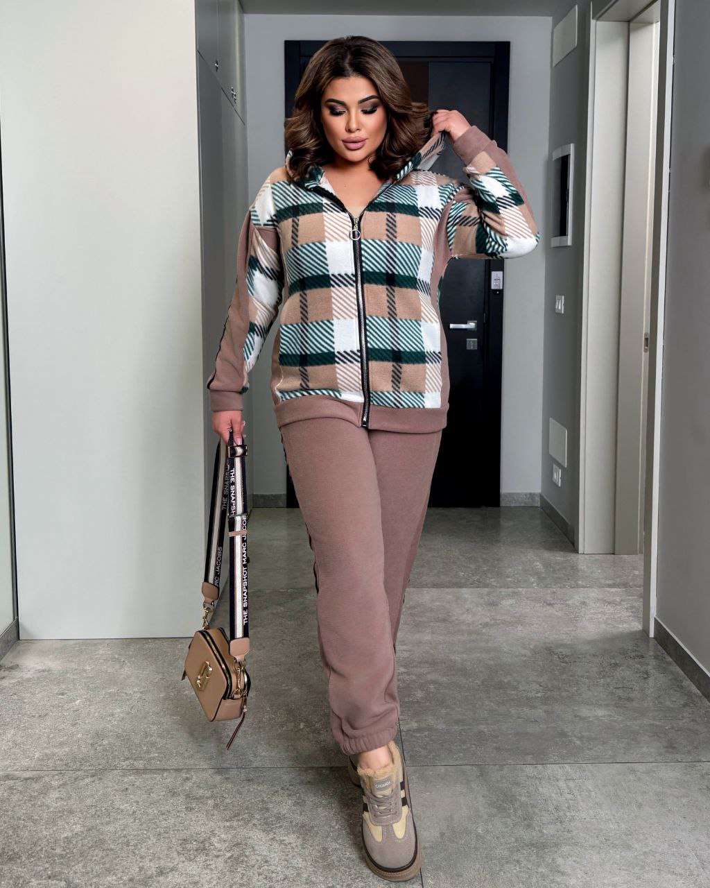 Теплый костюм в клетку, стиль спортивный, повседневный