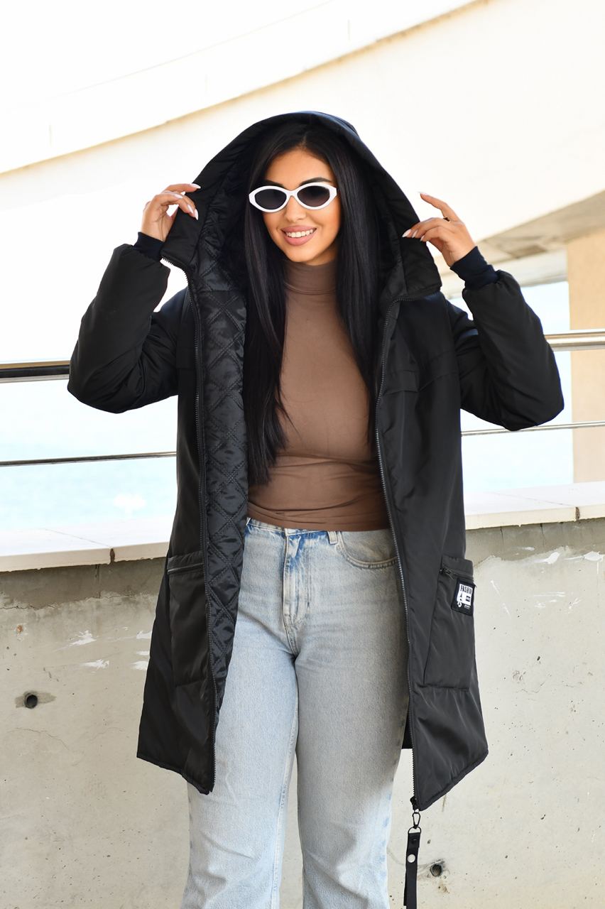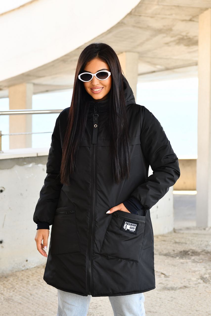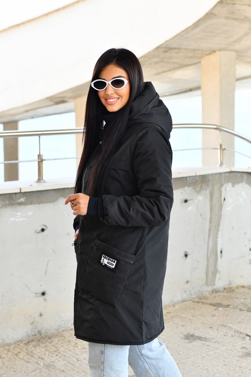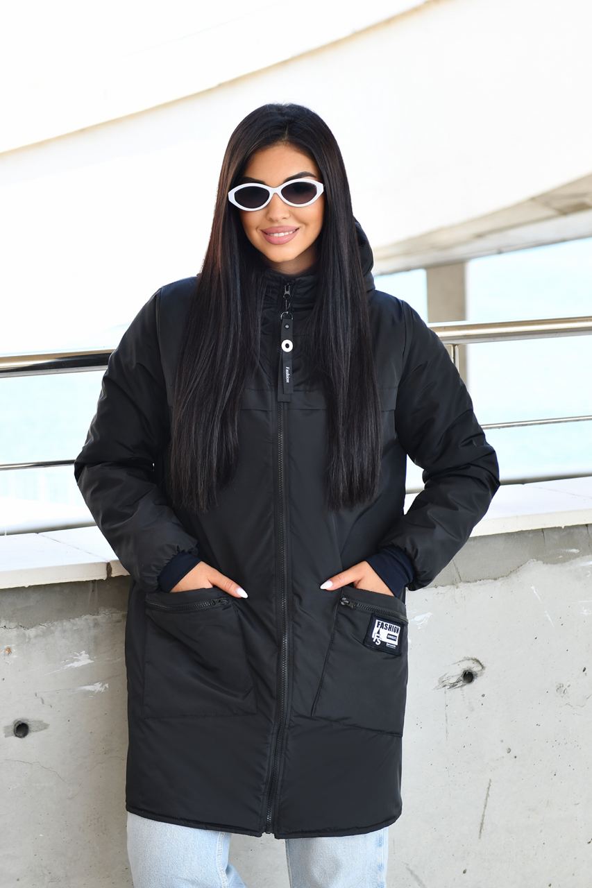 Демисезонное пальто на синтепоне. Изделие свободного силуэта, имеет два украшенных кармана с обеих сторон, с капюшоном, передняя застежка на молнии с двумя собачками, в рукаве манжет на флисе, все карабины «Фешн» съемные