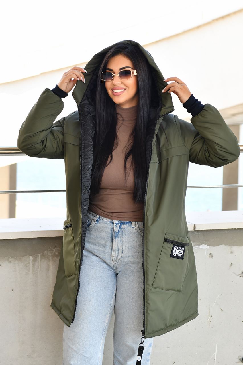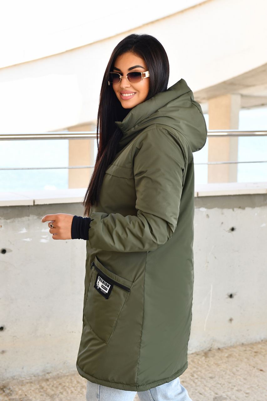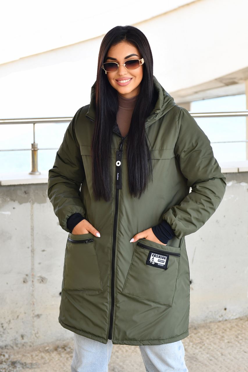 Демисезонное пальто на синтепоне. Изделие свободного силуэта, имеет два украшенных кармана с обеих сторон, с капюшоном, передняя застежка на молнии с двумя собачками, в рукаве манжет на флисе, все карабины «Фешн» съемные