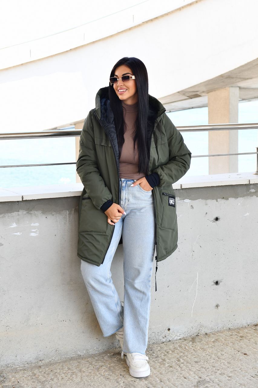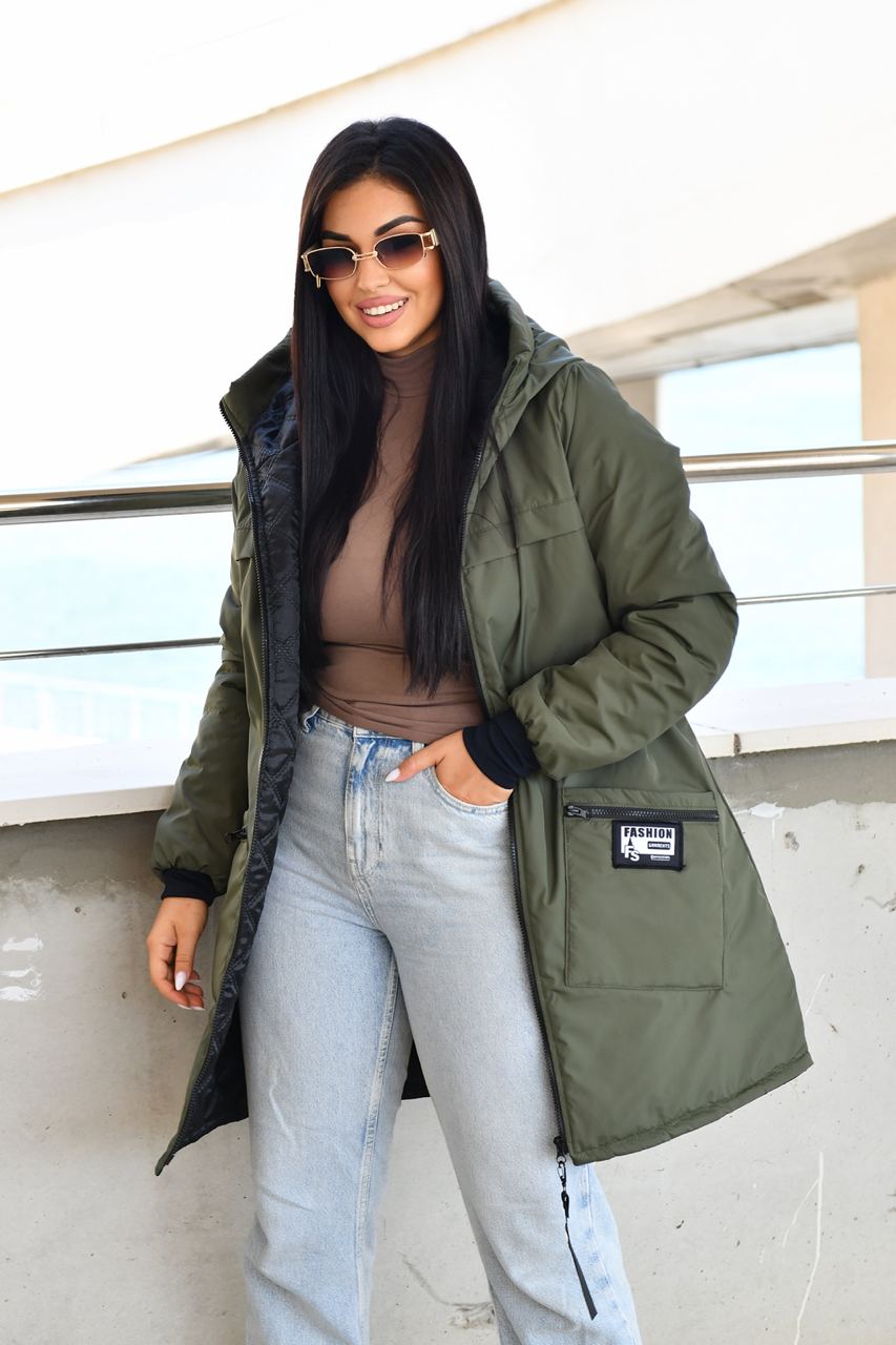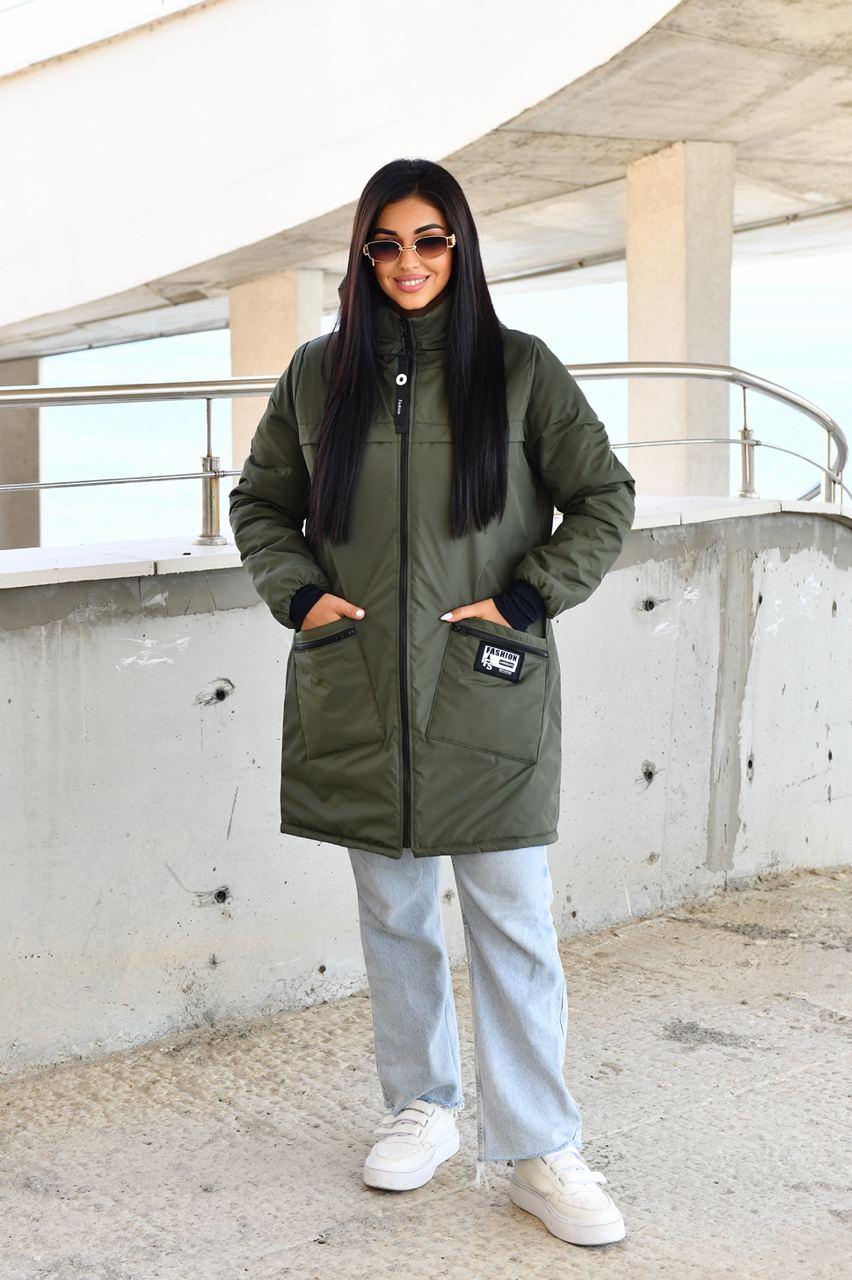 Демисезонное пальто на синтепоне. Изделие свободного силуэта, имеет два украшенных кармана с обеих сторон, с капюшоном, передняя застежка на молнии с двумя собачками, в рукаве манжет на флисе, все карабины «Фешн» съемные