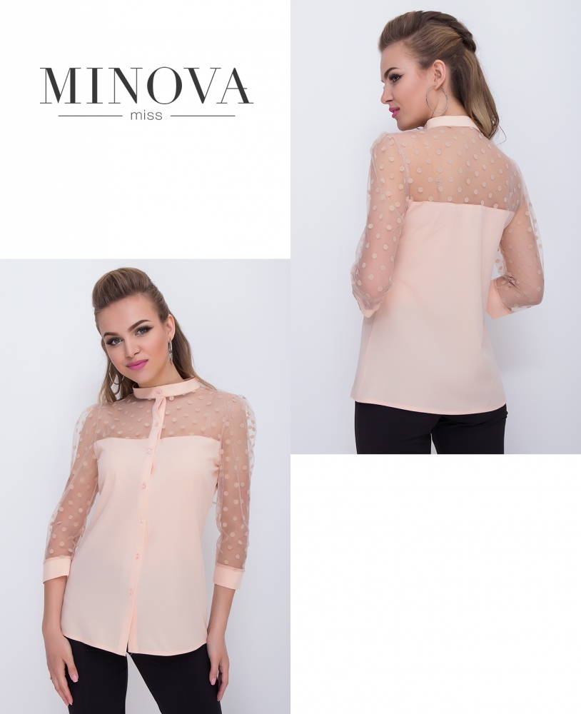 Элегантная блуза прямого кроя с полупрозрачной сеткой в горошек и рукавами. блуза с воротником-стойкой застегивается на пуговицы. линия отреза проходит над грудью. рукава отделаны манжетами без пуговиц.
