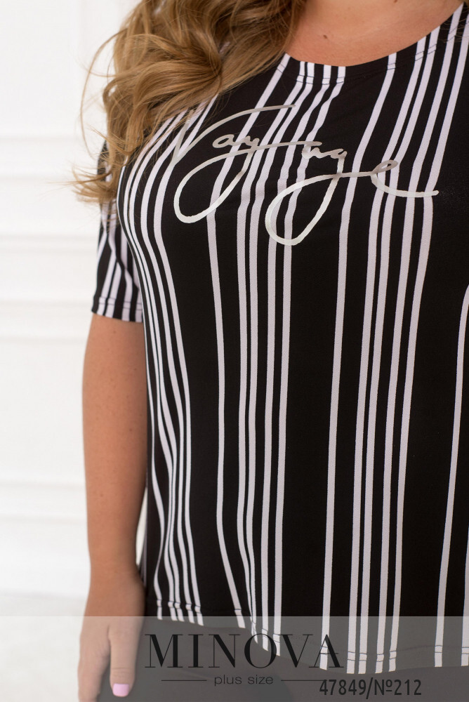 Стильная блуза в вертикальную полоску, которая визуально вытягивает силуэт. рукава длины 3/4 со спущенным плечом. передняя часть декорирована аппликацией.
