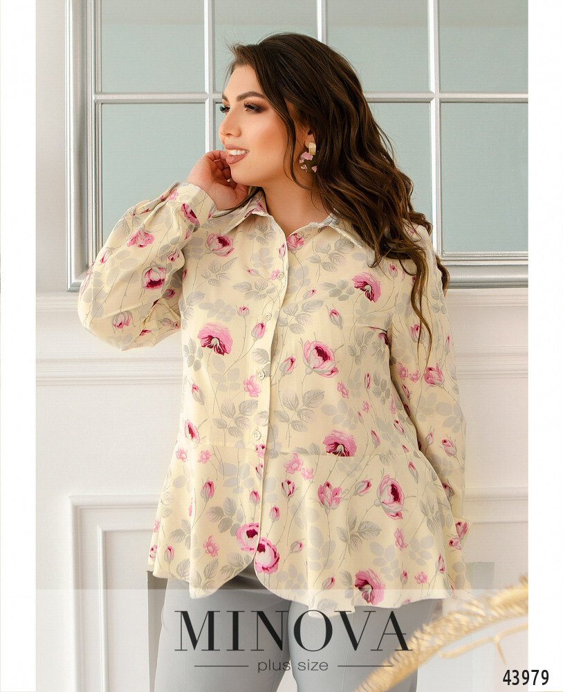 Элегантная блуза батал с нежным принтом, воротничок отложной, спереди - ряд пуговиц на планке. рукава с манжетами, на манжетах по одной пуговке. снизу к подолу подшиты мягкие оборки. на груди вытачки. карманов нет. Ориентировочные замеры по готовому изделию: 50-52 р-р: длина блузки 67-73см, длина рукава от плечевого шва 63см, обхват рукава 40см, ог - 106см, от -108см. 54-56 р-р: длина блузки 69-77см, длина рукава от плечевого шва 63см, обхват рукава 42см, ог - 114см, от -116см. 58-60 р-р: длина блузки 70-74см, длина рукава от плечевого шва 64см, обхват рукава 44см, ог - 120см, от -124см. 62-64 р-р: длина блузки 73-77см, длина рукава от плечевого шва 65см, обхват рукава 48см, ог - 130см, от -132см. 66-68 р-р: длина блузки 76-80см, длина рукава от плечевого шва 65см, обхват рукава 52см, ог - 136см, от -140см. Рекомендации по уходу: машинная стирка при низких температурах (до 40 градусов) *замеры могут отличаться от указанных на +-2см в зависимости от особенностей ткани, техническим особенностям пошива, степенью усадки ткани **в зависимости от цветопередачи вашего монитора, оттенок изделия может немного отличаться ***обратите внимание, фурнитура по изделию может меняться ***в зависимости от партии фурнитура в изделии может меняться