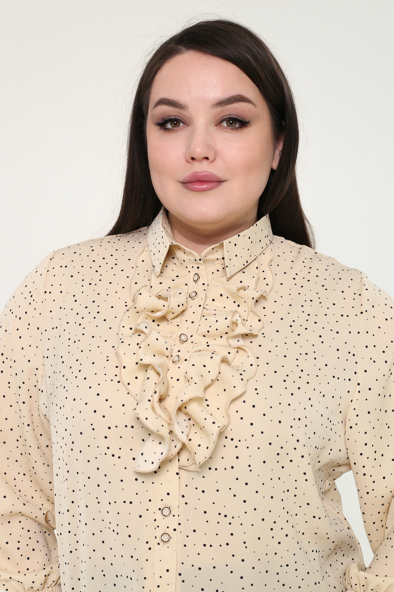 Блузка прямого силуэта — отличный выбор для тех, кто ценит простоту и утонченность. эта модель выделяется оригинальным дизайном, что делает её весьма привлекательной. рубашка застегивается спереди на элегантные пуговицы, расположенные под планкой. классический отложной воротник и длинные рукава, собранные на тонкую резинку внизу, придают модели изысканность. вытачки на груди обеспечивают идеальную посадку по фигуре. мелкий гороховый принт добавляет образу динамики, а оригинальные рюши на груди и рукавах подчеркивают женственность. свободный крой выгодно подчеркивает силуэт, а мягкий и приятный материал обеспечивает комфорт на протяжении всего дня. блузка прекрасно сочетается как с брюками, так и с юбками, что делает её универсальным элементом гардероба.
