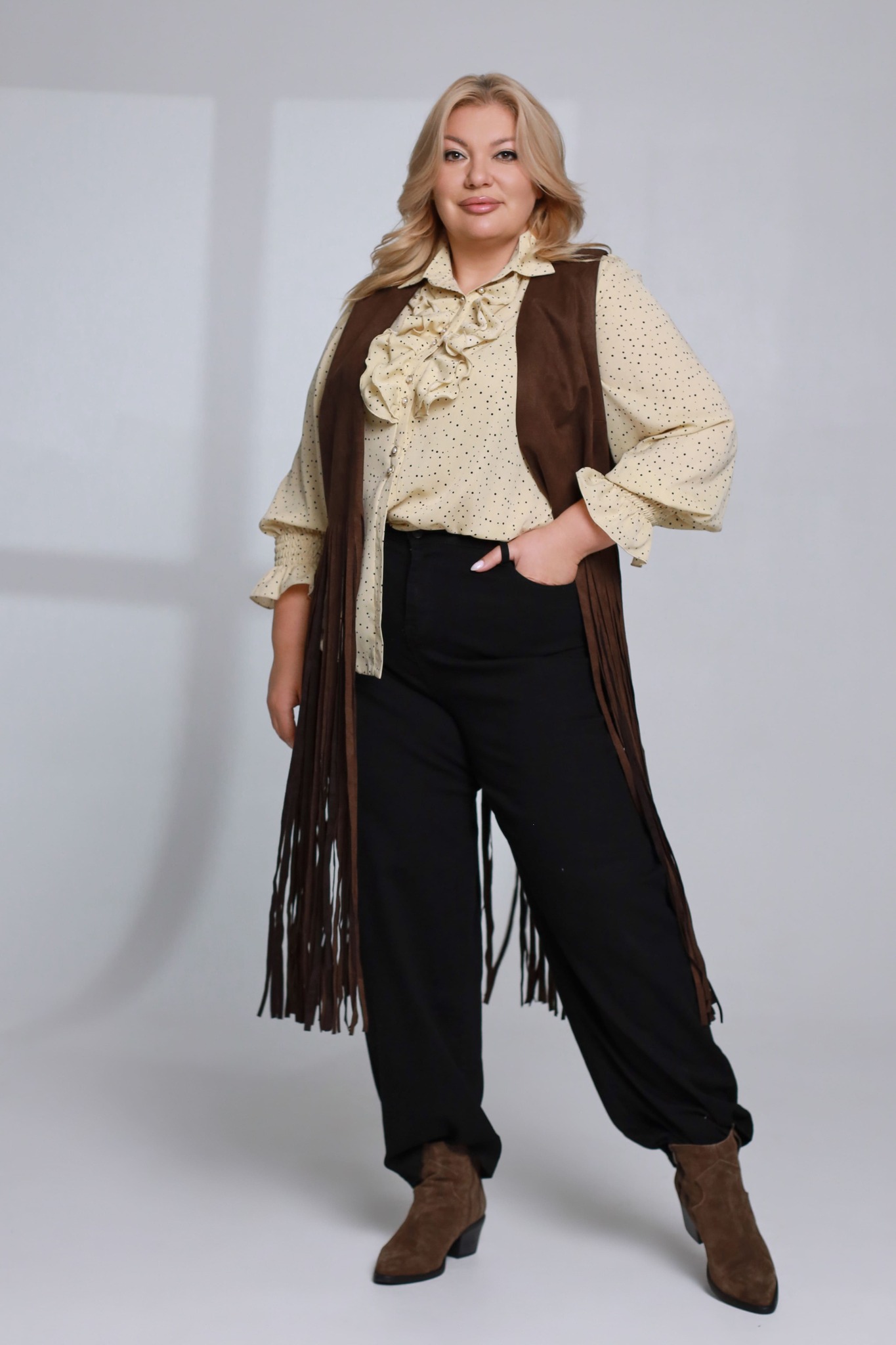 Блузка с рюшами на груди и гороховым принтом бежевая