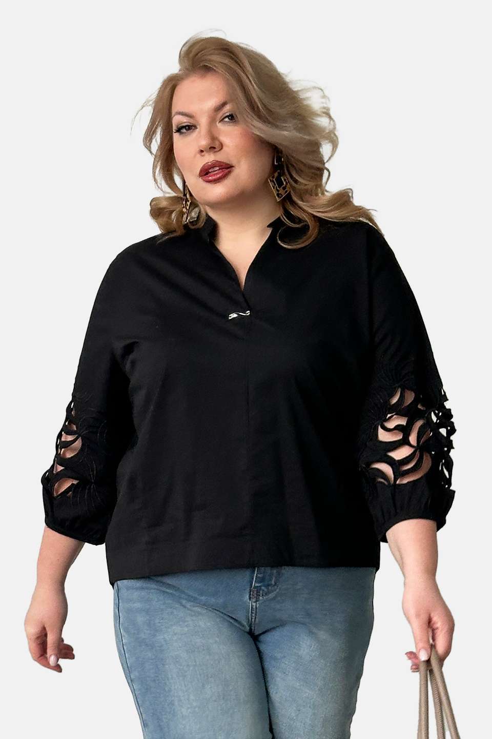 Блузка прямого кроя из мягкого материала. круглый вырез, дополненный воротом-стойкой, переходит в v-образный вырез на груди. рукава-фонарики длиной 3/4 декорированы перфорированным кружевом, что добавляет модели нарядности. вытачки на груди и удлиненная спинка способствуют оптимальной посадке по фигуре. модель застёгивается по спинке на небольшие пуговки под планку. полуприлегающий силуэт блузки искусно обыгрывает фигуру и не сковывает движений. блузка отлично сочетается как с брюками, так и с юбками.