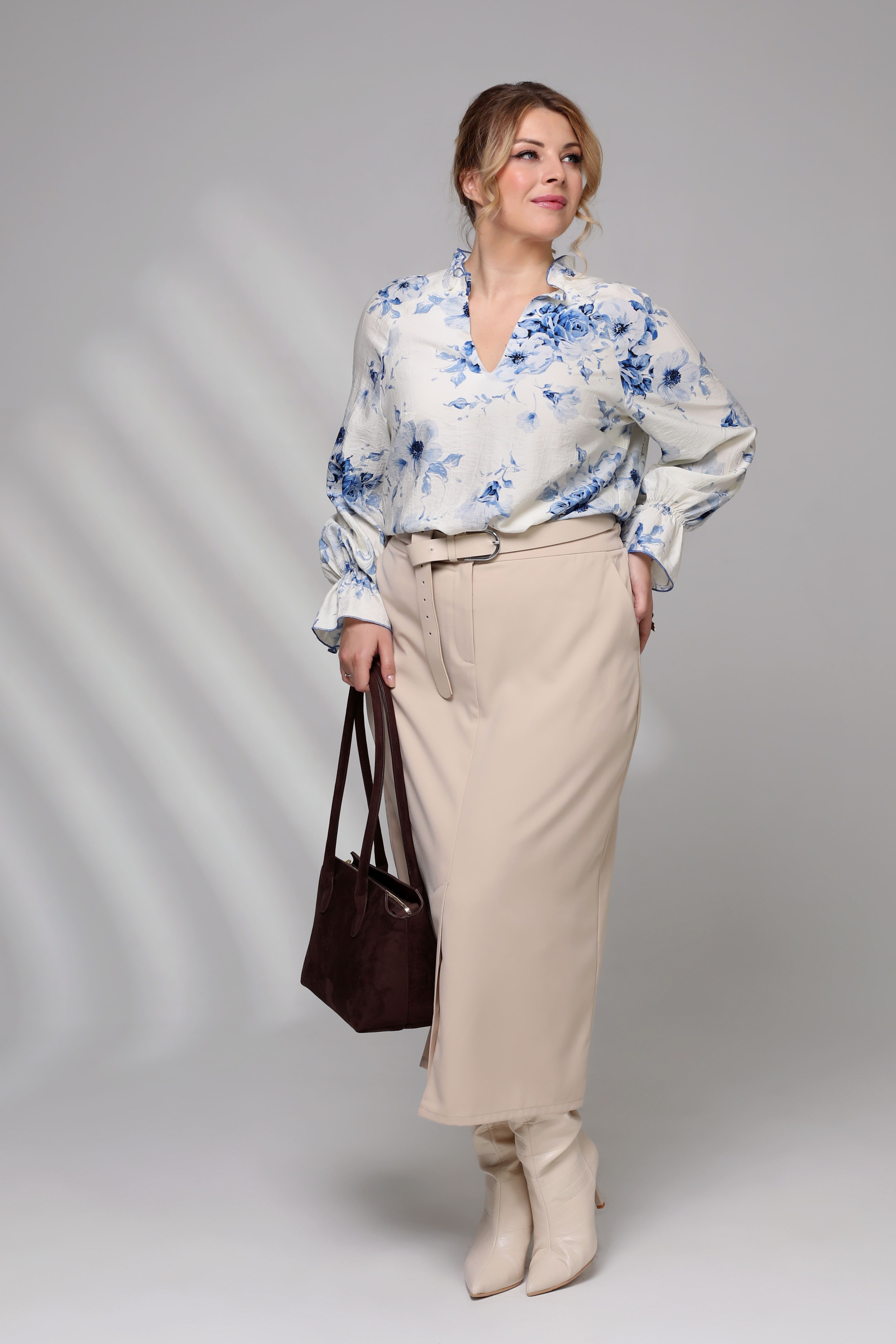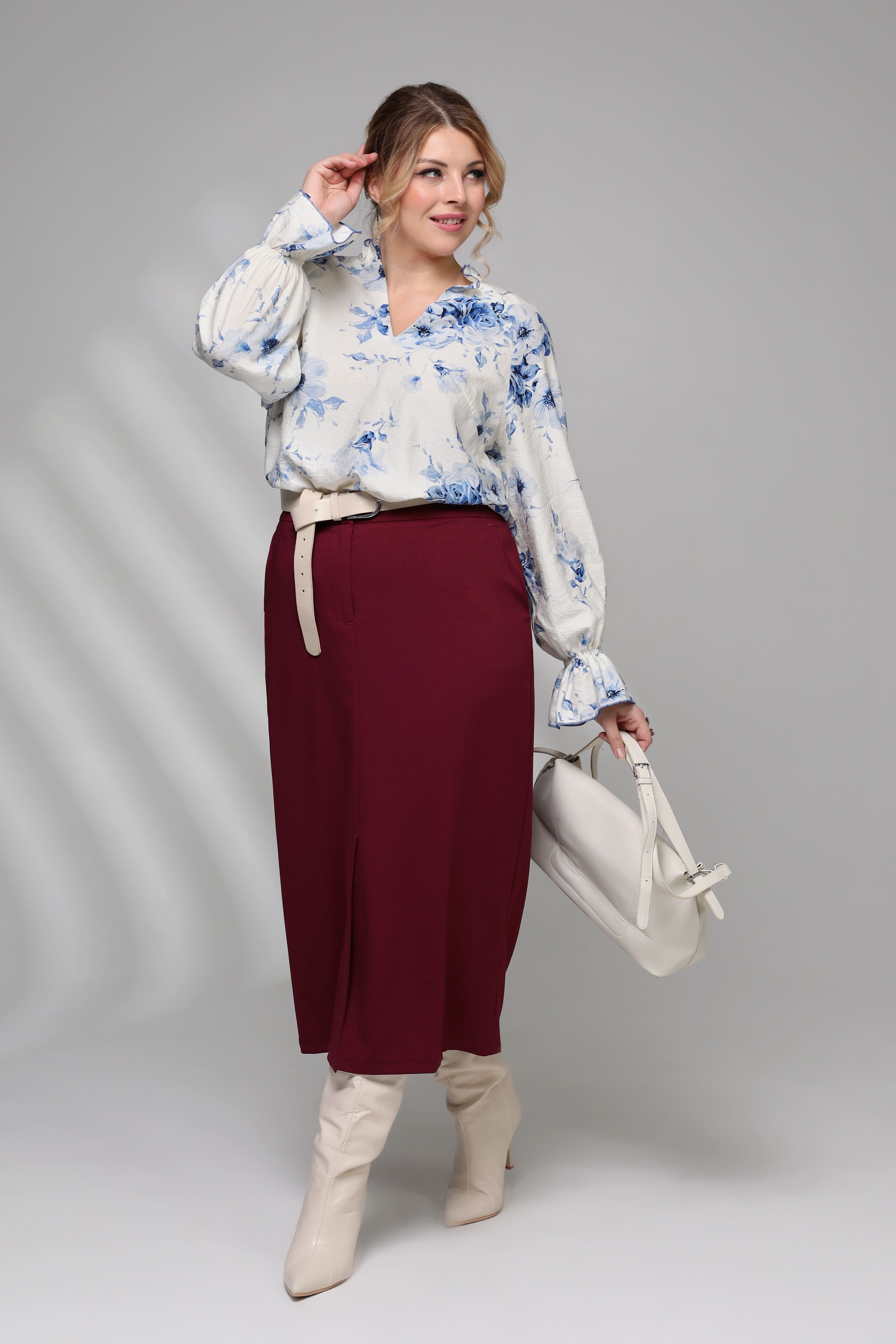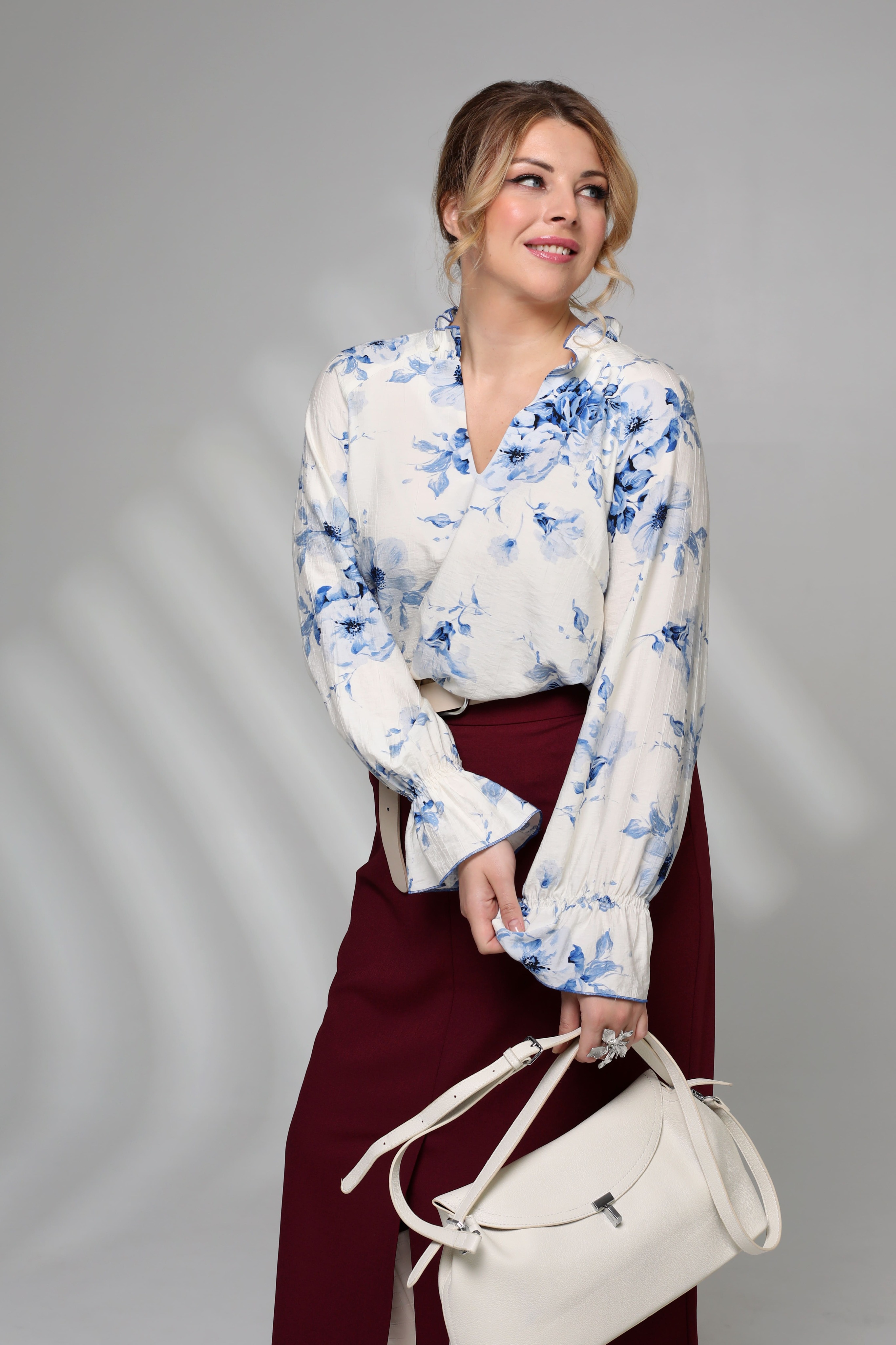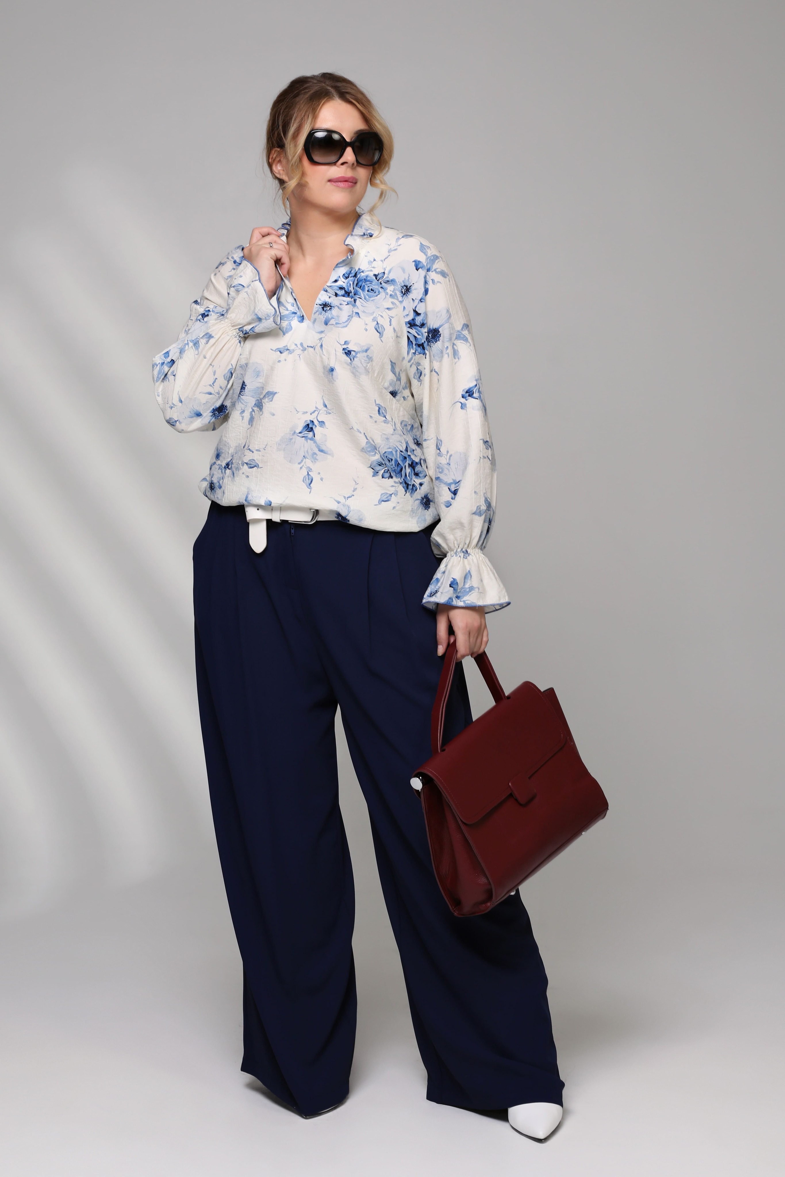 Изящная блузка, украшенная v-образным вырезом, притягивающим взгляд своей утонченностью и элегантностью. нежные рюши на воротнике добавляют образу романтичности и женственности. рукава с объемными оборками придают модели особый шарм и оригинальность. центральным элементом дизайна становятся крупные цветы насыщенного синего цвета, создающие контраст с белой основой и придающие изделию особую выразительность и стиль. эта блузка станет идеальным выбором для создания нежного, романтического образа, подчеркивающего индивидуальность и привлекательность обладательницы.