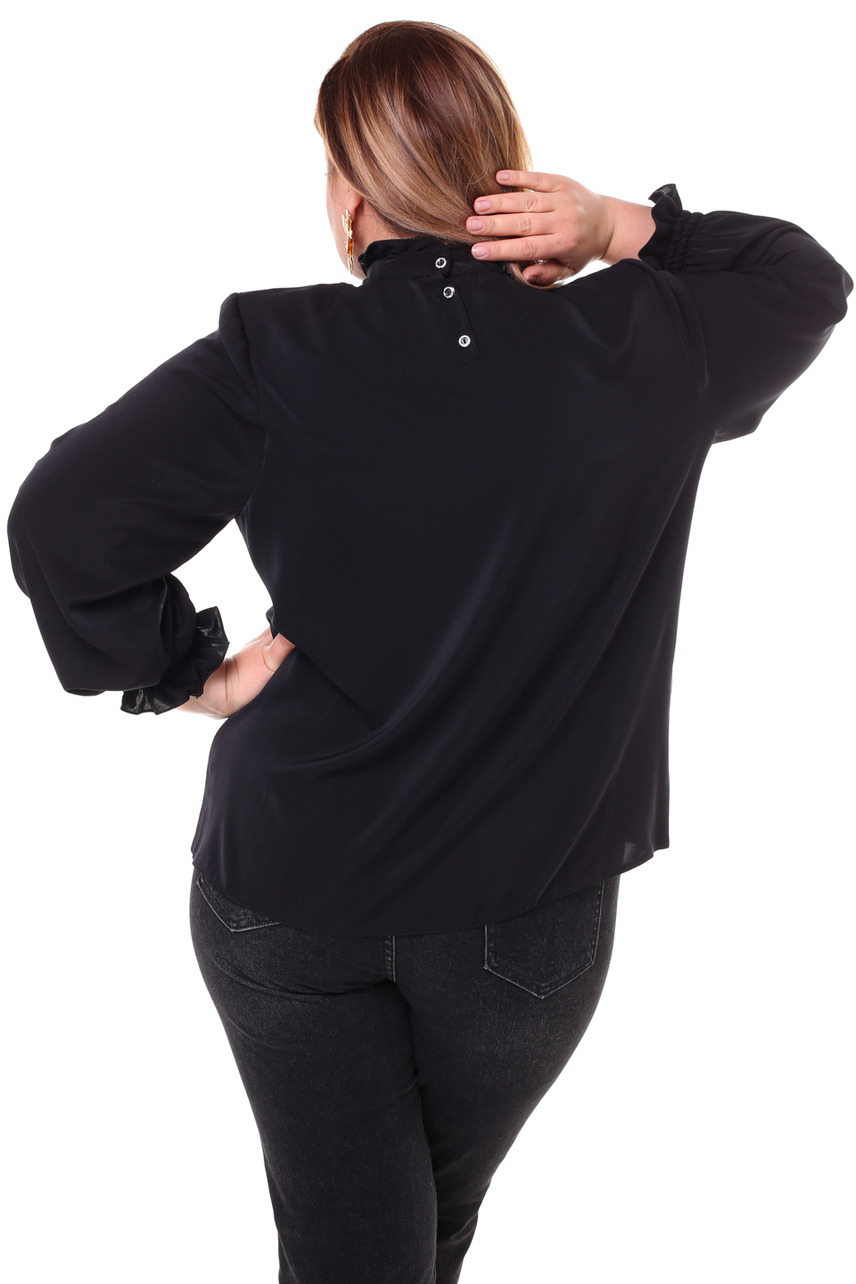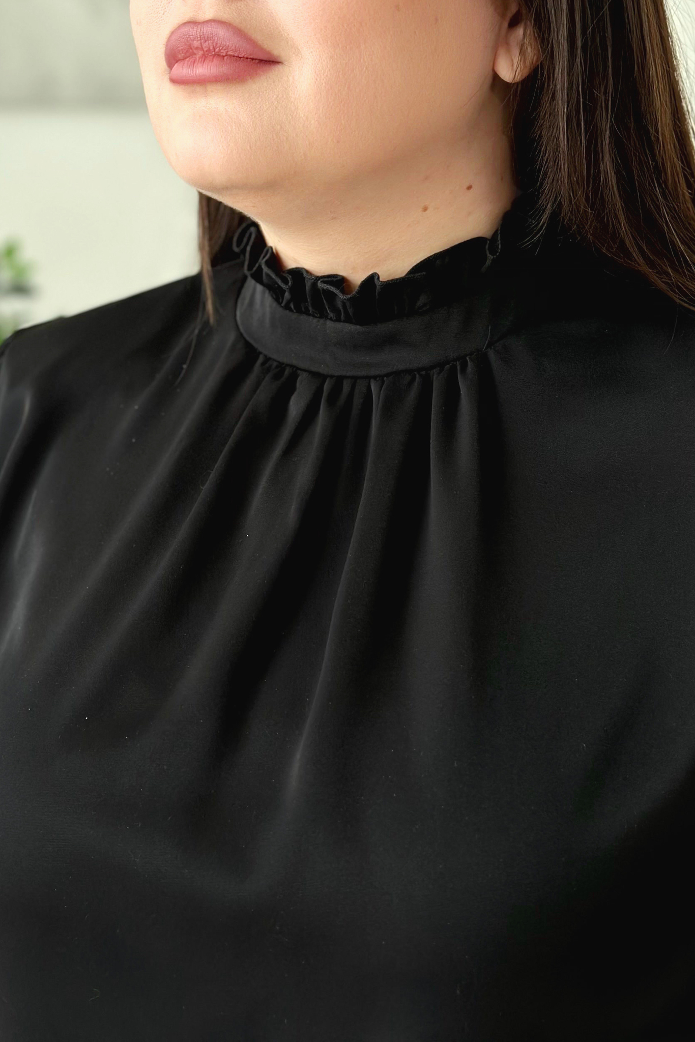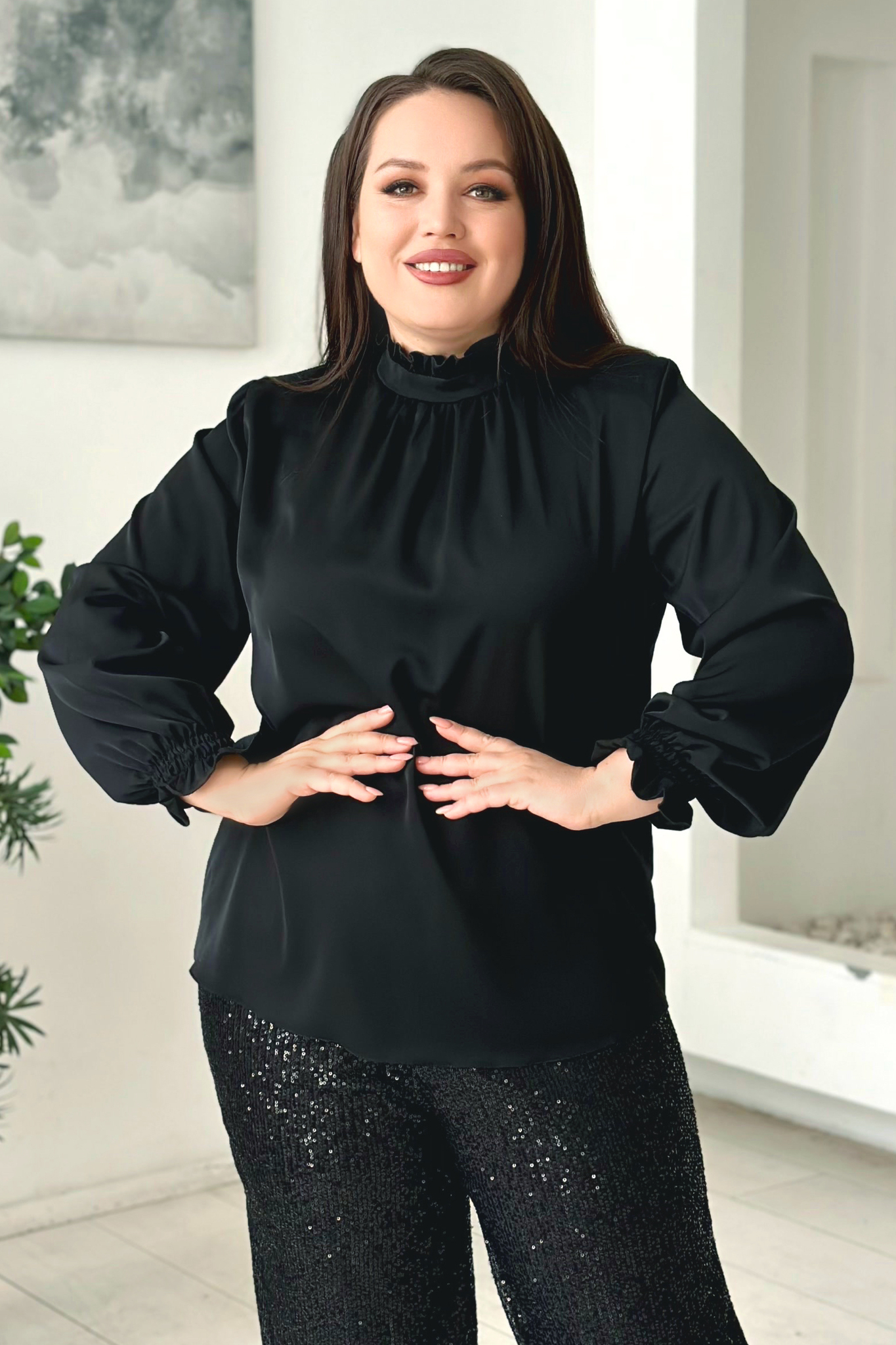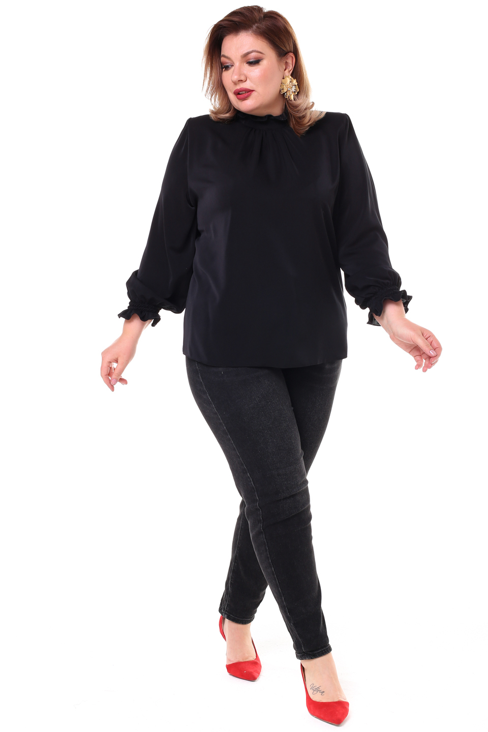 Блузка искусственный шелк "рукав фонарик" со складками на груди черная