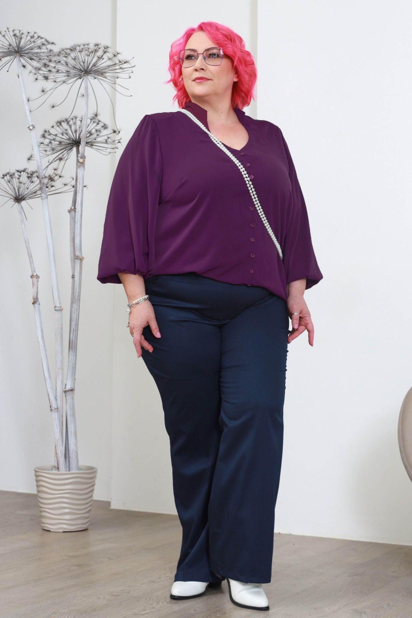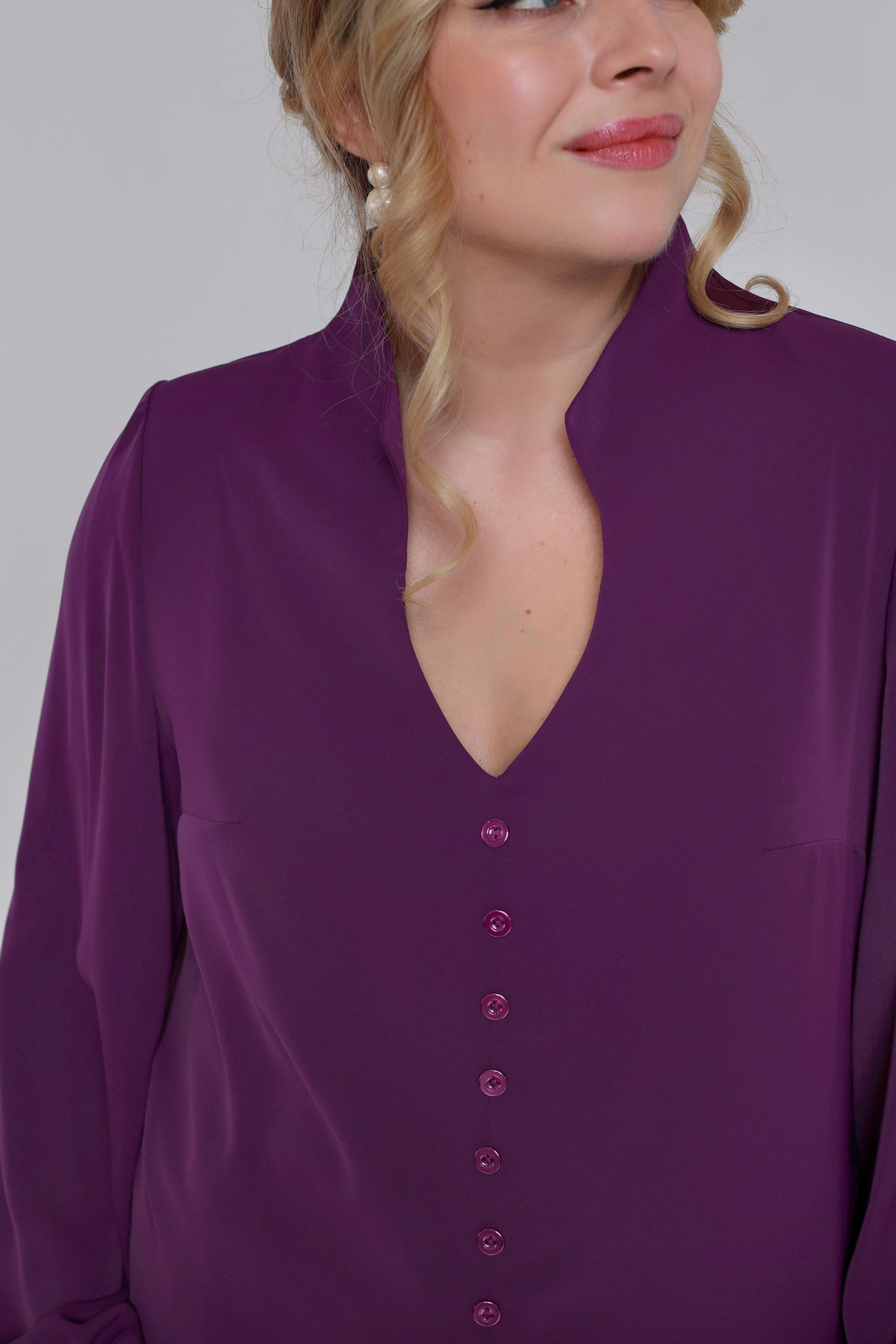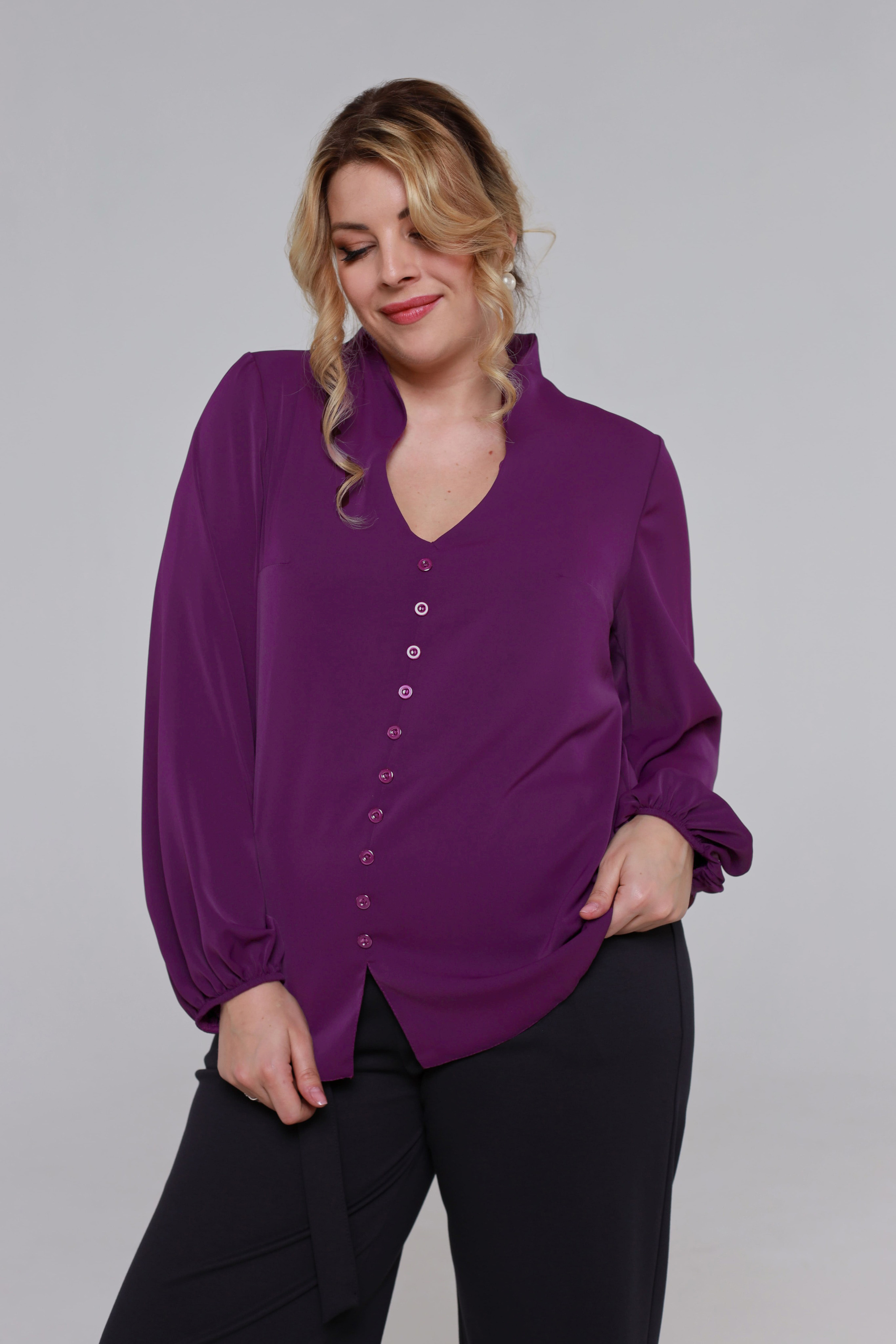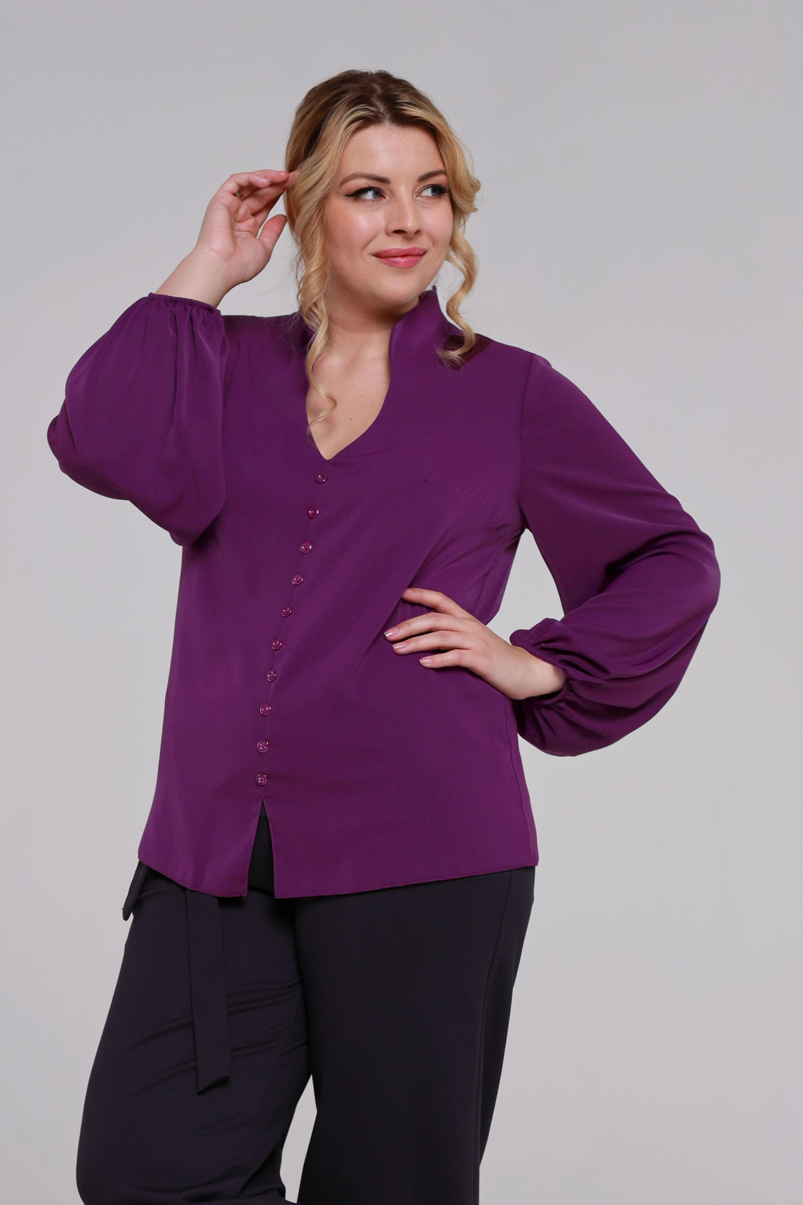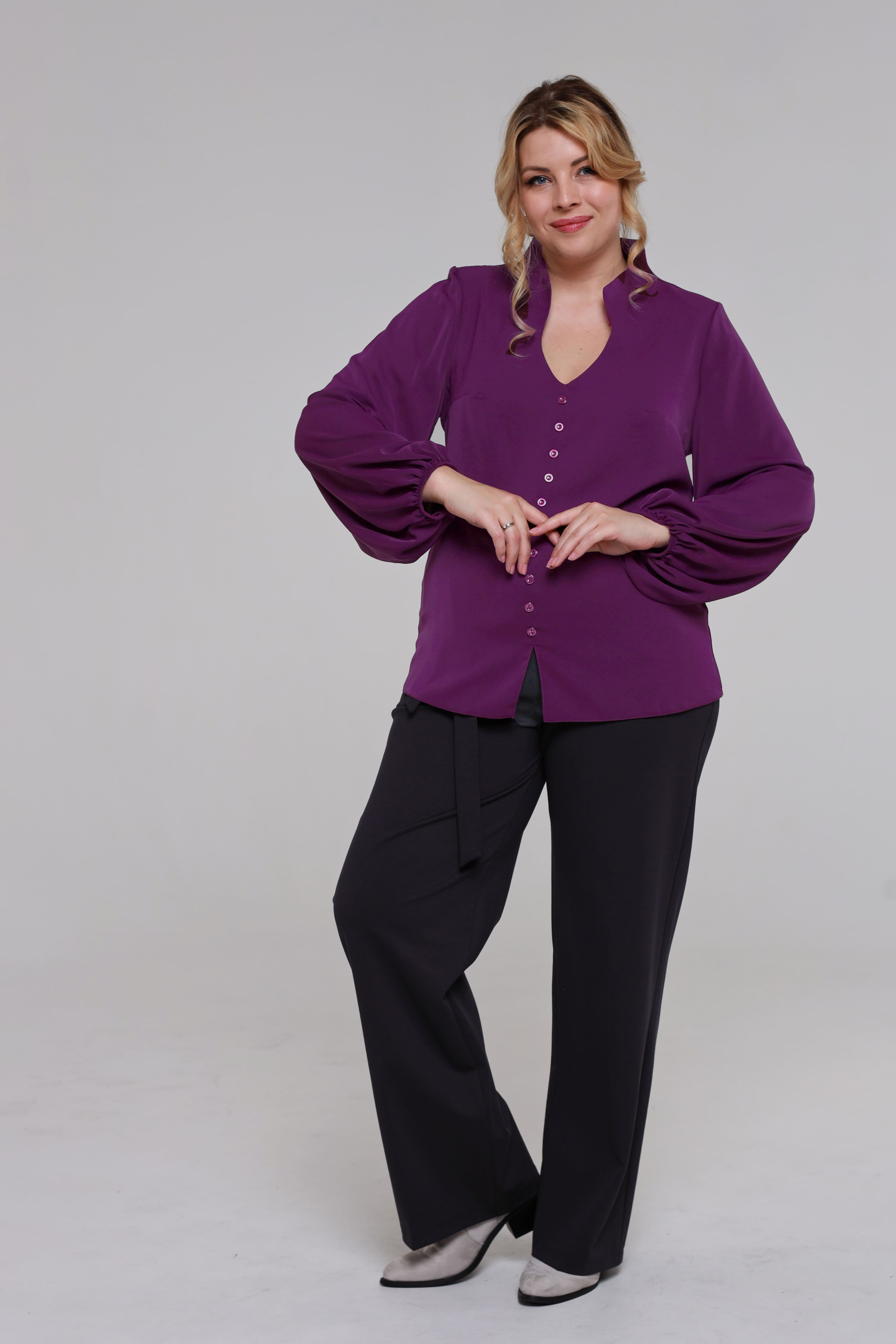 Блузка прямого кроя из мягкого струящегося материала. круглый вырез, дополненный воротом-стойкой переходит в фигурный вырез на груди. рукава полной длины по низу присобраны на эластичную резинку. вытачки на груди способствуют оптимальной посадке по фигуре. вертикальный шов, украшенный изящными пуговками, переходит по переду в небольшой разрез. полуприлегающий силуэт блузки искусно обыгрывает фигуру и не сковывает движений. отлично сочетается как с брюками, так и с юбками.