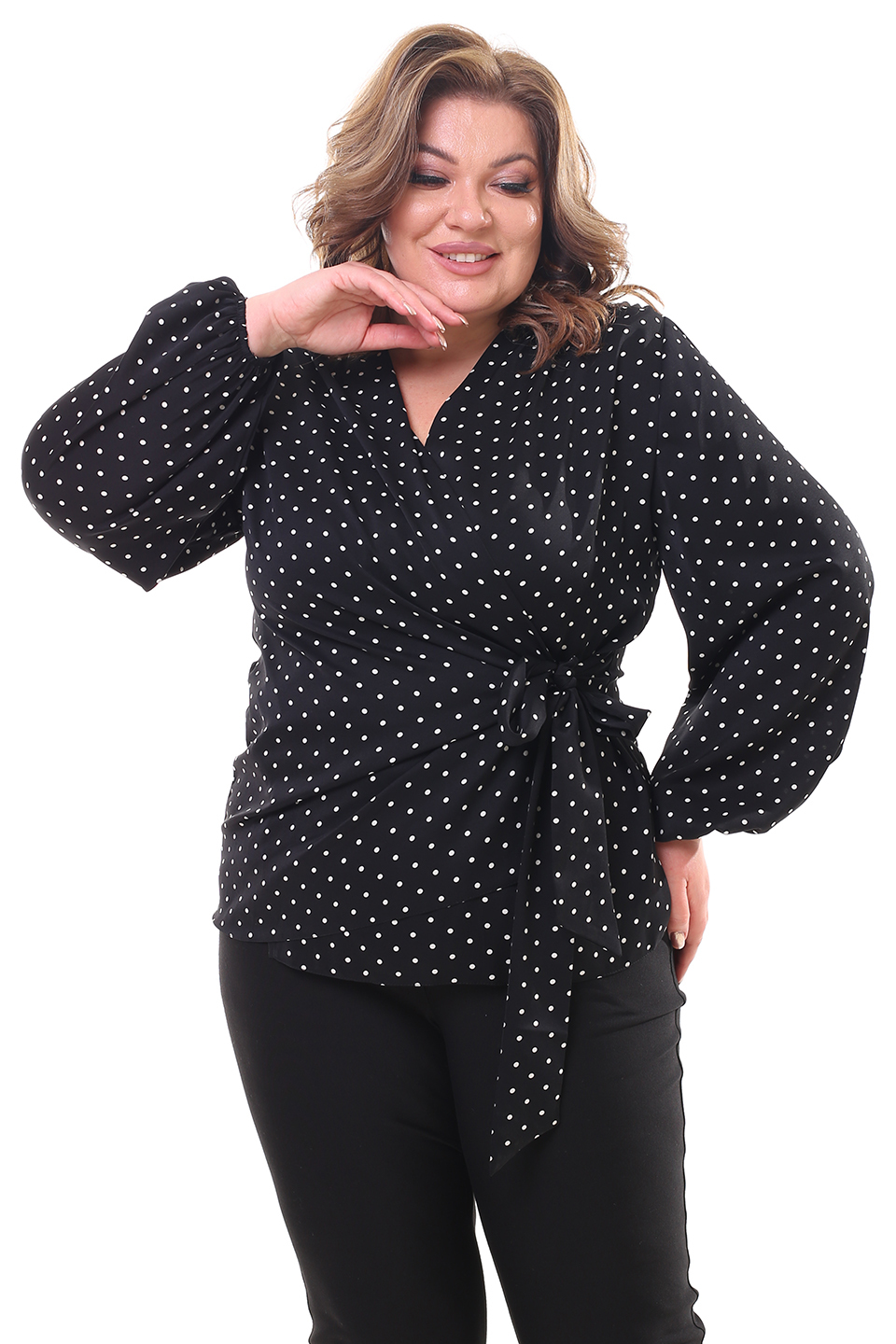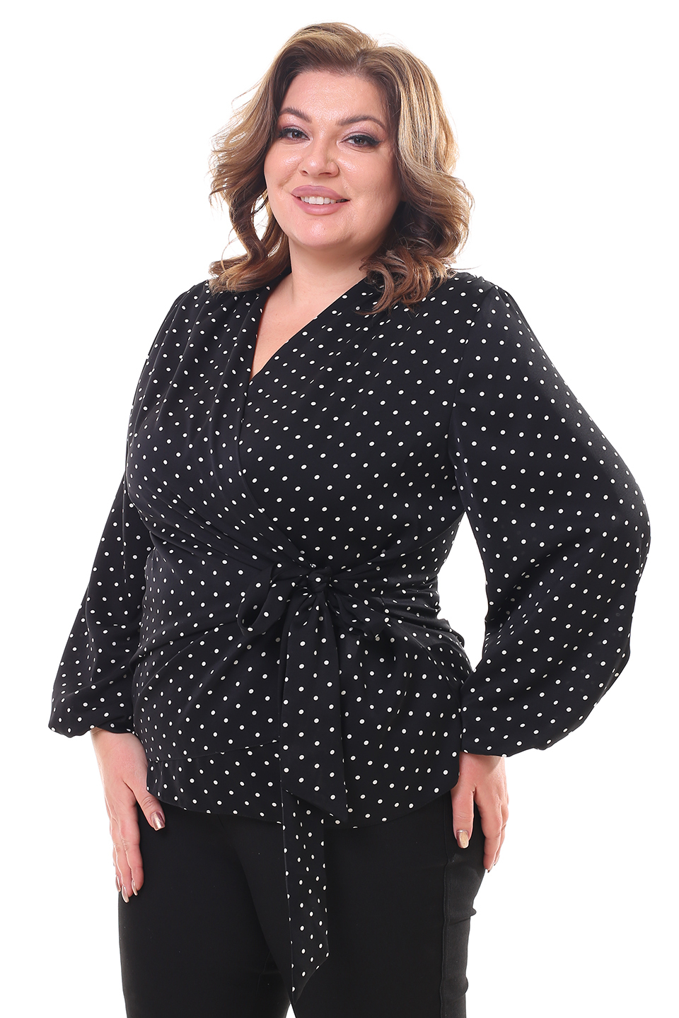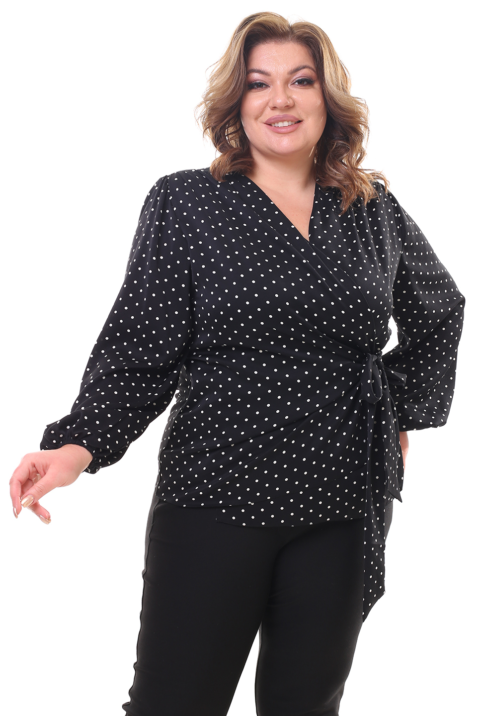 Оригинальная блузка с запахом из мягкого струящегося материала. рукава полной длины по низу присобраны тонкой резинкой. глубокий v-образный вырез добавляет женственности. небольшие складки на плечах обеспечивают оптимальную посадку по фигуре. блузка застёгивается на оригинальные завязки сбоку. актуальный гороховый принт добавляет модели динамичности и освежает образ. аккуратные подплечники зрительно вытягивают силуэт и визуально стройнят. мягкий, приятный телу материал подарит комфорт на весь день. вы можете комбинировать блузку как с юбками различной длины, так и с брюками и джинсами.