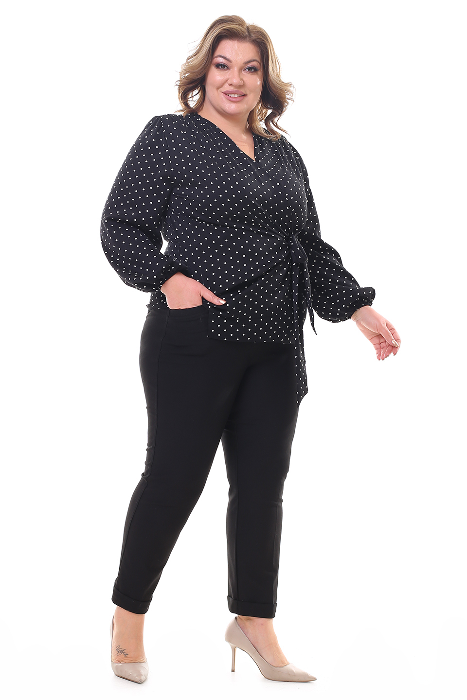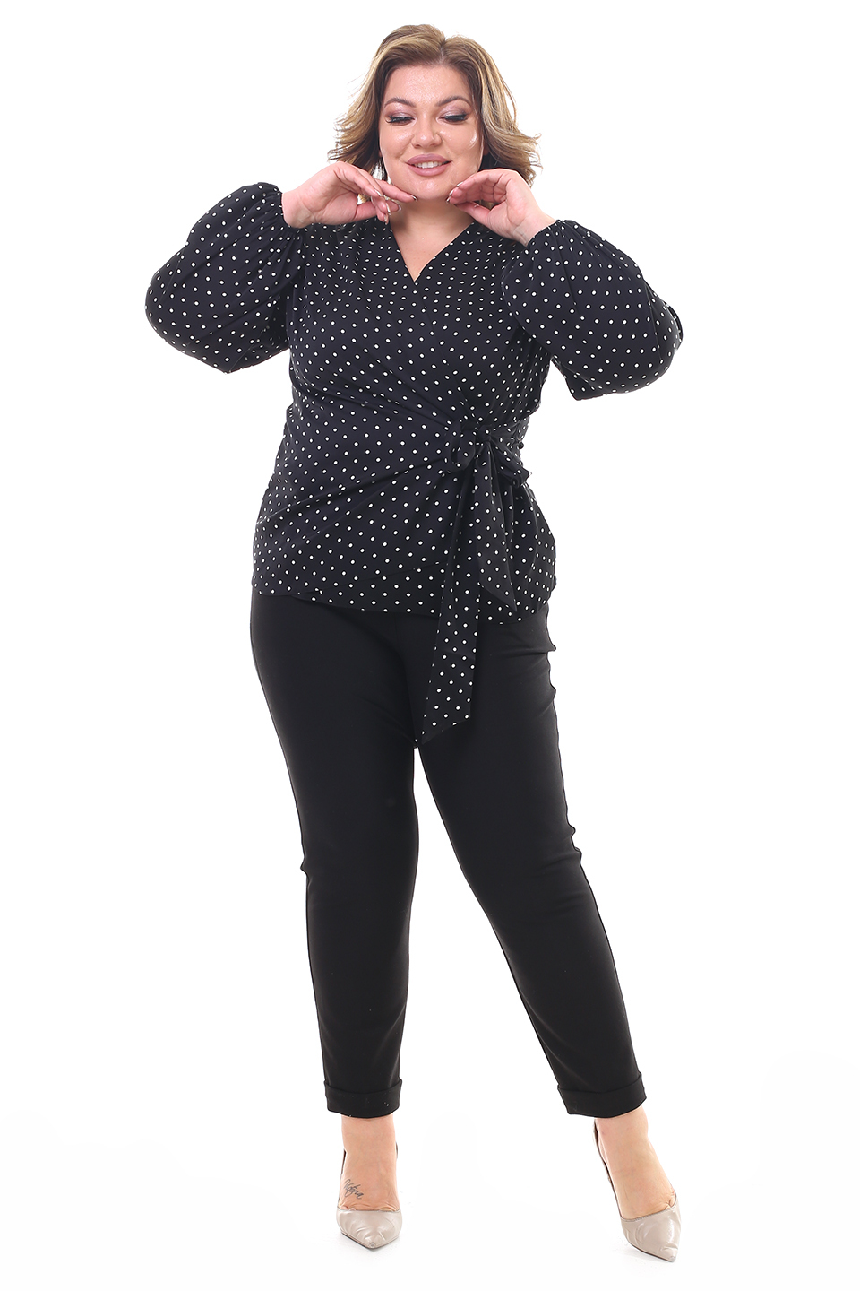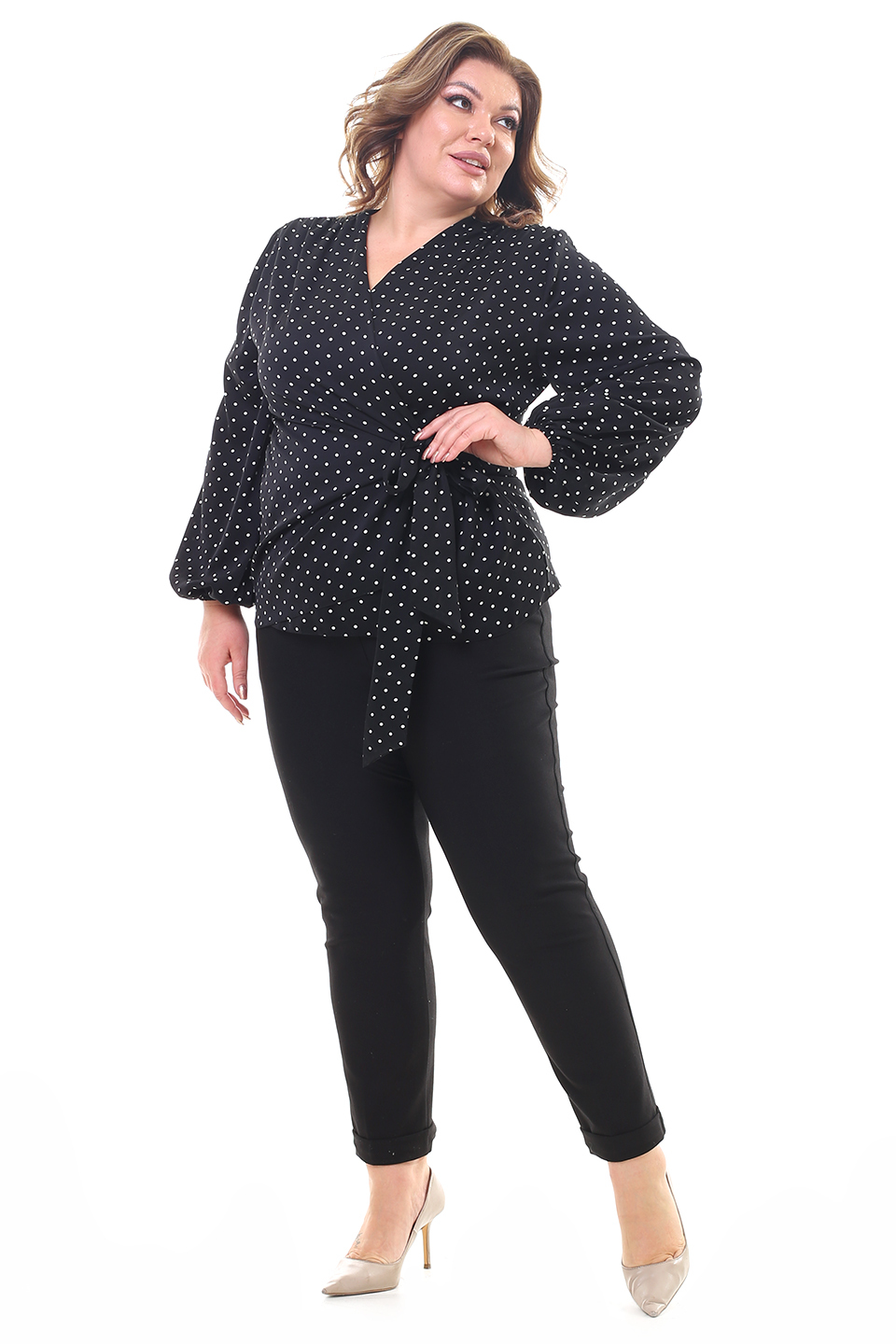 Оригинальная блузка с запахом из мягкого струящегося материала. рукава полной длины по низу присобраны тонкой резинкой. глубокий v-образный вырез добавляет женственности. небольшие складки на плечах обеспечивают оптимальную посадку по фигуре. блузка застёгивается на оригинальные завязки сбоку. актуальный гороховый принт добавляет модели динамичности и освежает образ. аккуратные подплечники зрительно вытягивают силуэт и визуально стройнят. мягкий, приятный телу материал подарит комфорт на весь день. вы можете комбинировать блузку как с юбками различной длины, так и с брюками и джинсами.