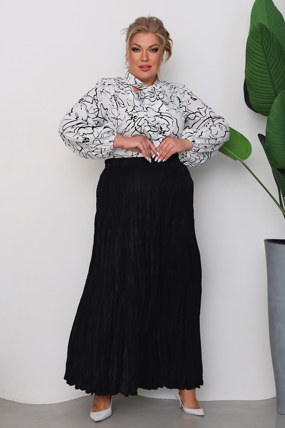 Оригинальная блузка из мягкого струящегося материала. рукава полной длины по низу присобраны тонкой резинкой. женственный v-образный вырез дополнен лентами-завязками, которые можно красиво завязать на шее. небольшие складки на плечах обеспечивают оптимальную посадку по фигуре. актуальный принт добавляет модели динамичности и освежает образ. аккуратные подплечники зрительно вытягивают силуэт и визуально стройнят. мягкий, приятный телу материал подарит комфорт на весь день. вы можете комбинировать блузку как с юбками различной длины, так и с брюками и джинсами.