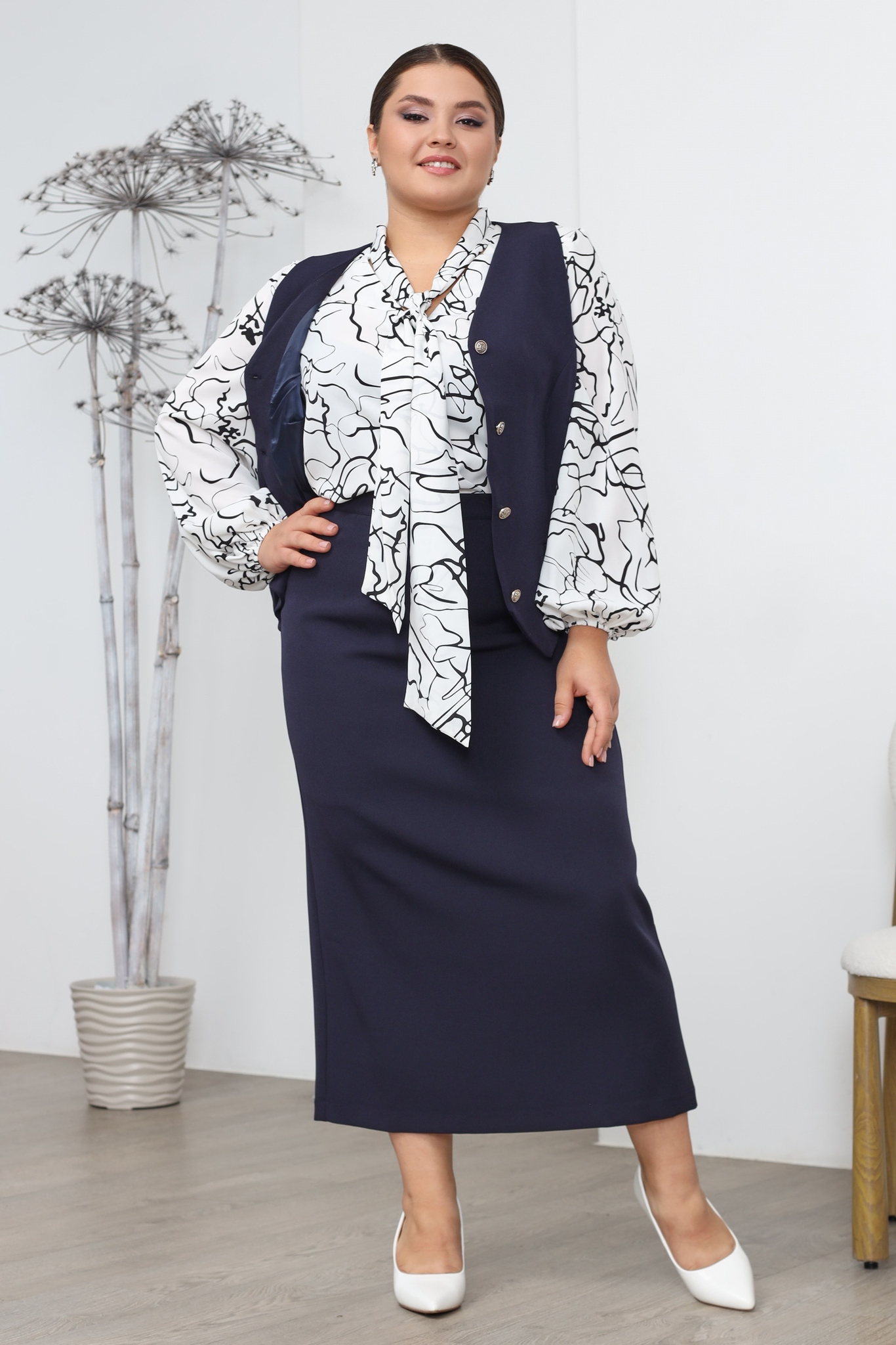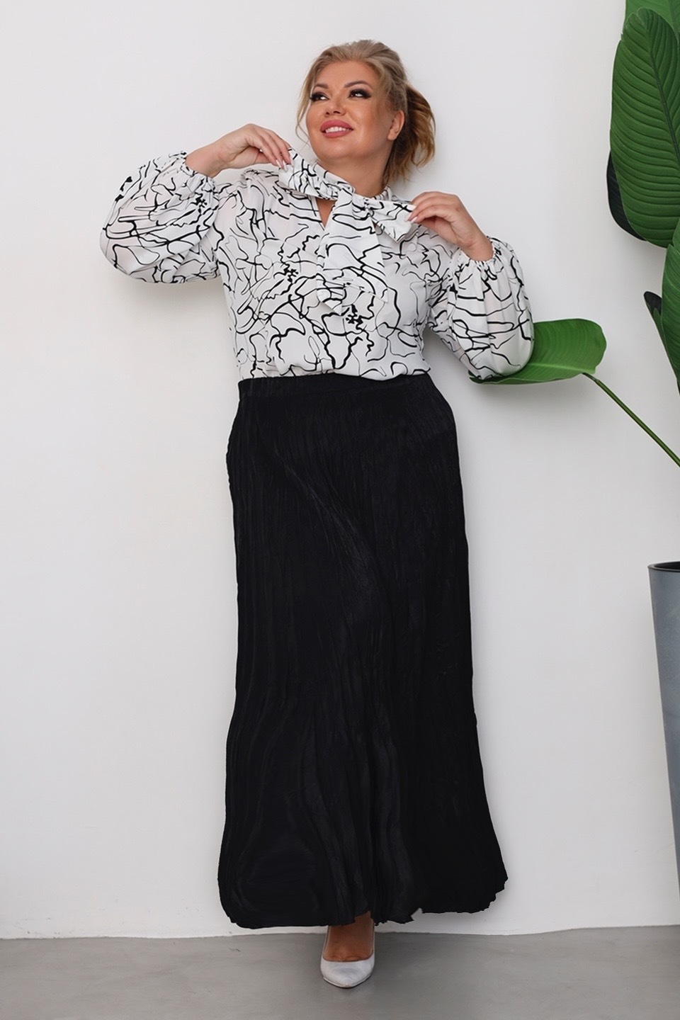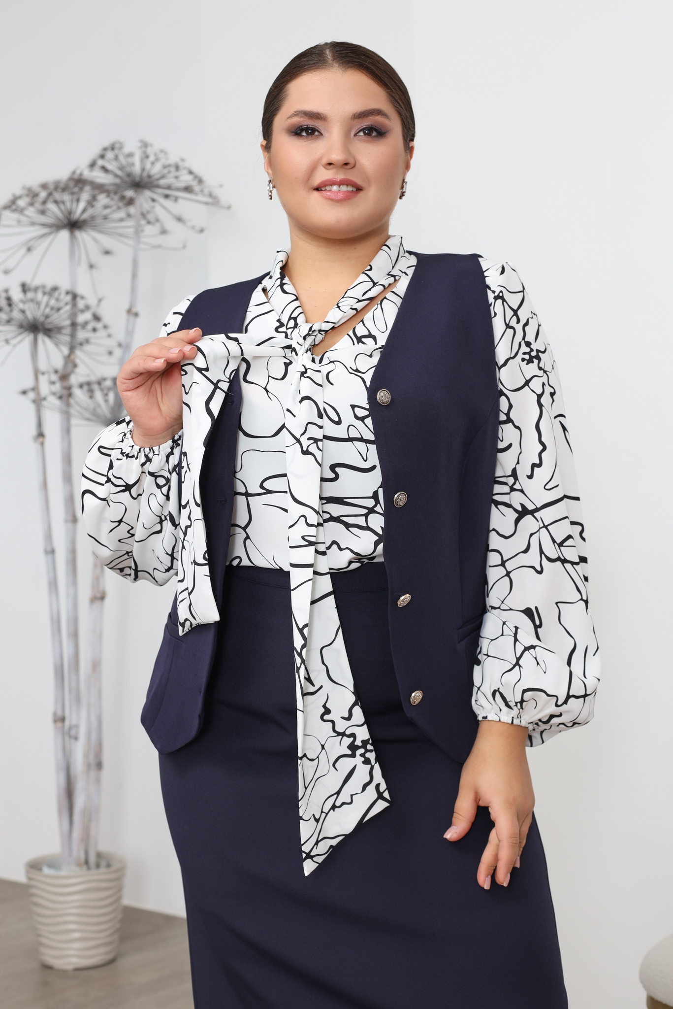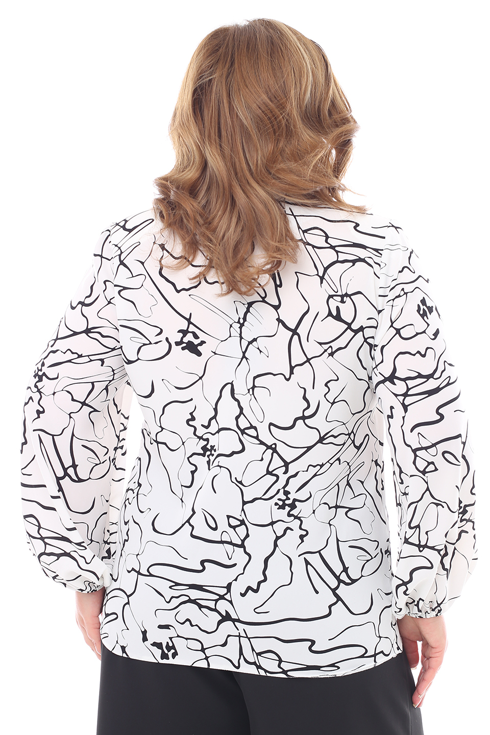 Блузка "v-вырез" с завязкой на вороте черные линии белая