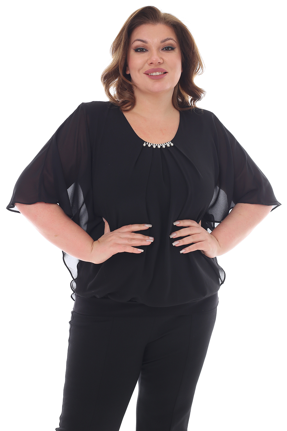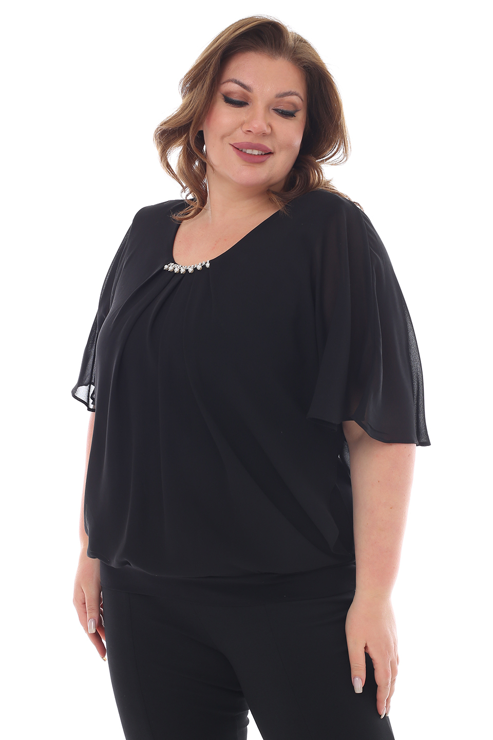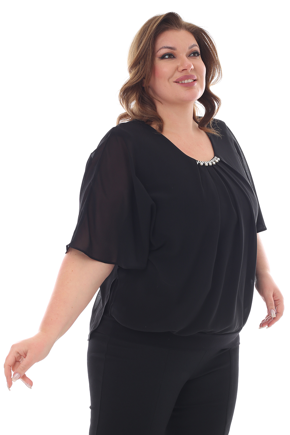Блузка свободного кроя из мягкого шифона на эластичной подкладе. круглый вырез на груди декорирован небольшими складками и стразами, что добавляет образу блеска и изящества. прозрачные шифоновые рукава придают воздушности и лёгкости. свободный силуэт искусно обыгрывает фигуру и не сковывает движений. притачная резинка по низу способствует оптимальной посадке по фигуре. модель легко сочетается с любым низом, поэтому скомбинировать чудесный и стильный образ с юбками, легинсами, брюками не составит труда.