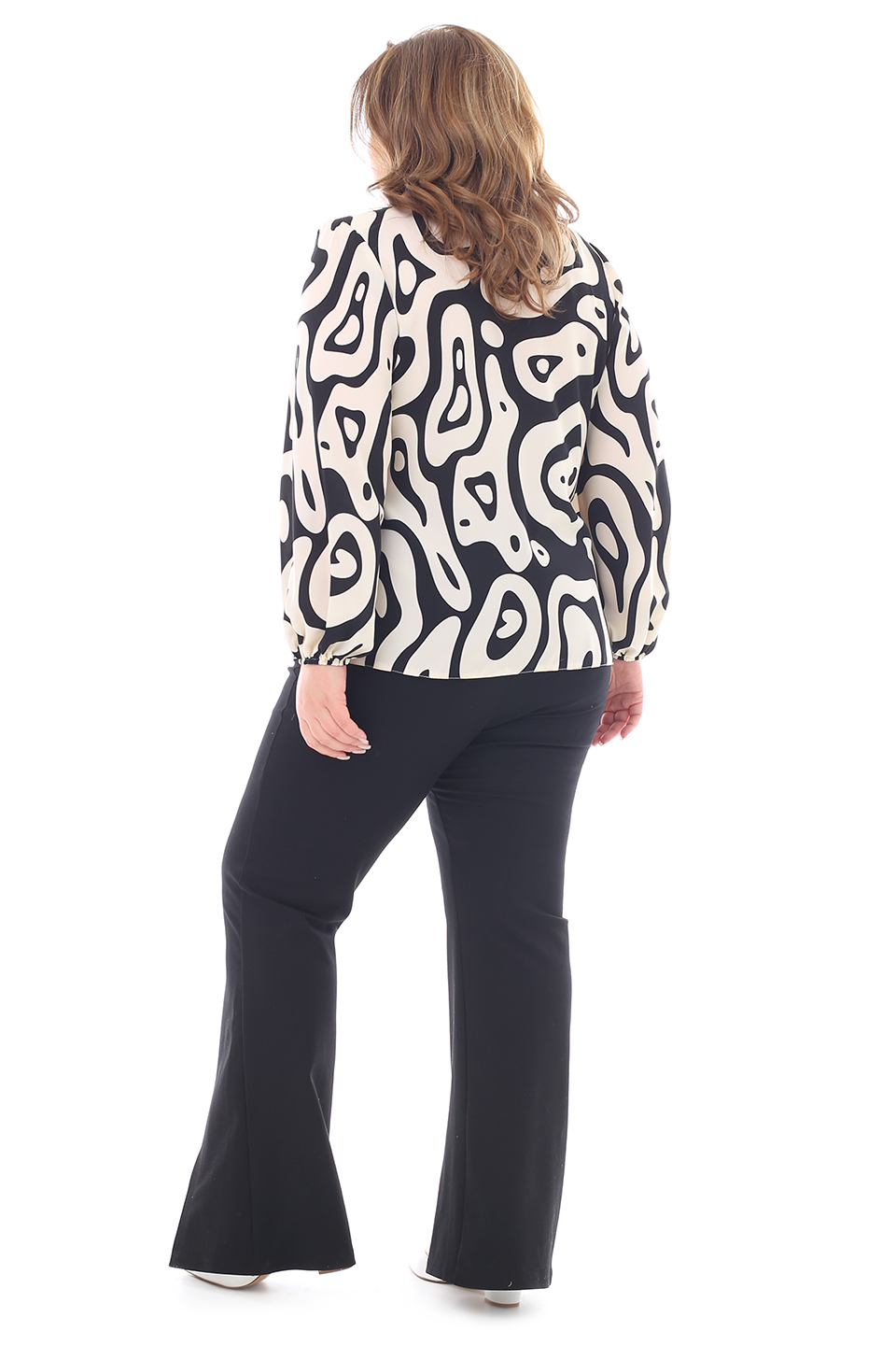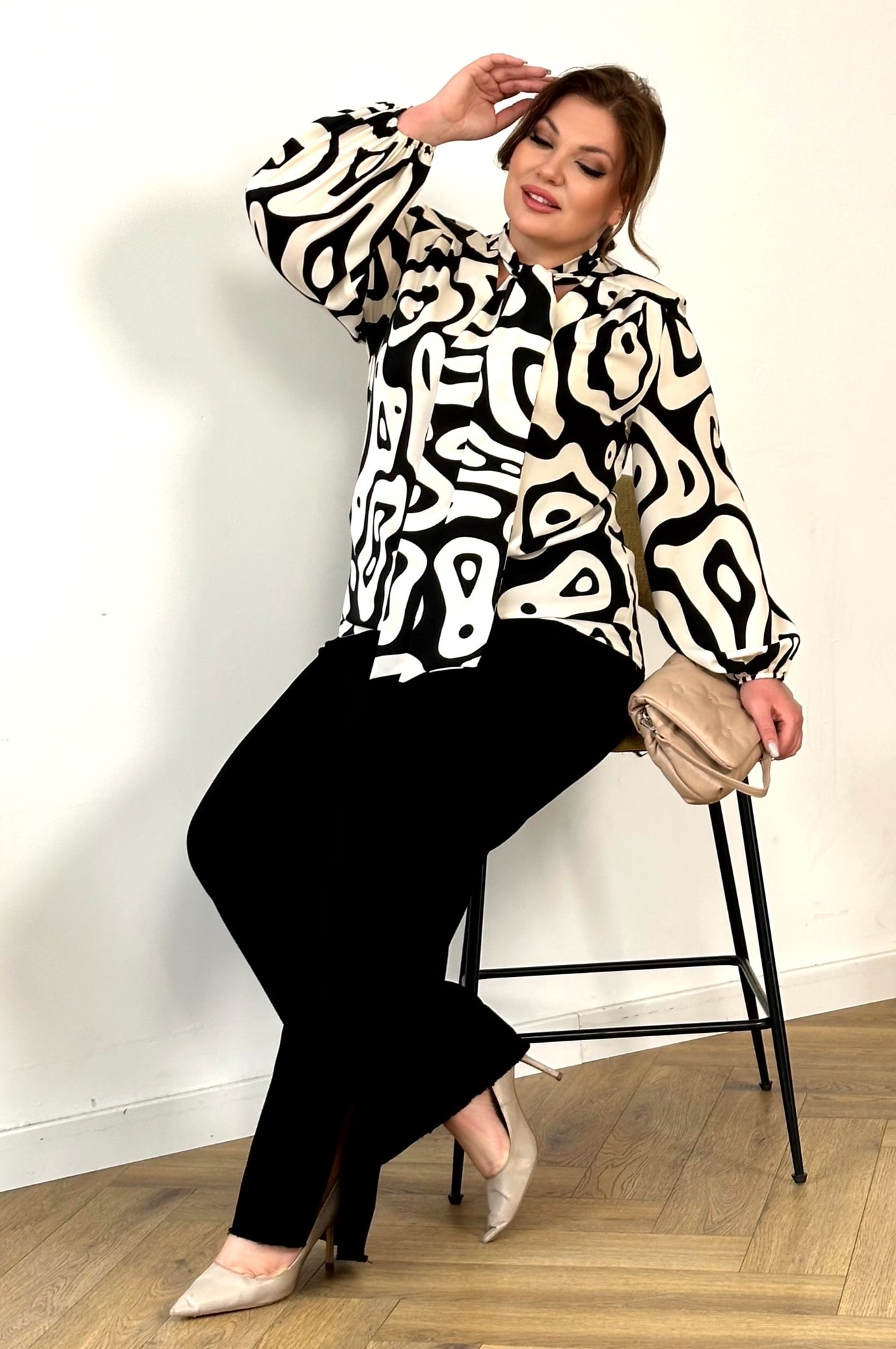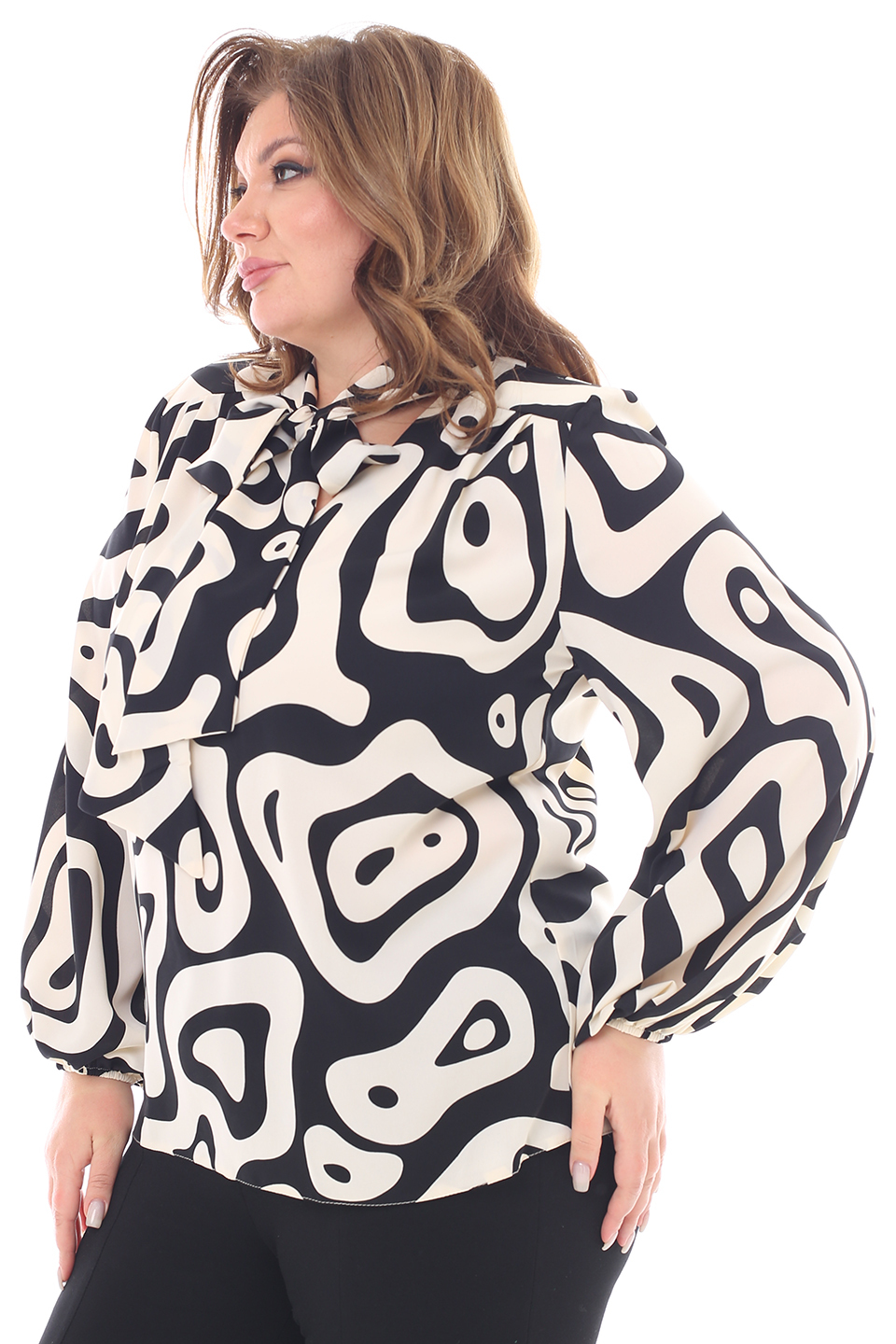 Блузка "v-вырез" с завязкой на вороте черные линии бежевое