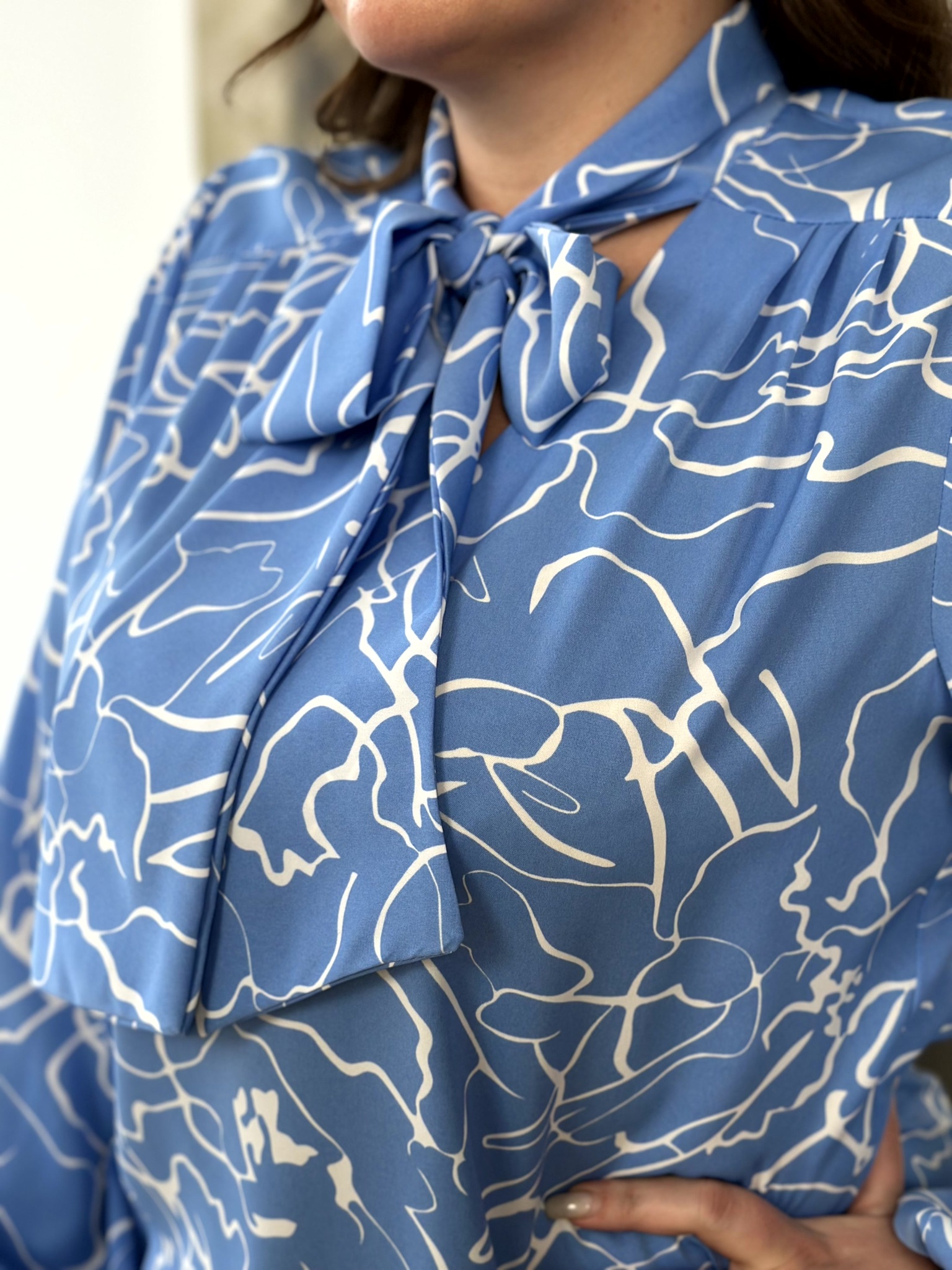 Блузка "v-вырез" с завязкой на вороте белые линии голубое